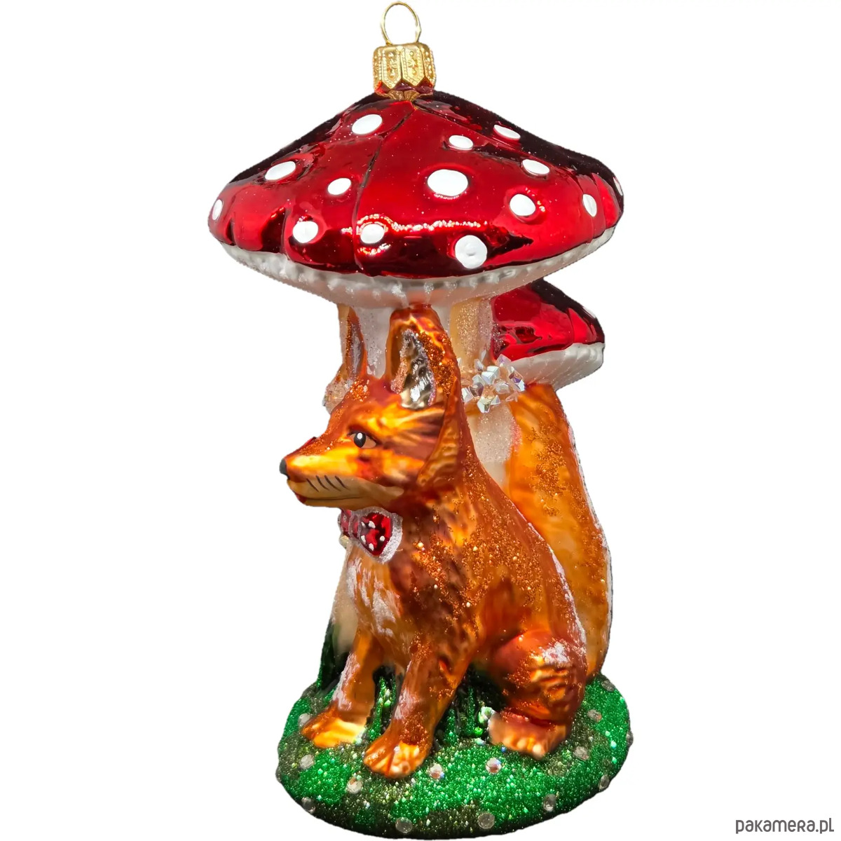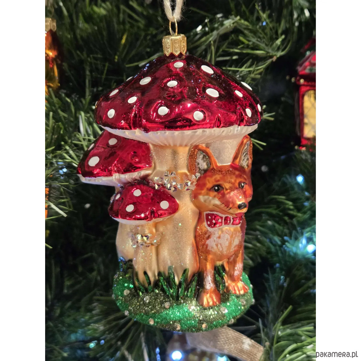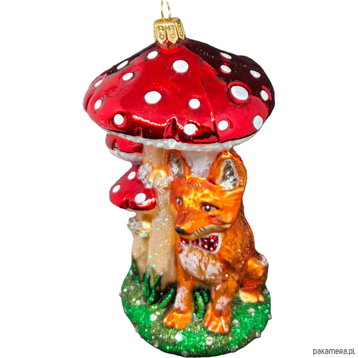 Ręcznie malowana szklana bombka lisek pod muchomorem