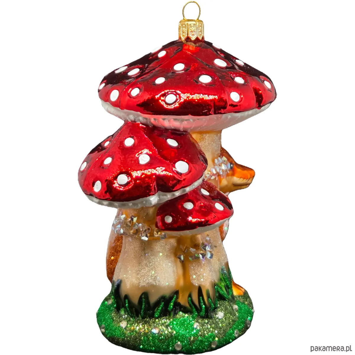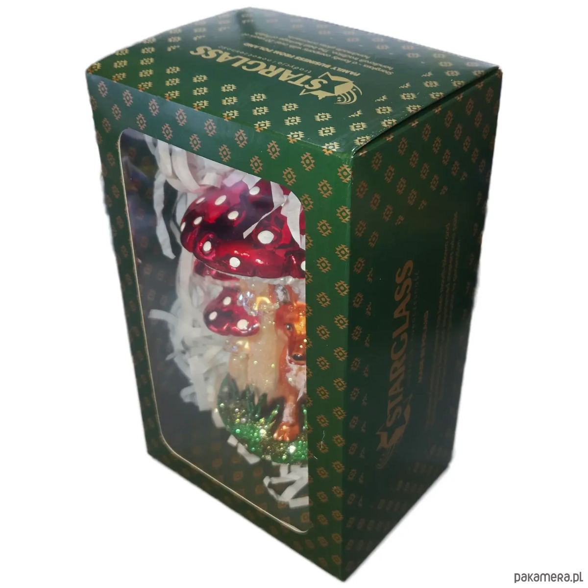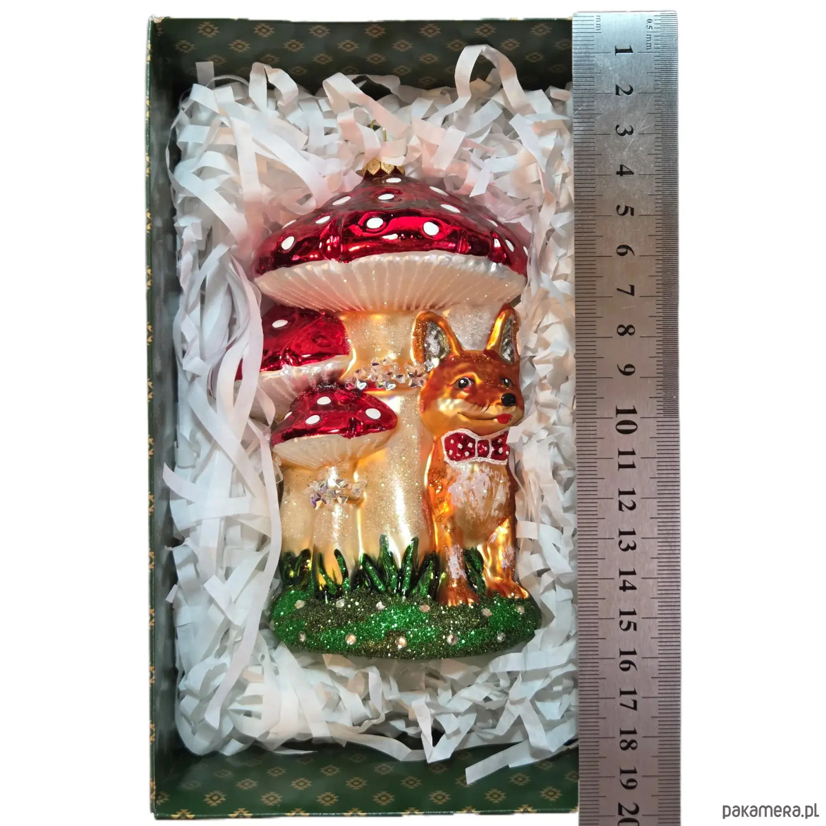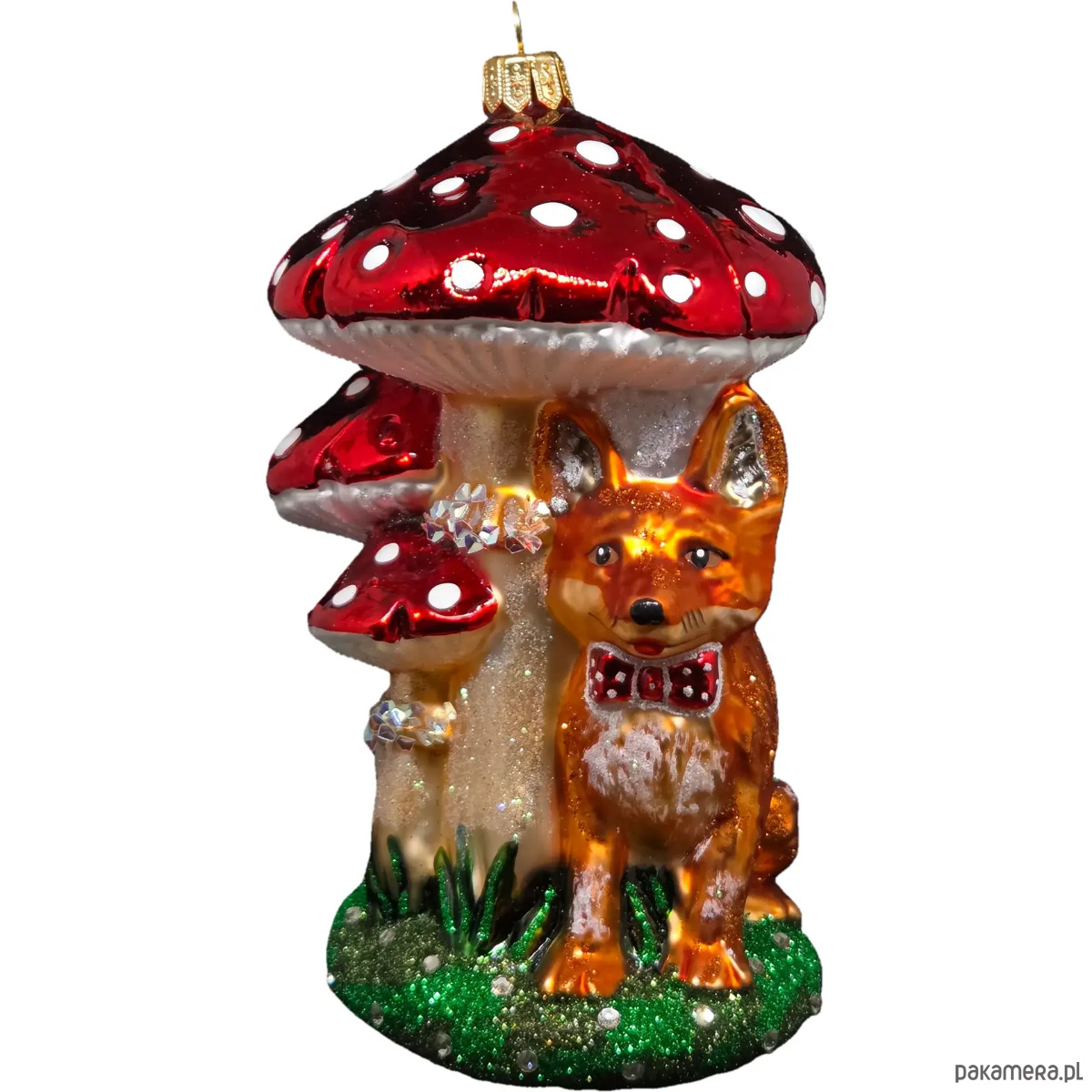 Ręcznie malowana szklana bombka lisek pod muchomorem