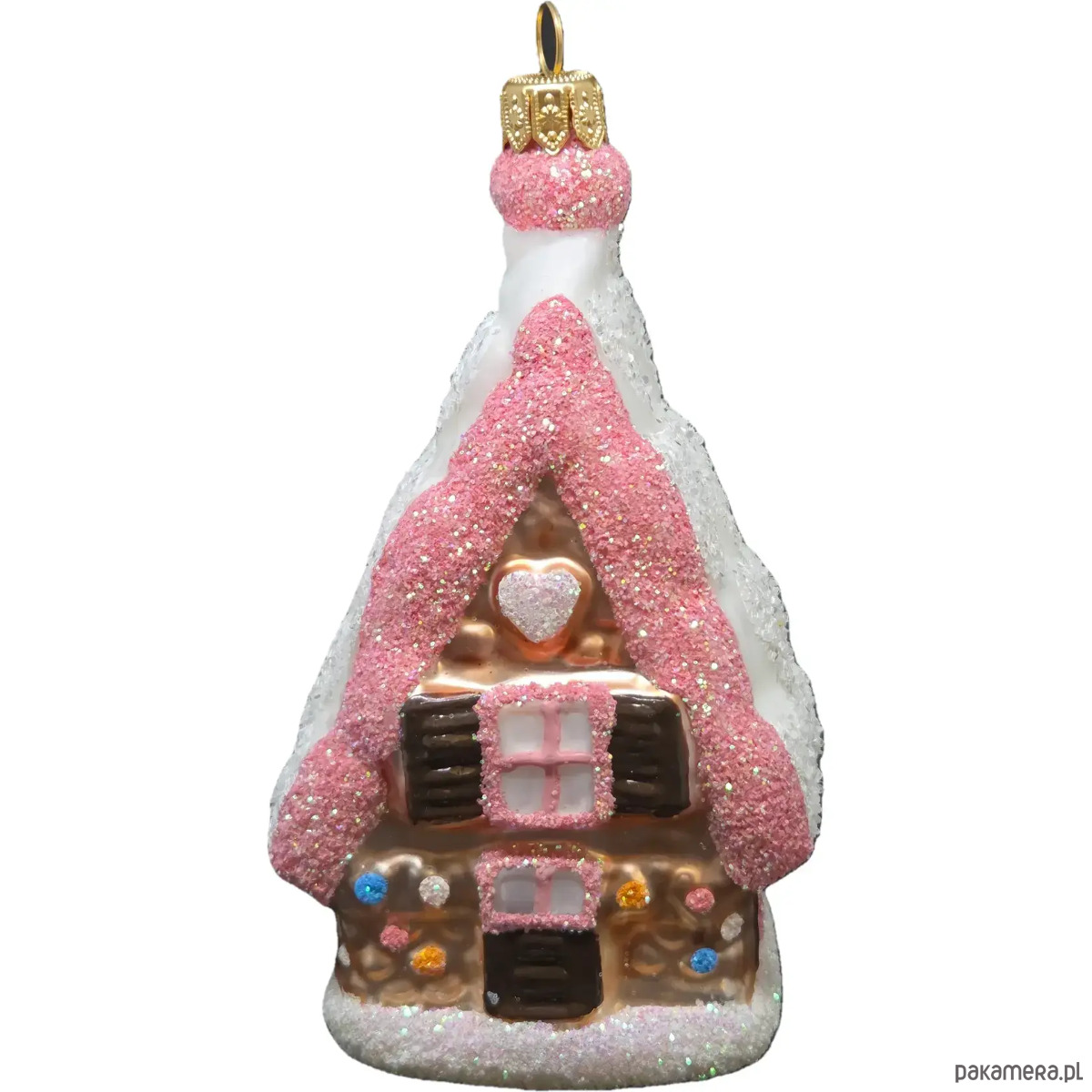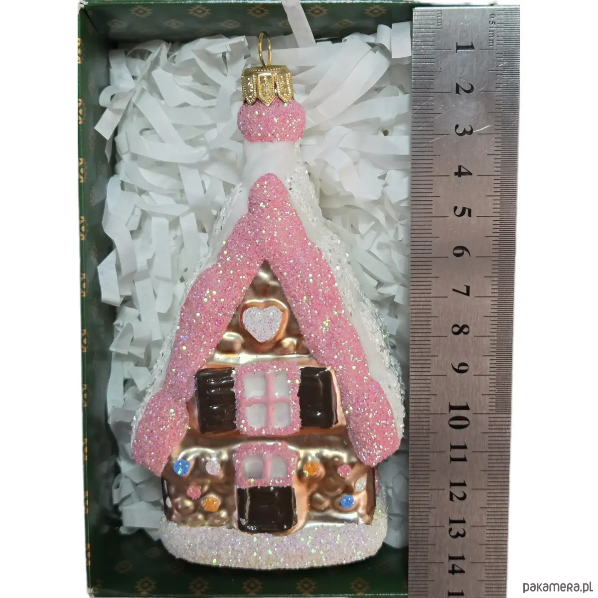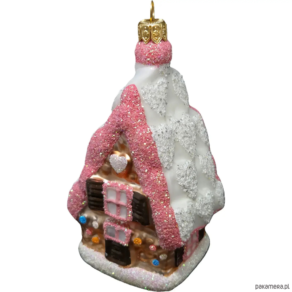 Ręcznie Malowana Szklana Bombka Biało-Różowy Domek Piernikowy