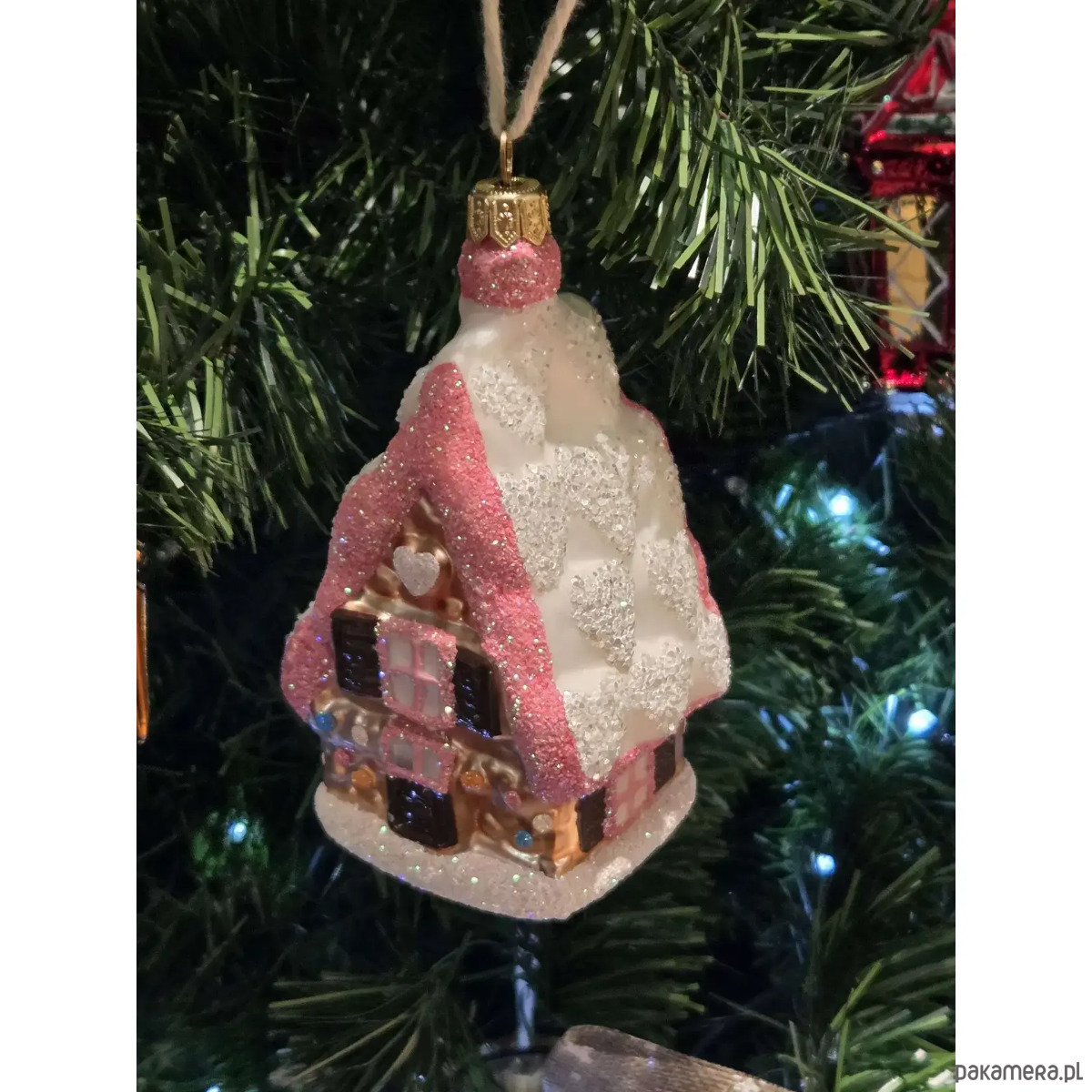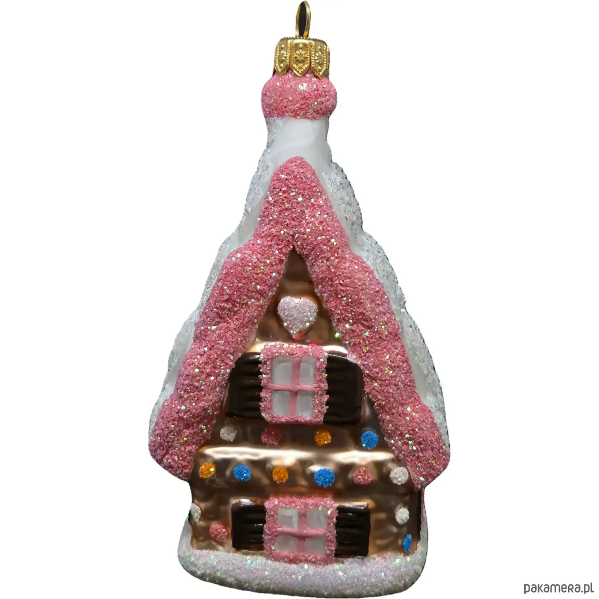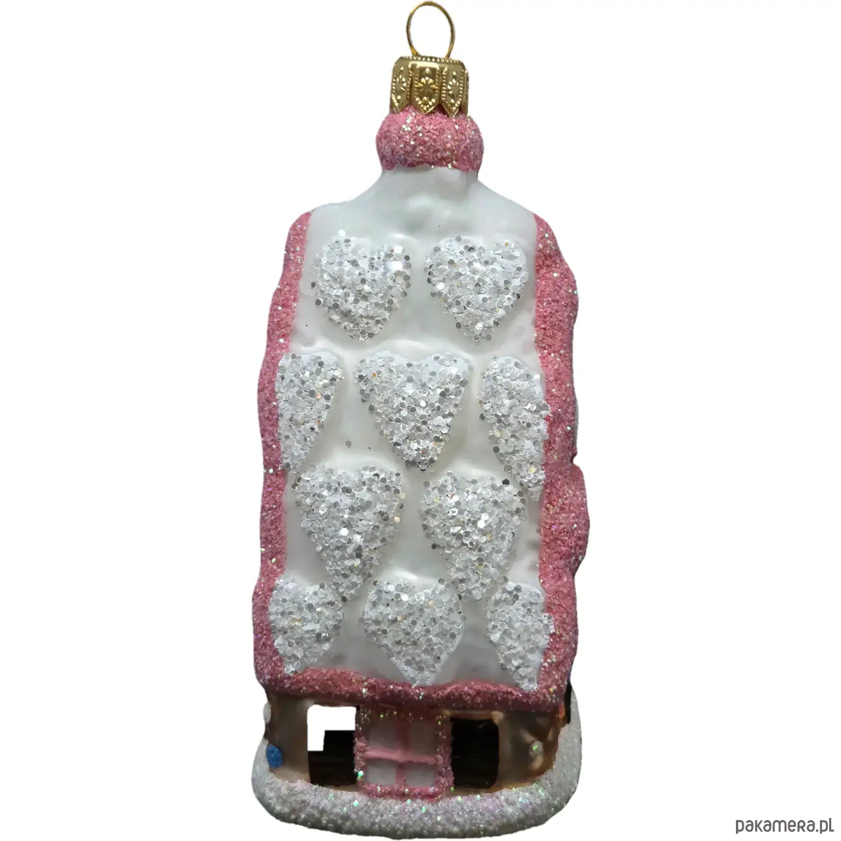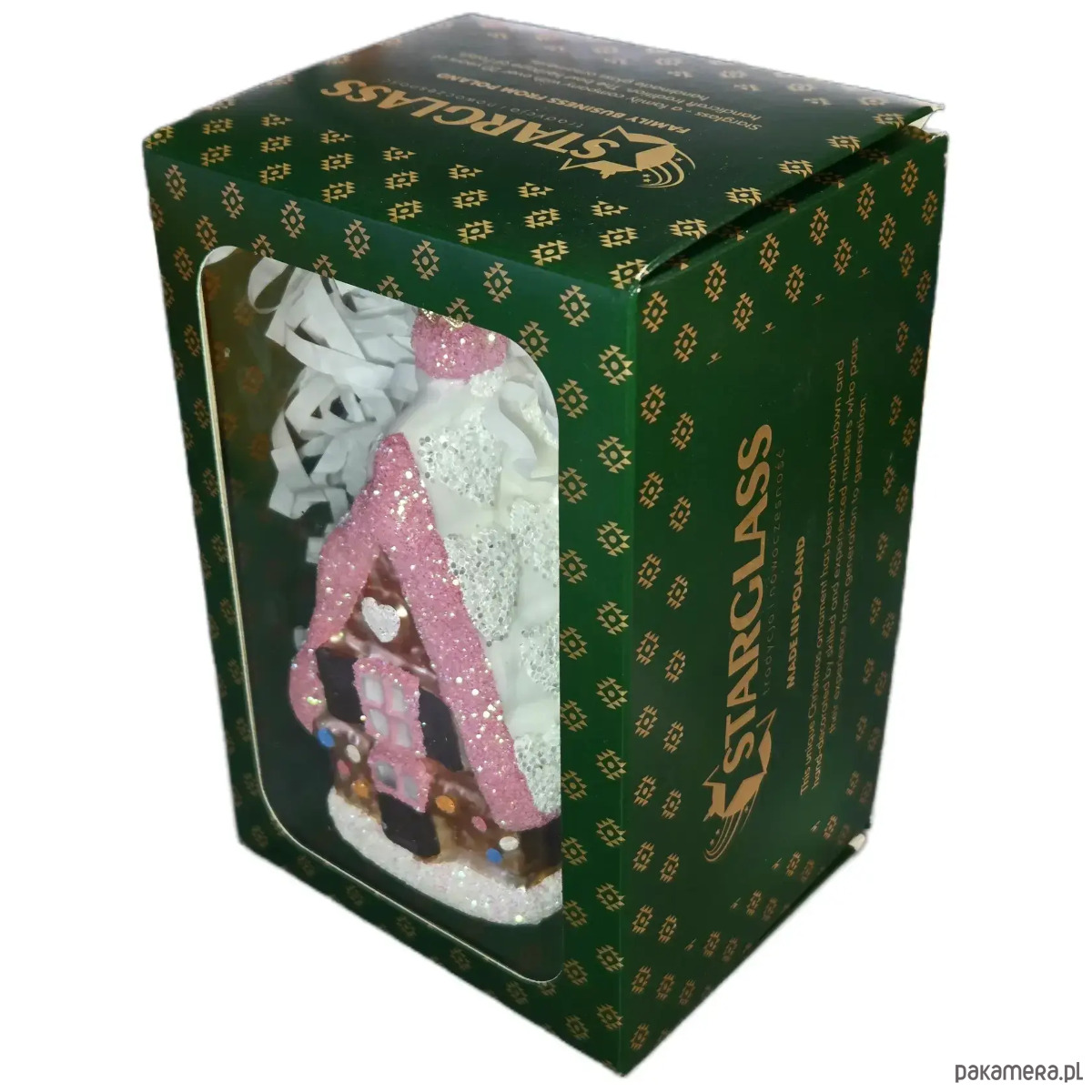 Ręcznie Malowana Szklana Bombka Biało-Różowy Domek Piernikowy