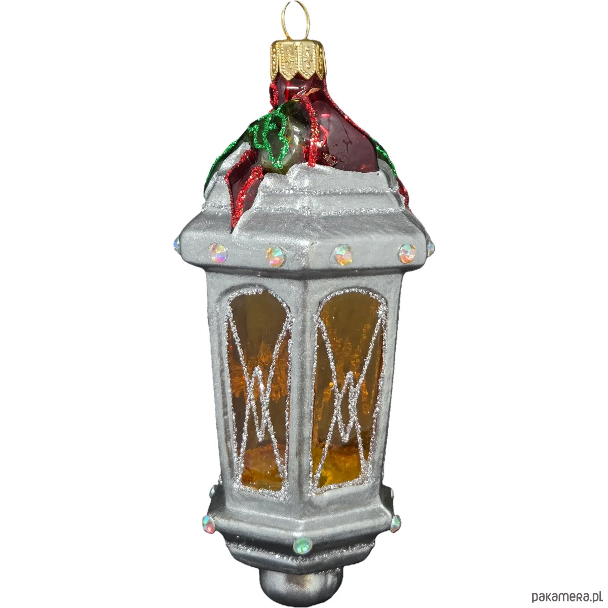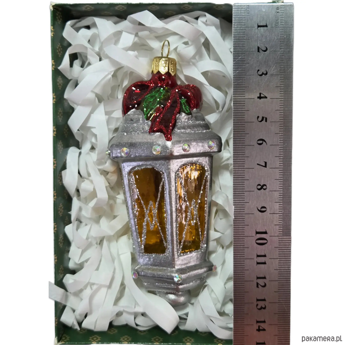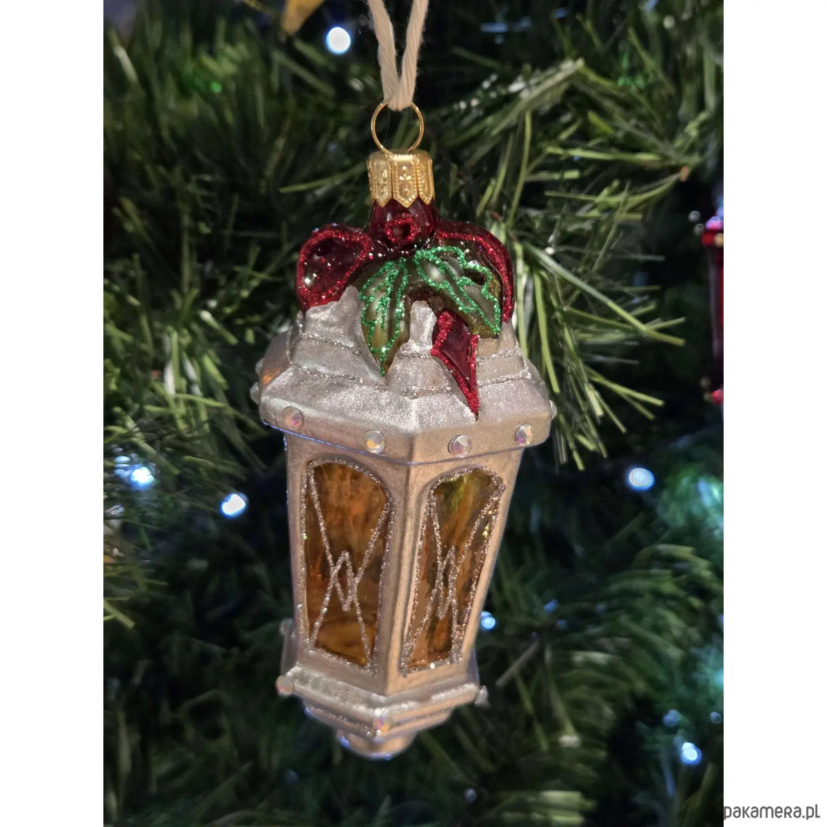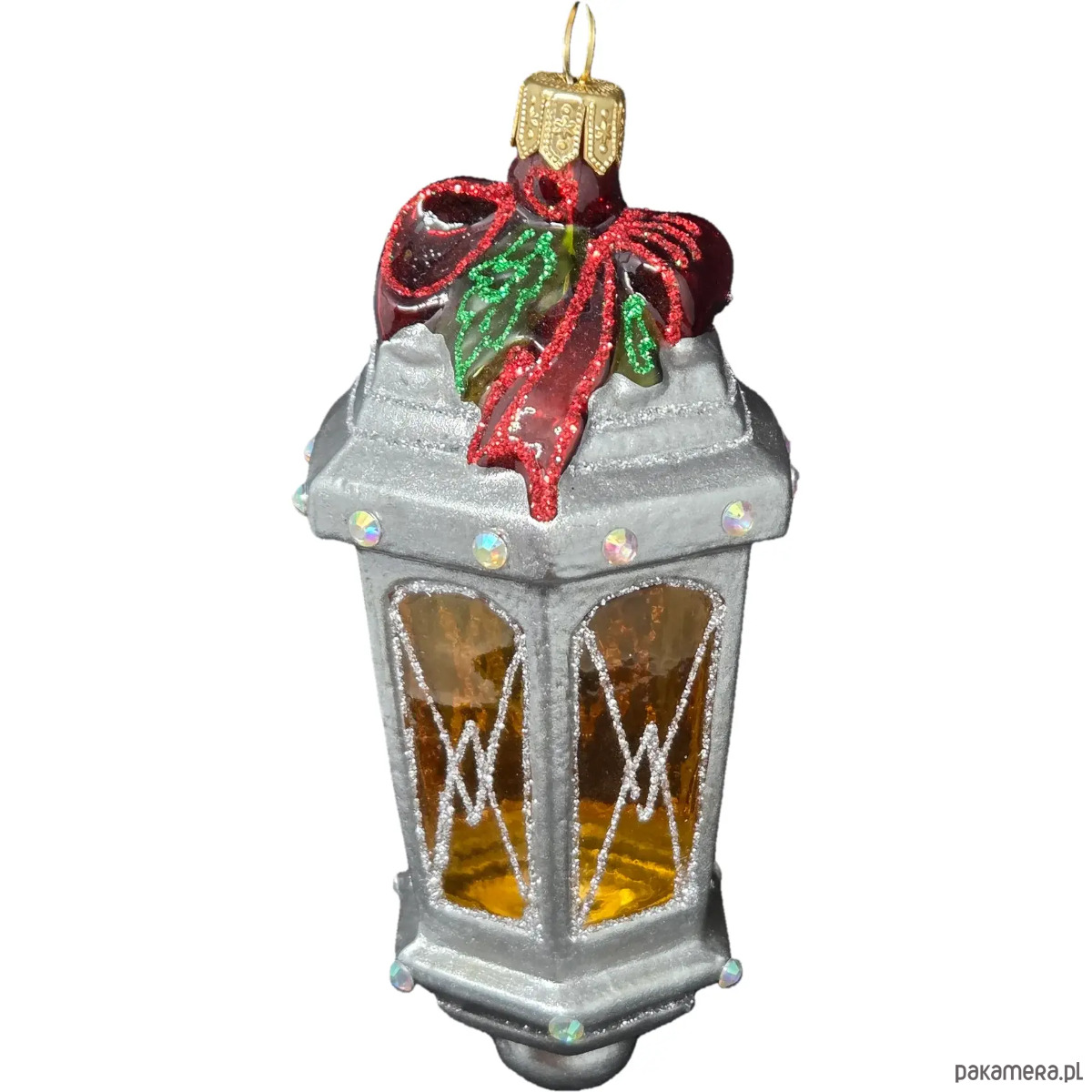Ręcznie malowana szklana bombka srebrny lampion z czerwoną kokardą