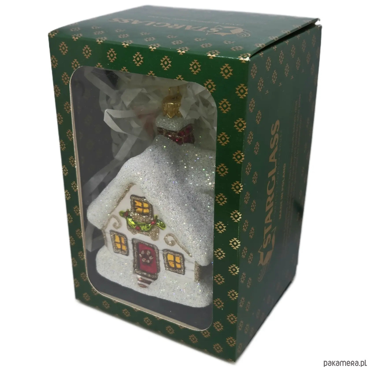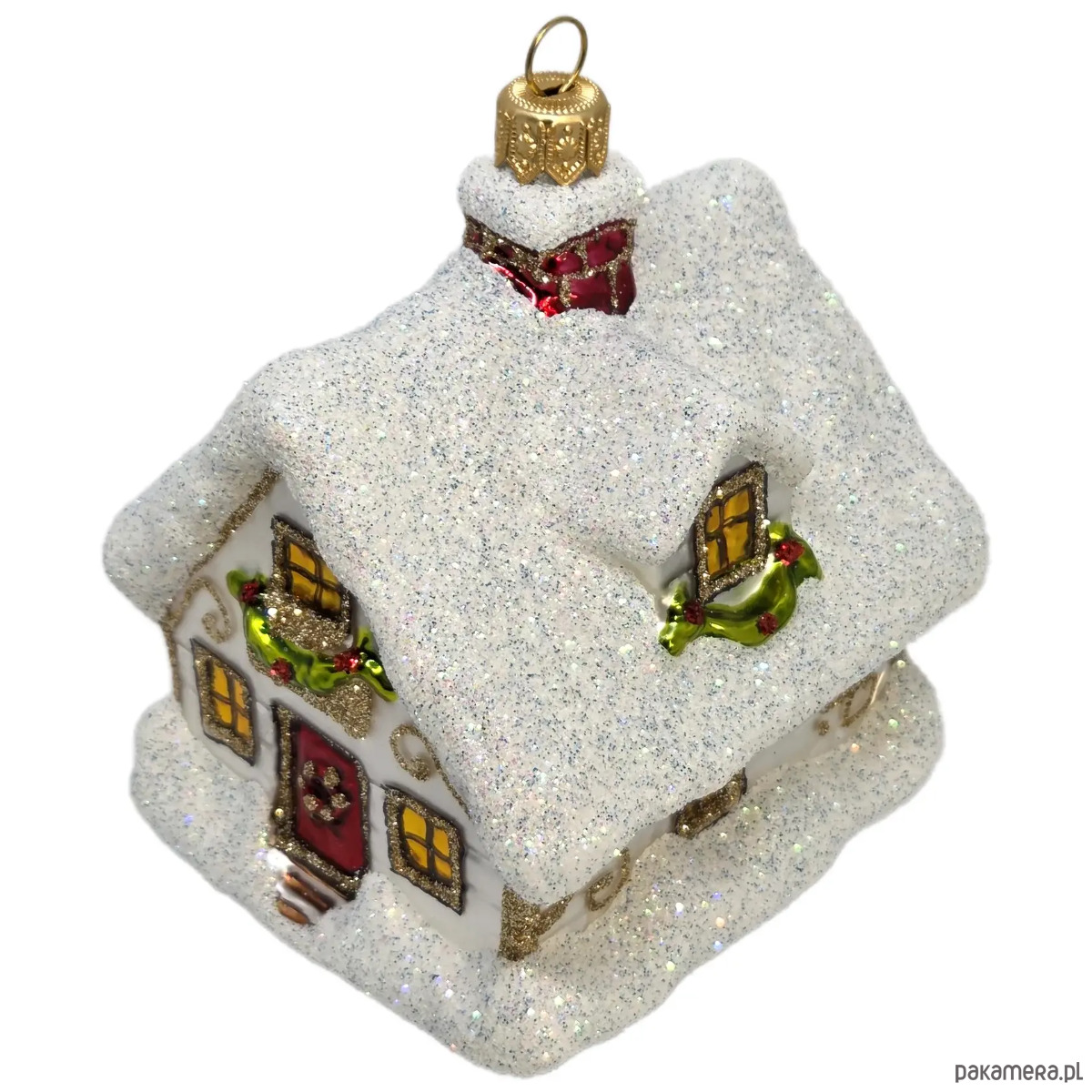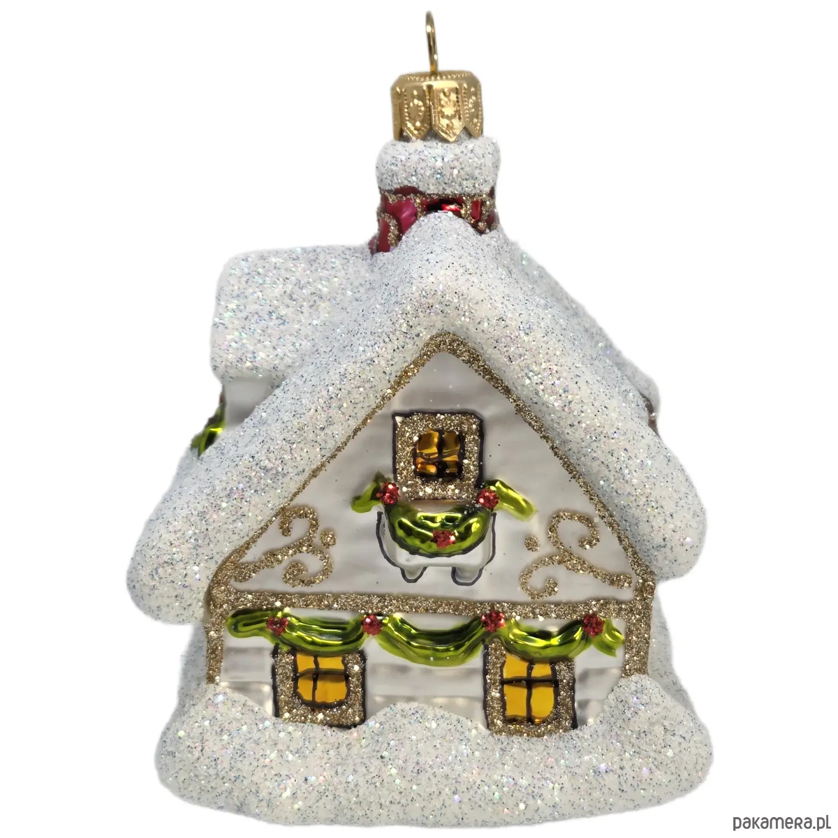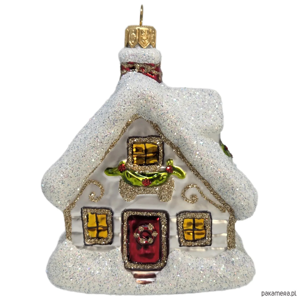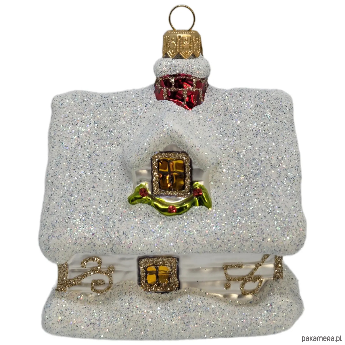 Ręcznie malowana szklana bombka biały świąteczny domek ze złotymi wzorami