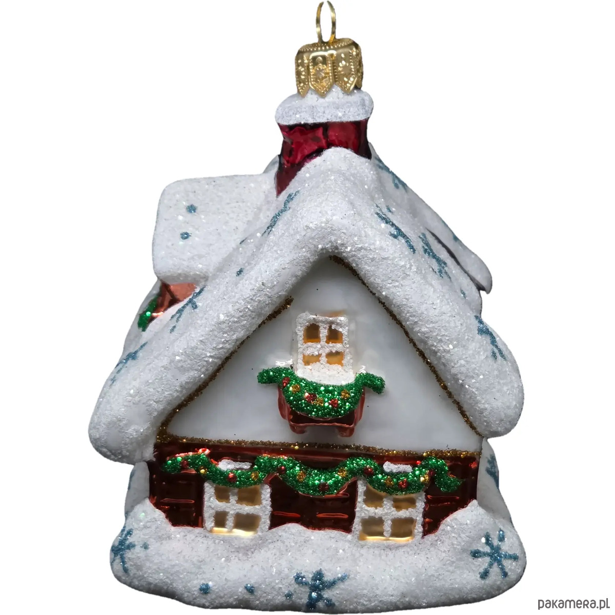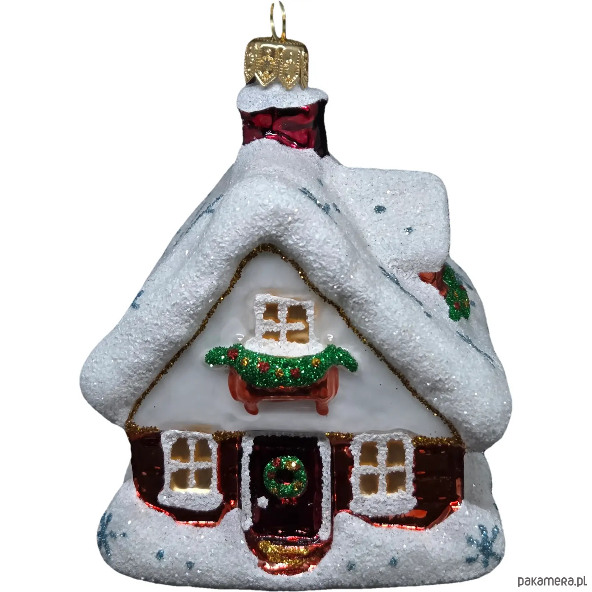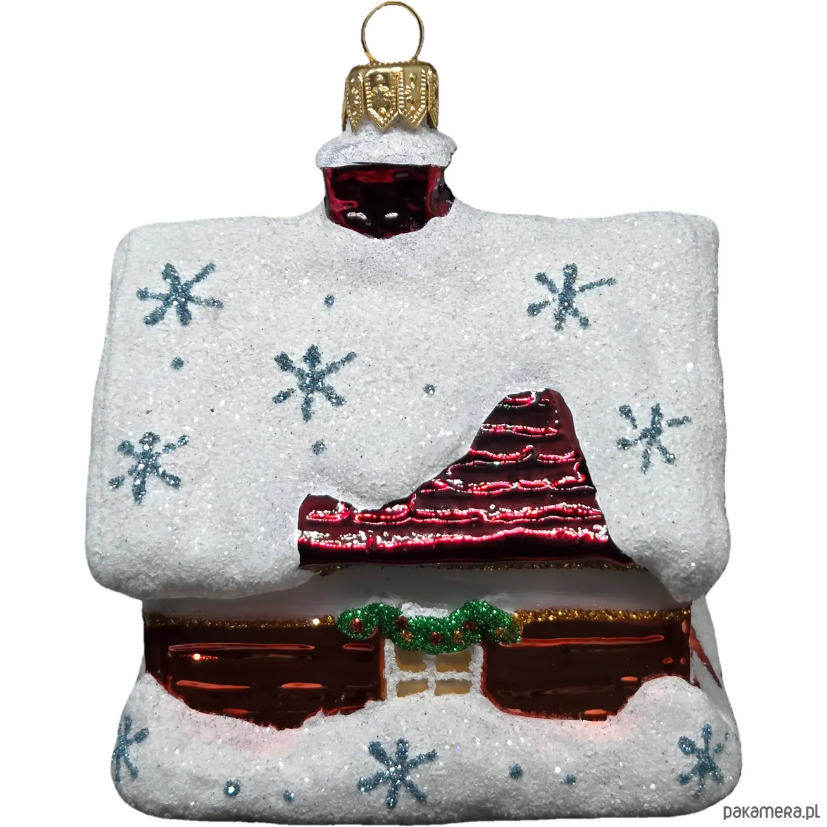 Ręcznie malowana szklana bombka czerwony zimowy domek ze śnieżnym dachem