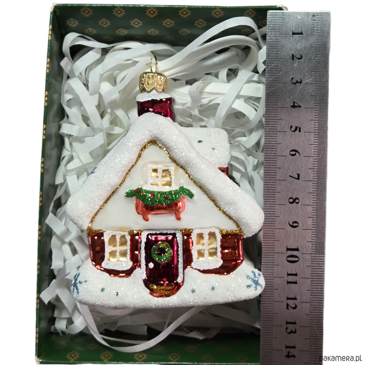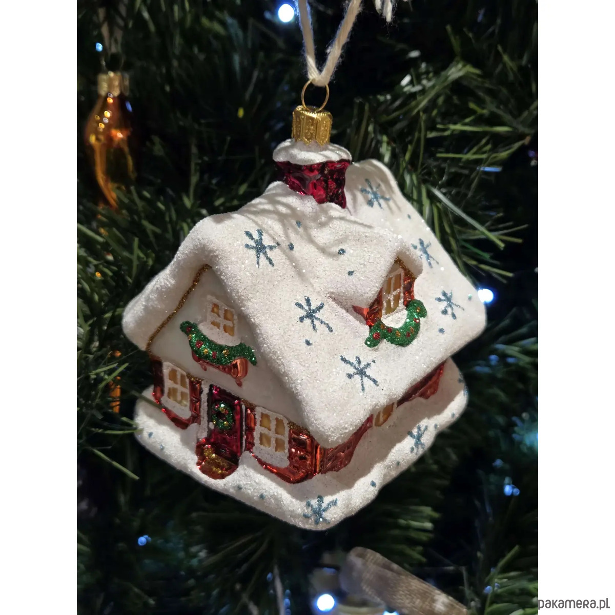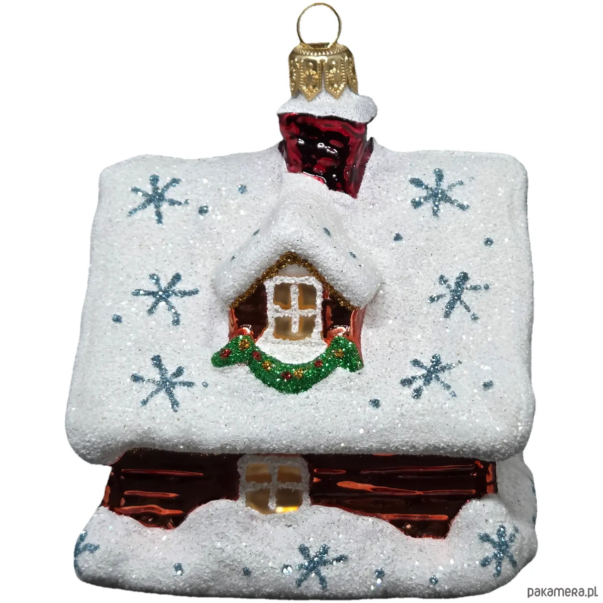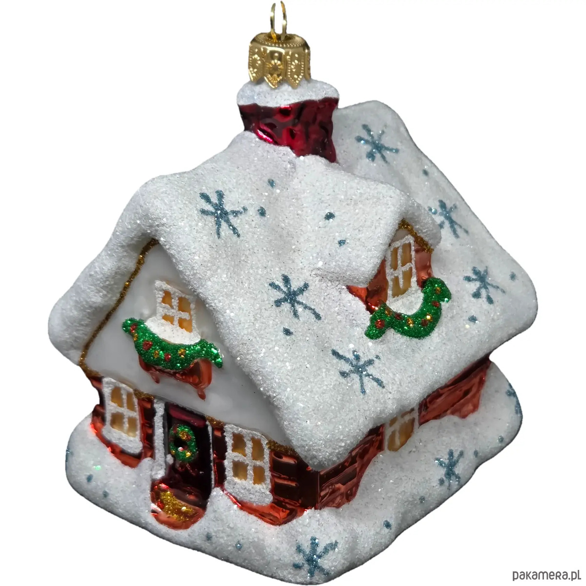 Ręcznie malowana szklana bombka czerwony zimowy domek ze śnieżnym dachem