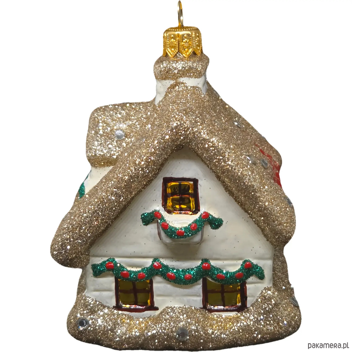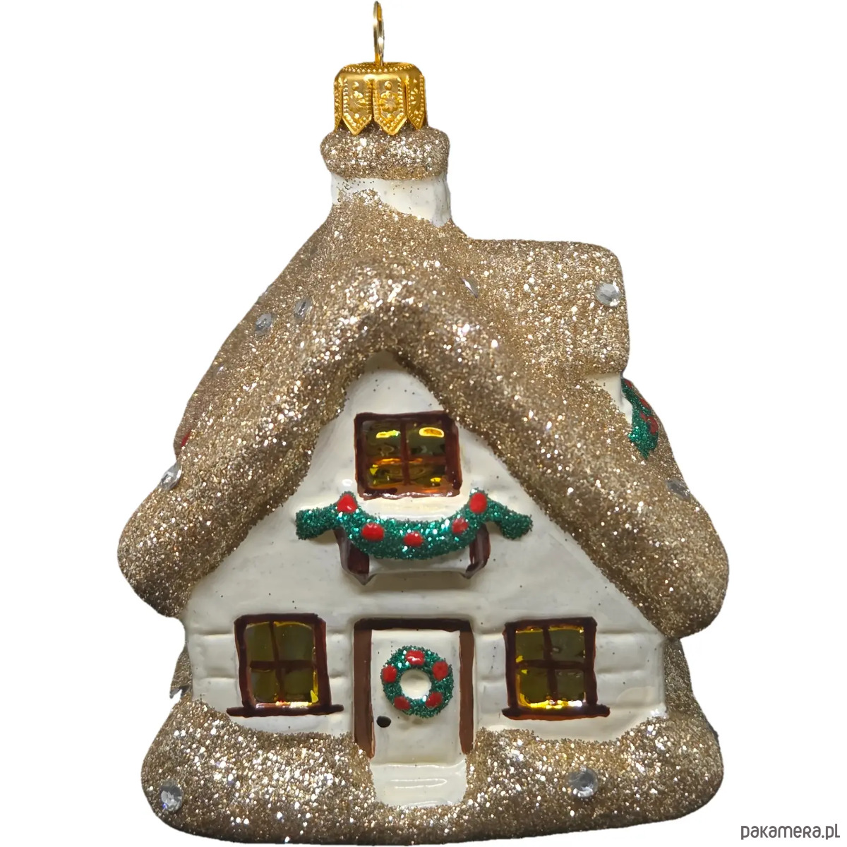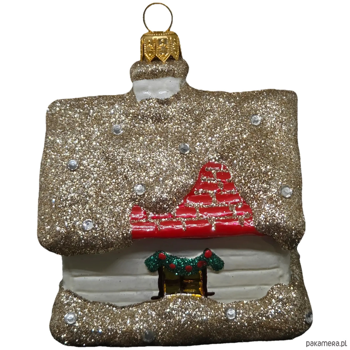 Ręcznie malowana szklana bombka złoty zimowy domek