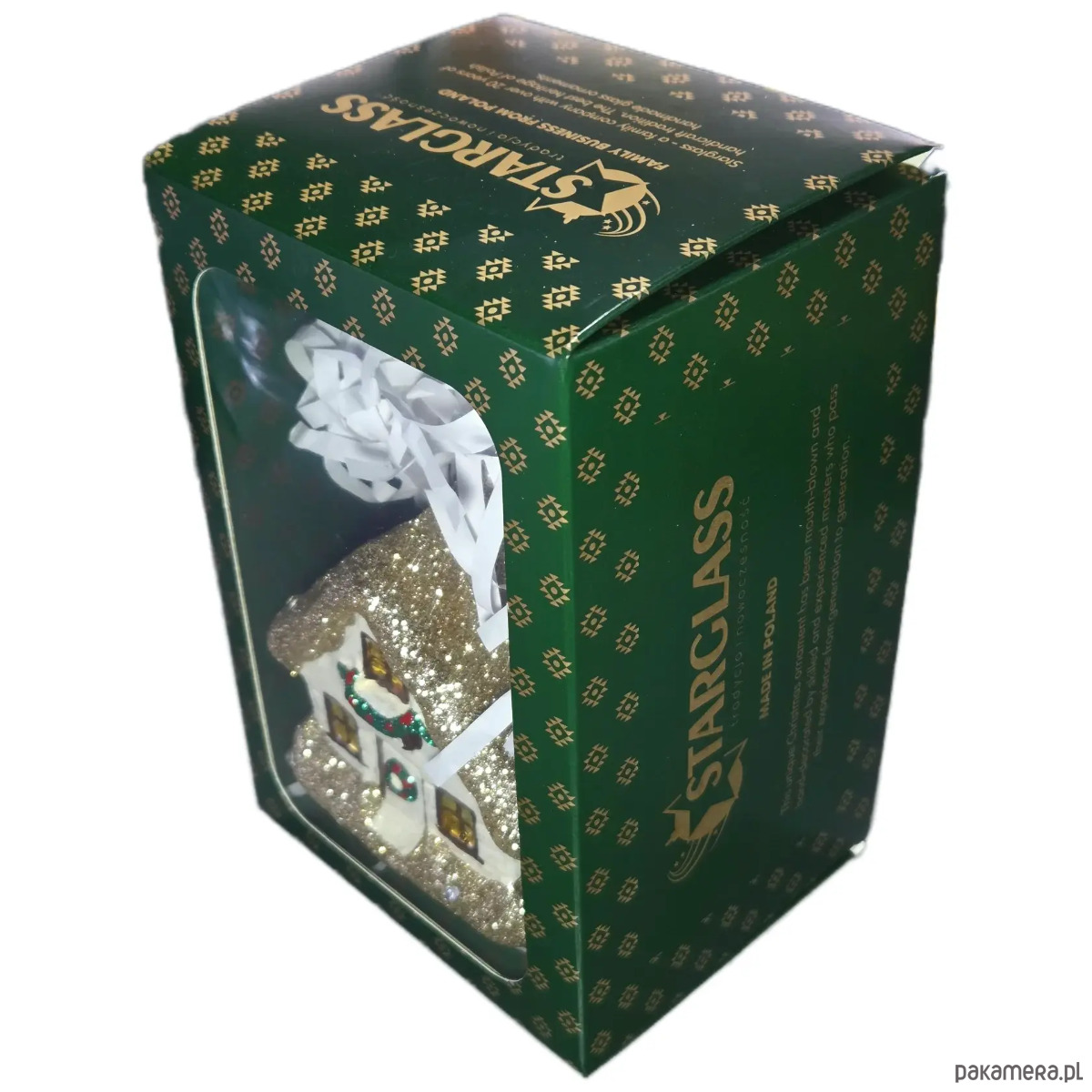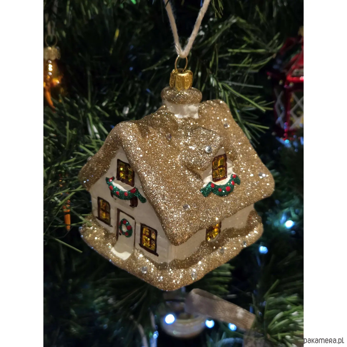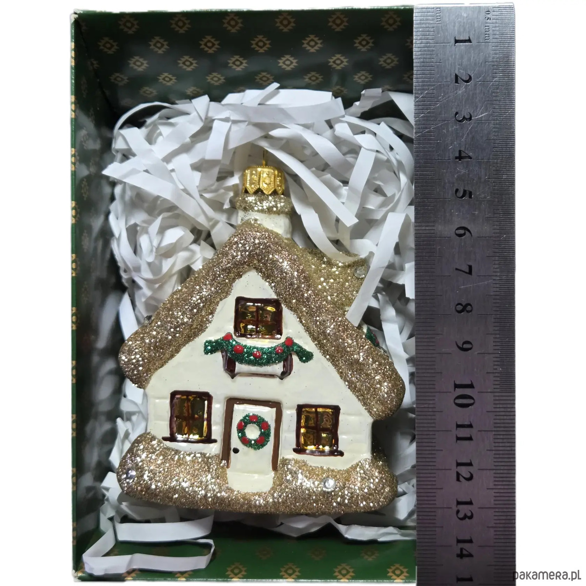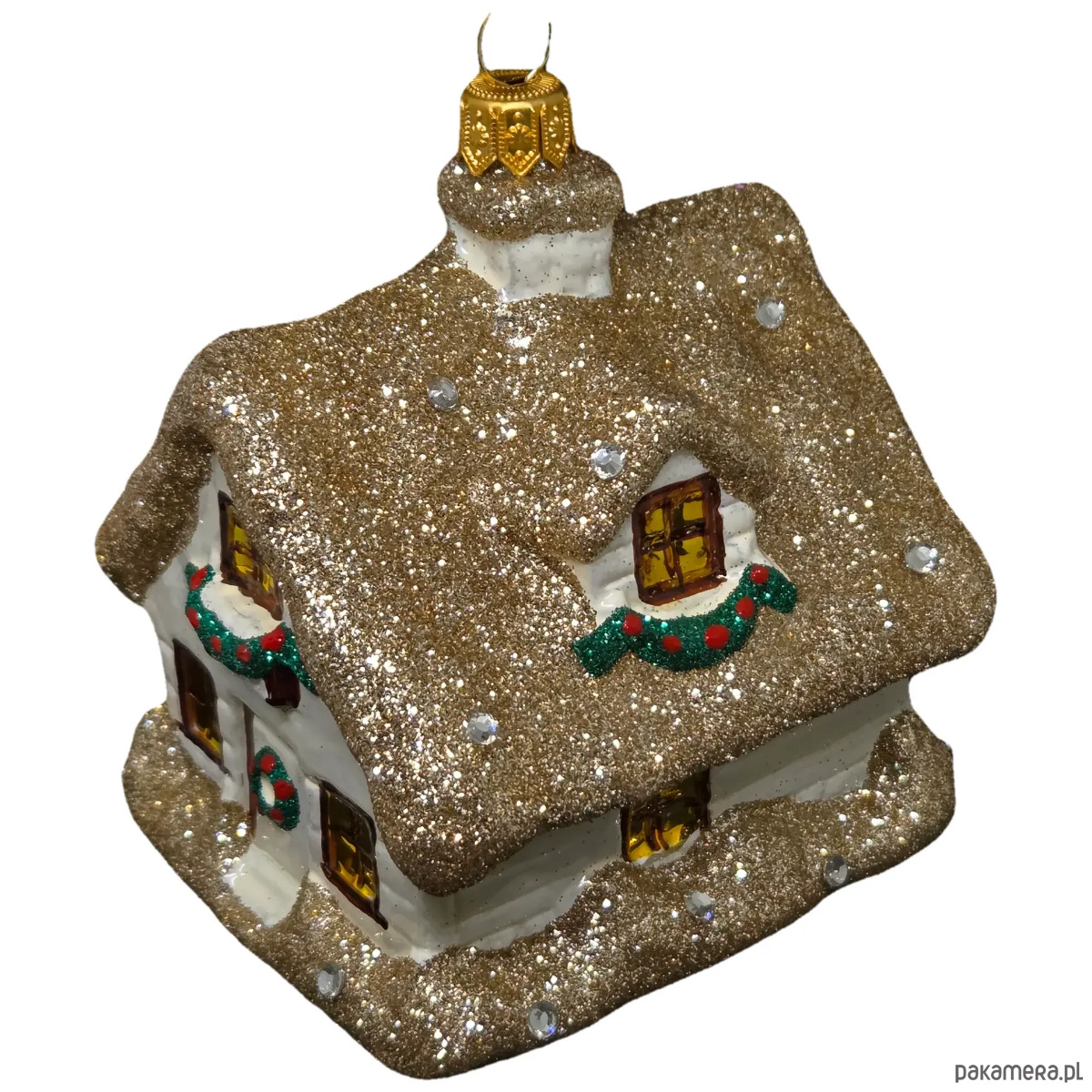 Ręcznie malowana szklana bombka złoty zimowy domek