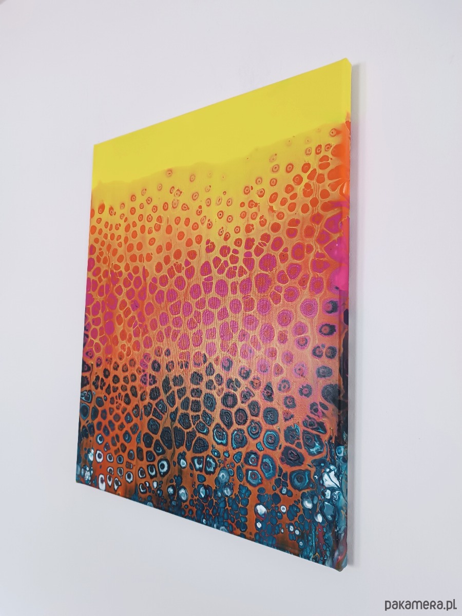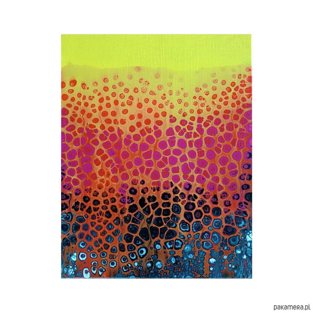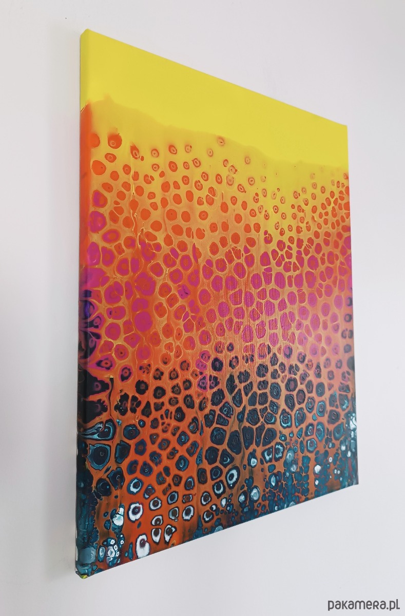 Obraz abstrakcyjny, wykonany farbami akrylowymi na lekkim podobraziu polskiej produkcji.