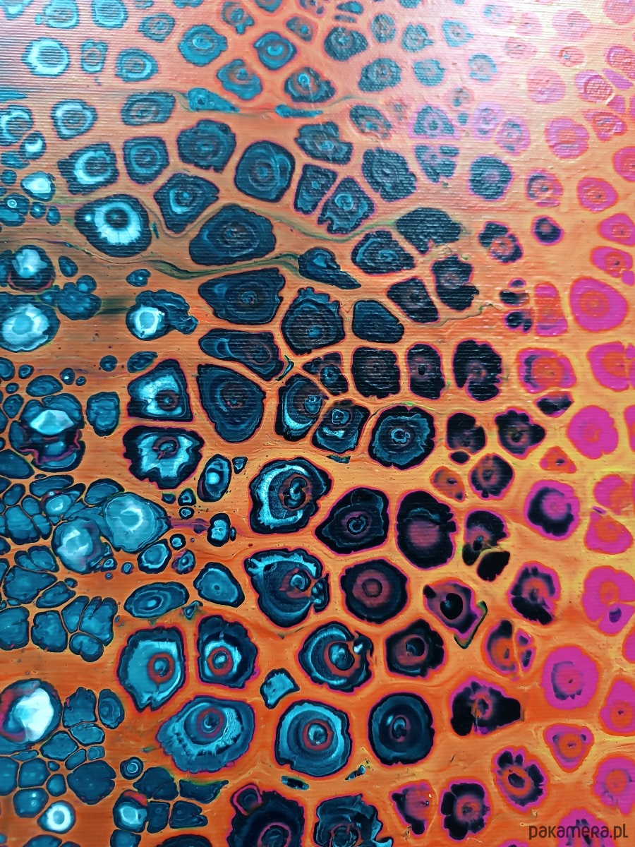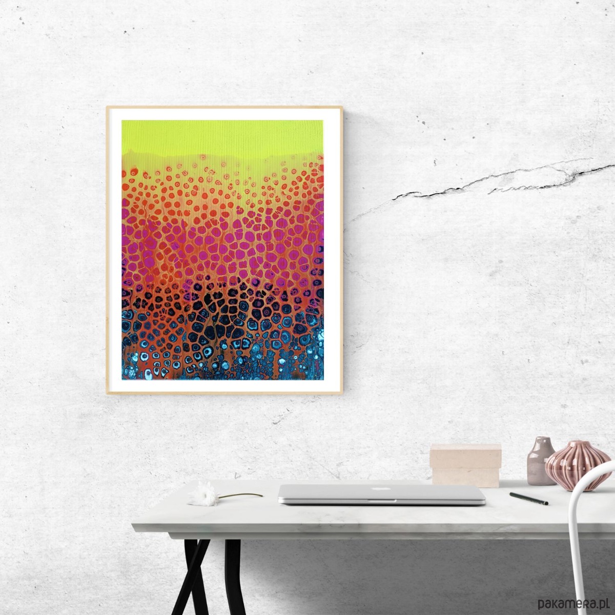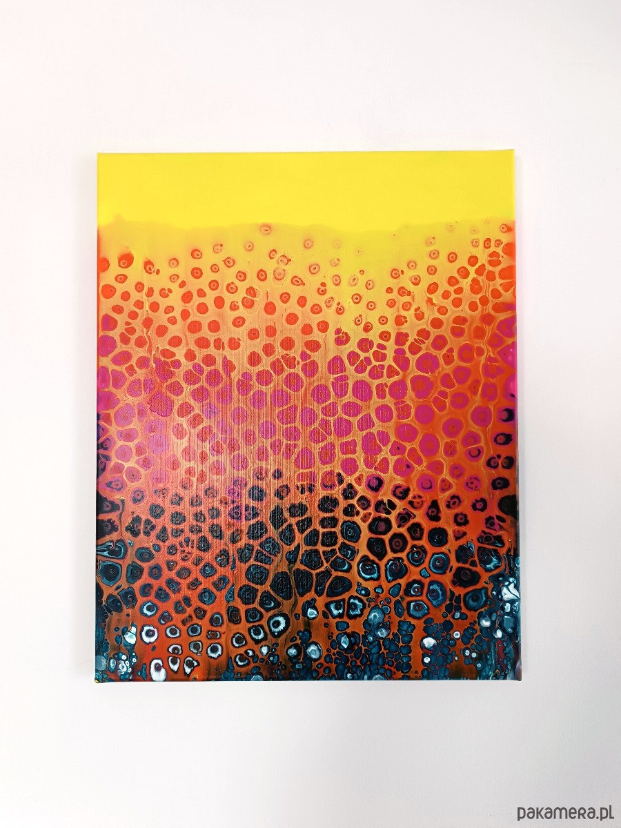 Obraz abstrakcyjny, wykonany farbami akrylowymi na lekkim podobraziu polskiej produkcji.