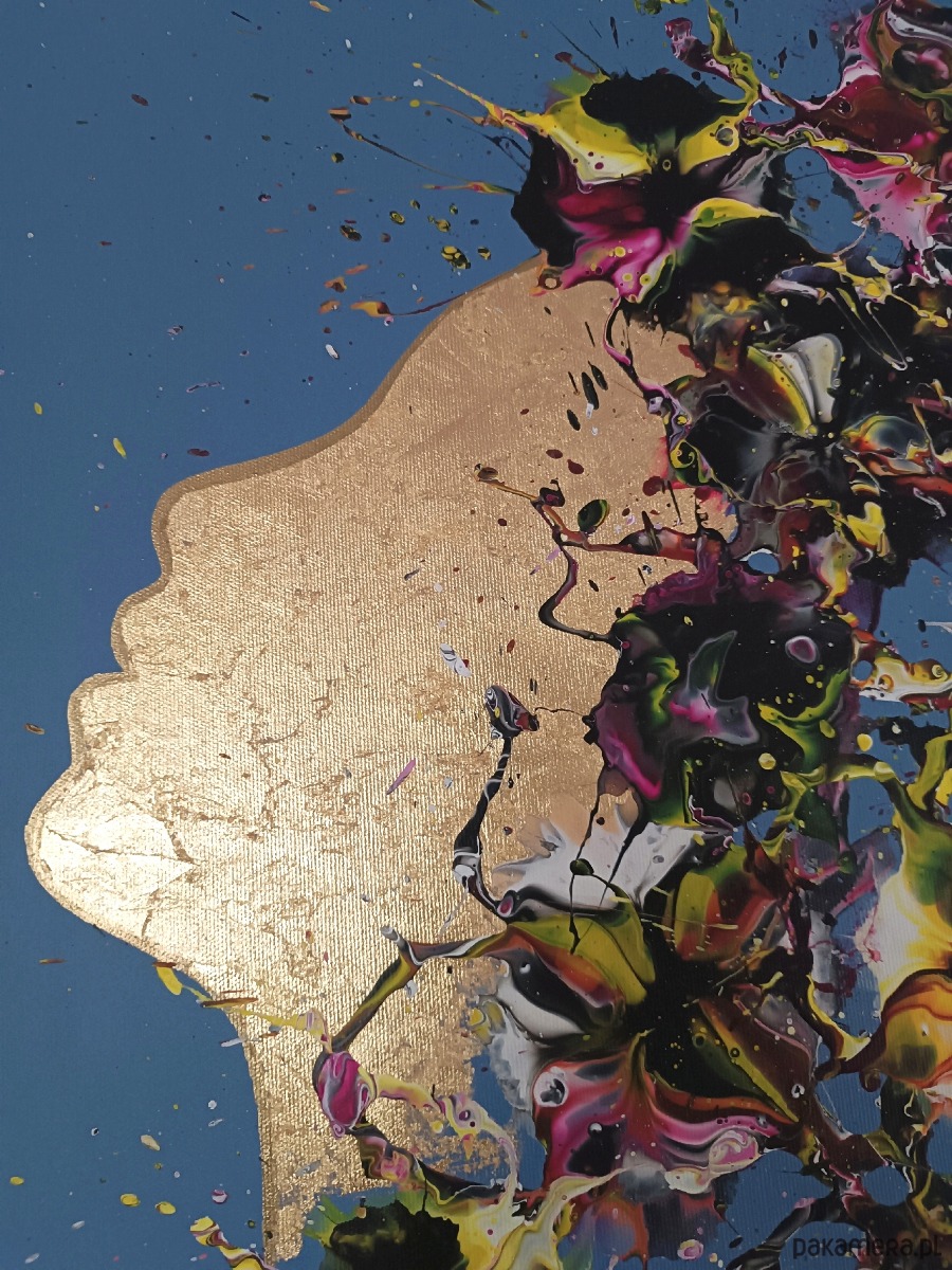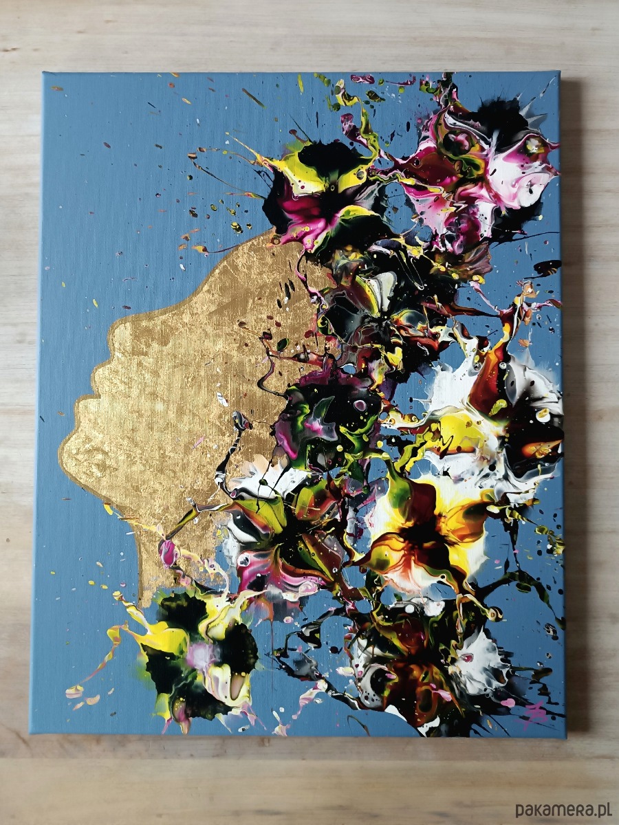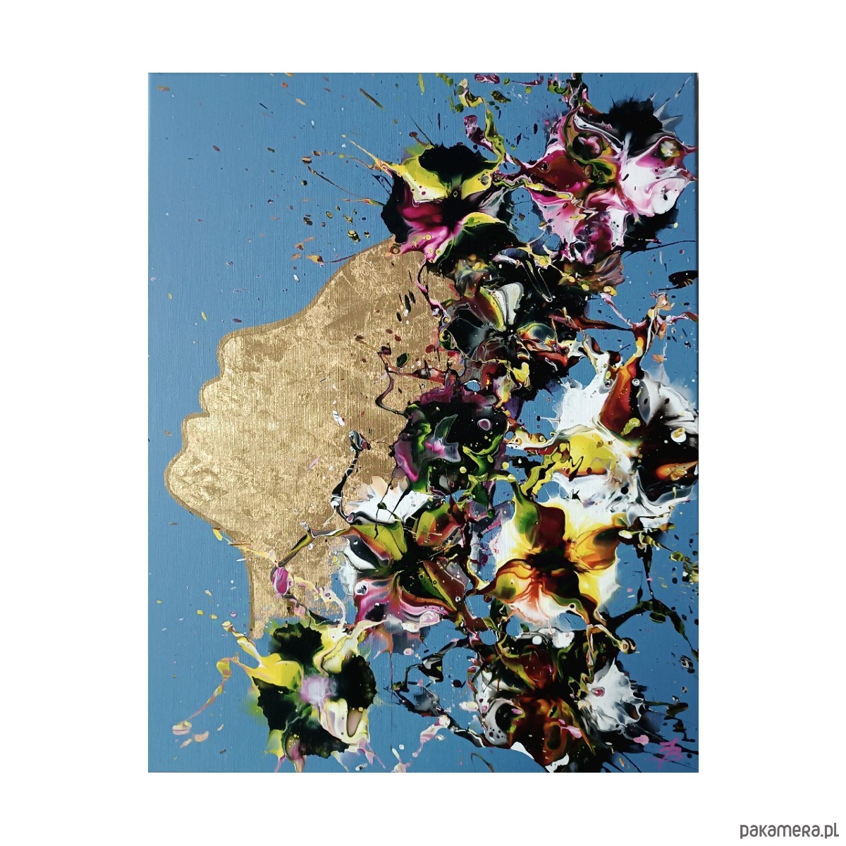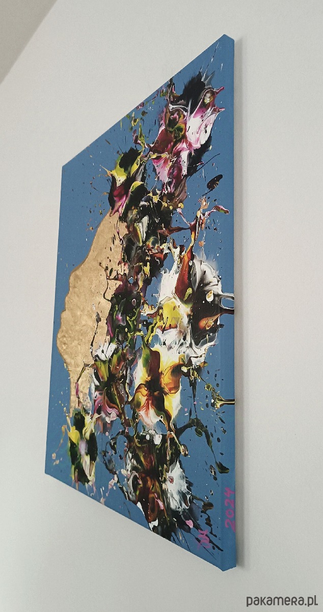 Obraz akrylowy, malowany na podobraziu bawełnianym polskiej produkcji, zabezpieczony werniksem. Użyto płatków szlagmetalu w kolorze złotym.
