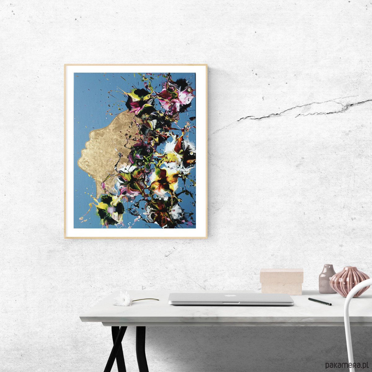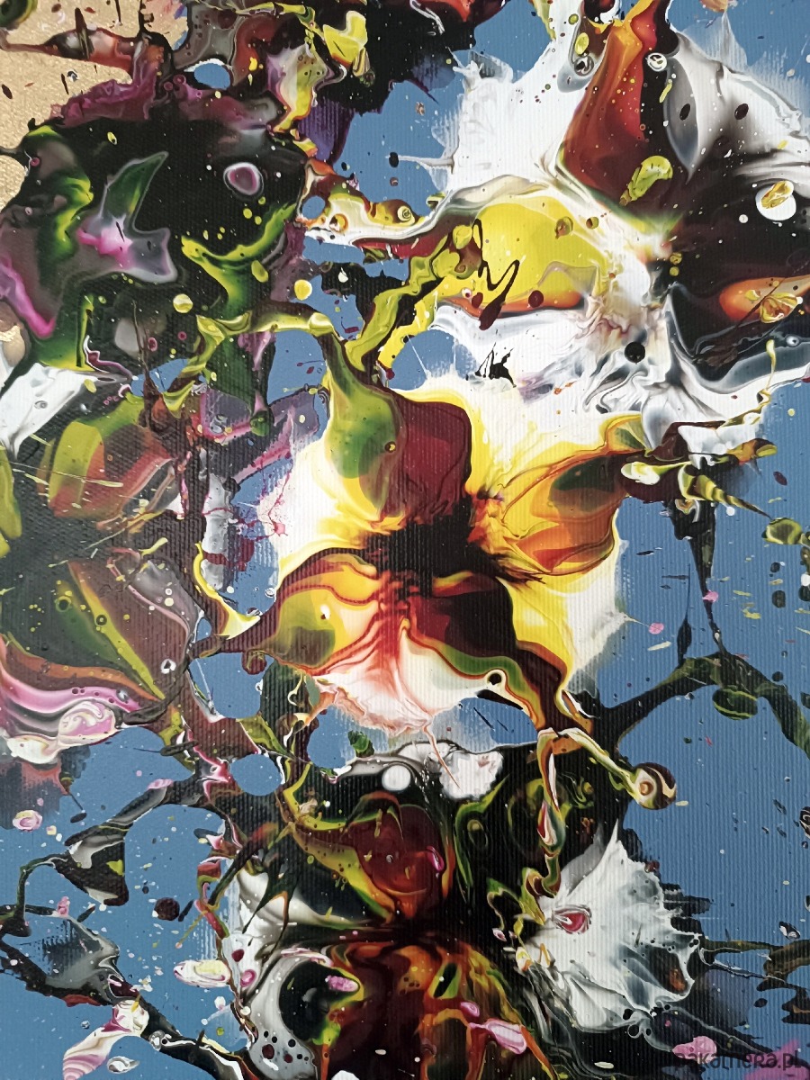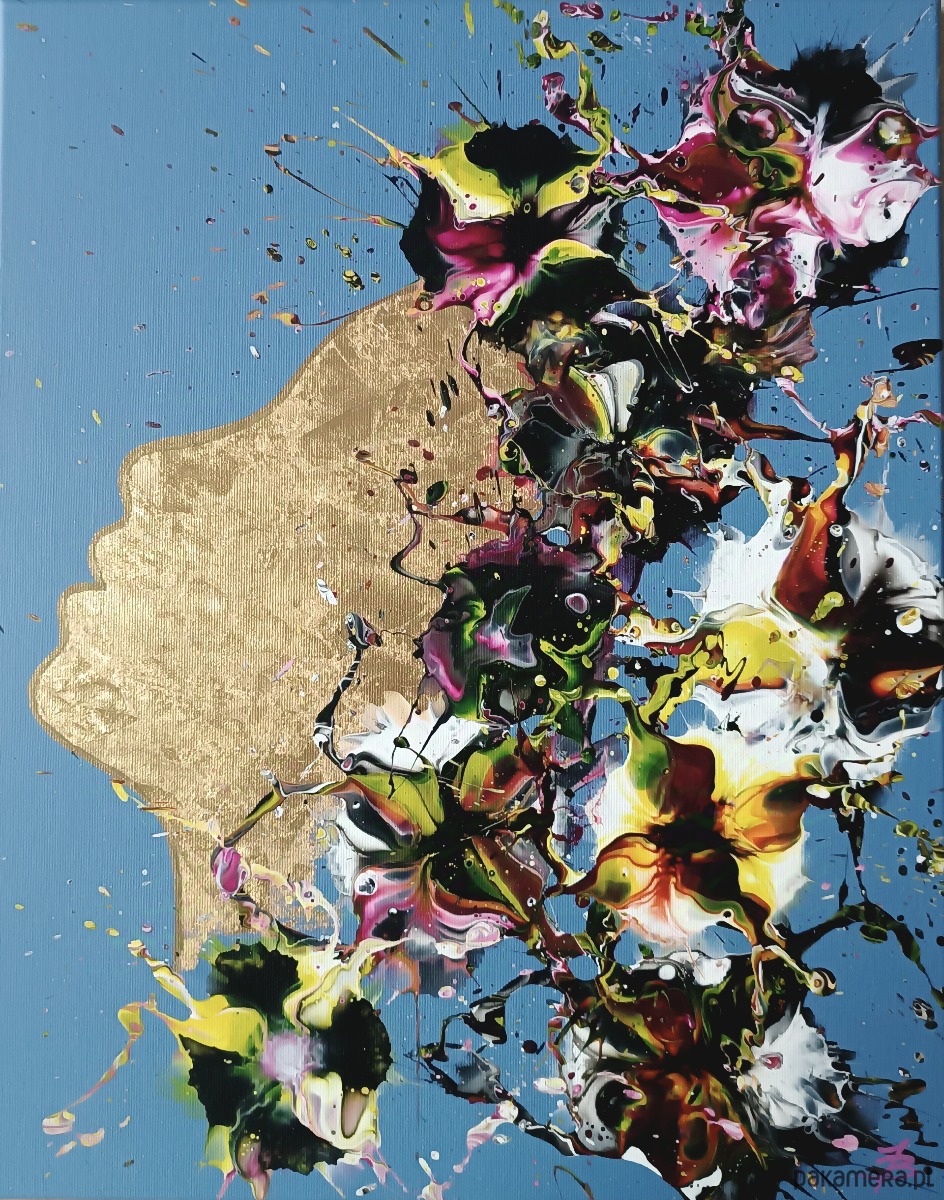 Obraz akrylowy, malowany na podobraziu bawełnianym polskiej produkcji, zabezpieczony werniksem. Użyto płatków szlagmetalu w kolorze złotym.