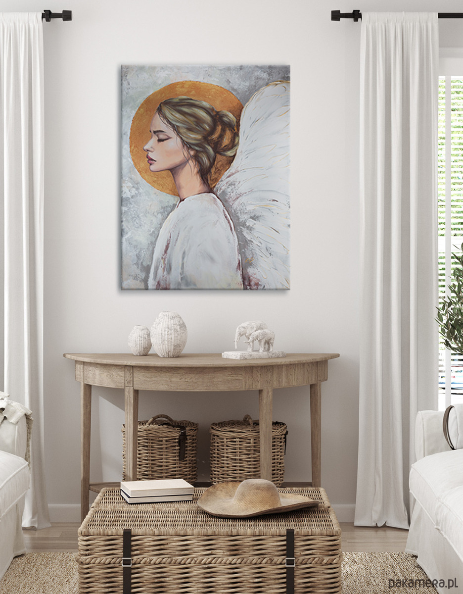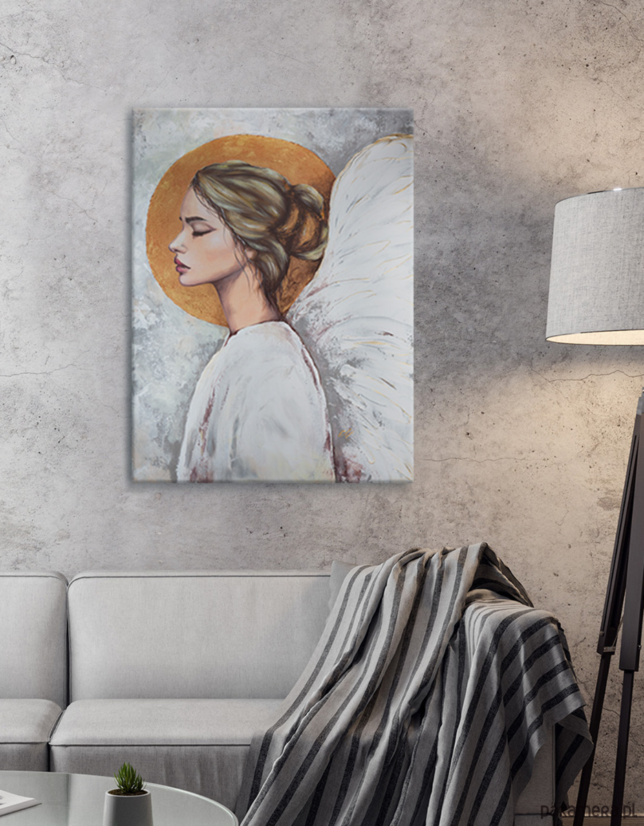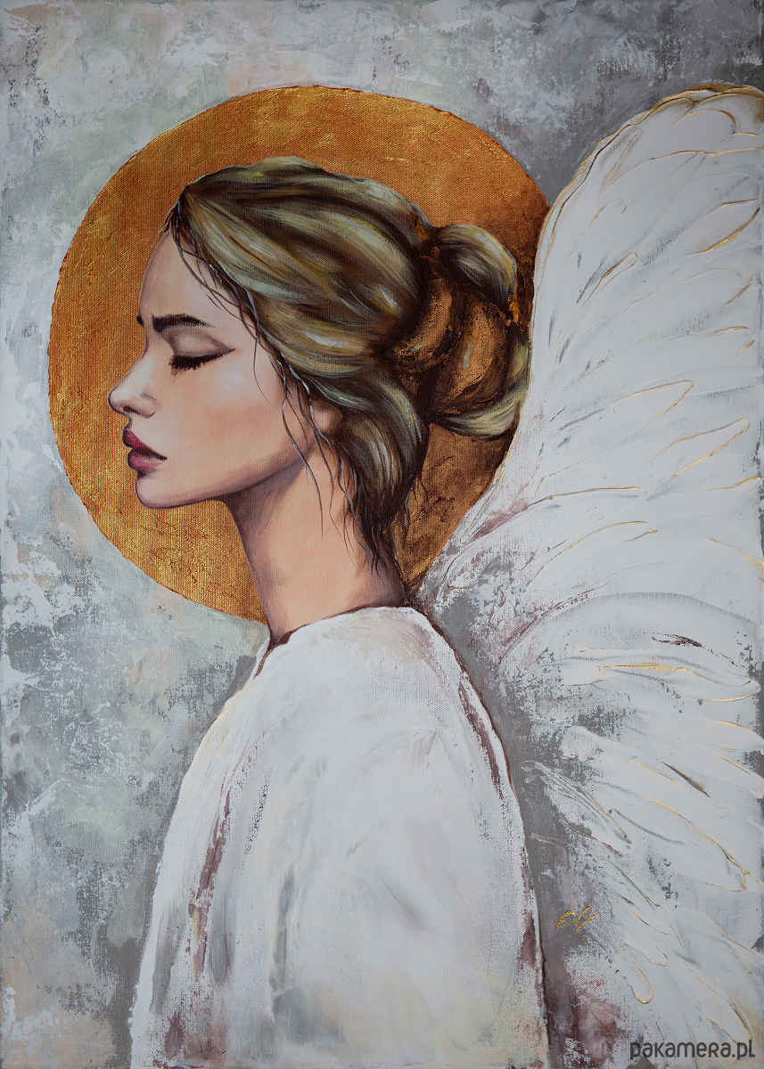 100% ręcznie malowany Anioł na płótnie z widoczną grubą strukturą farby i elementami złota. Obraz naciągnięty jest na drewniane krosno, zawerniksowany i ma zamalowane boki. Jest to oryginalne sygnowane dzieło.