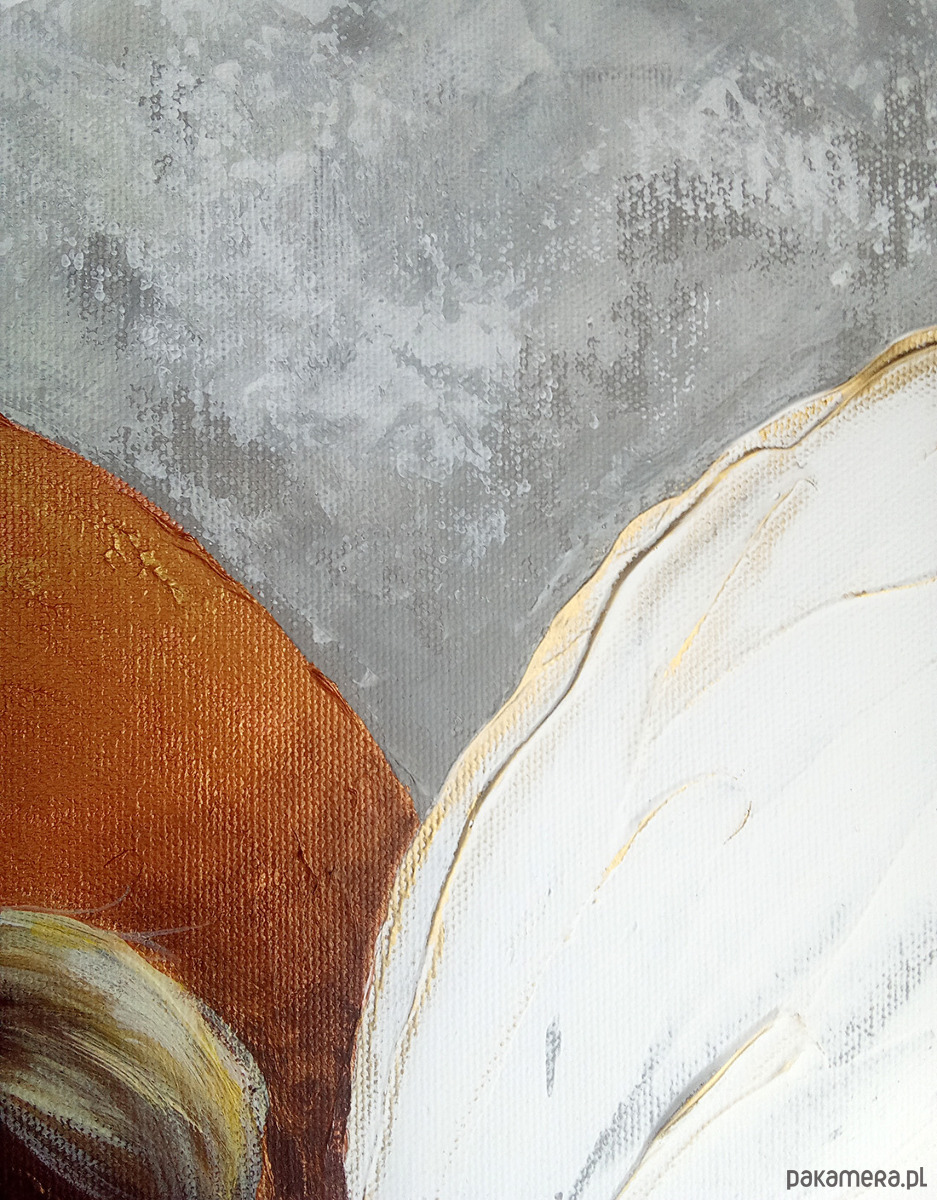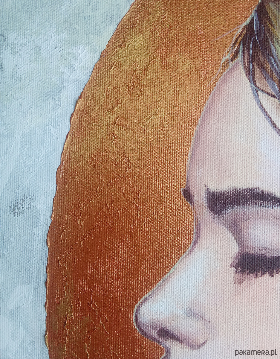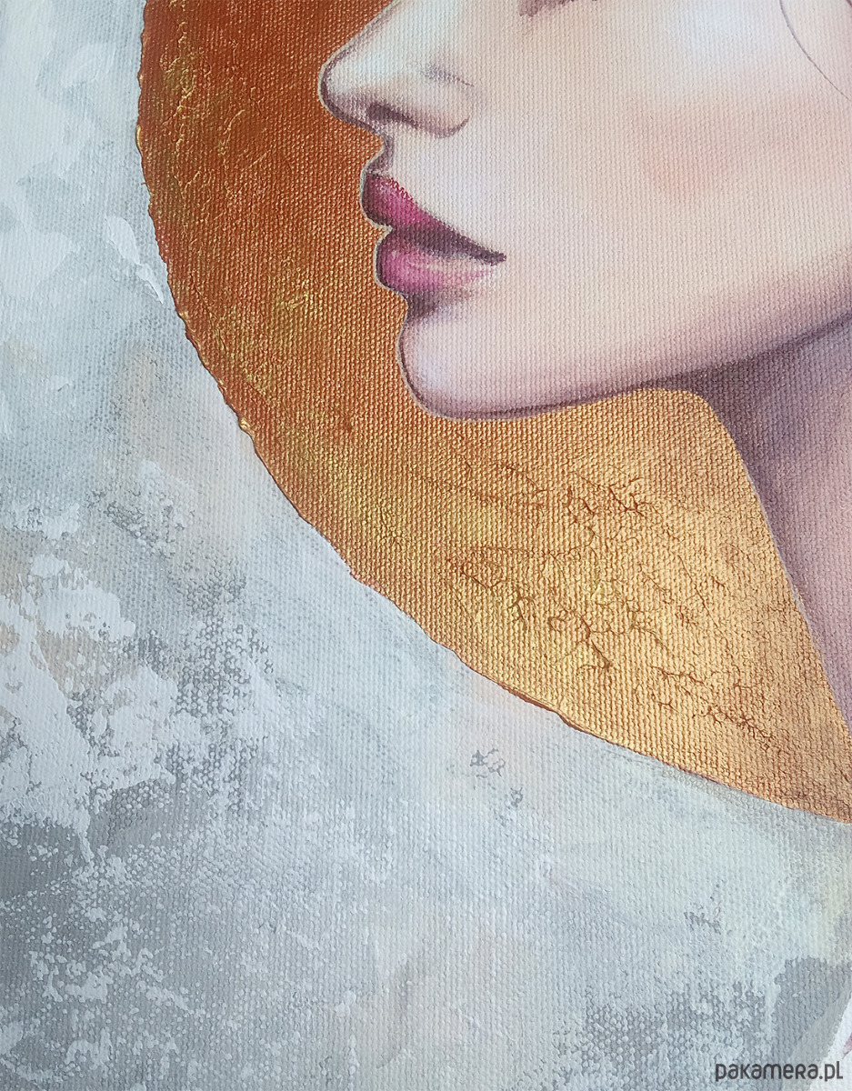 100% ręcznie malowany Anioł na płótnie z widoczną grubą strukturą farby i elementami złota. Obraz naciągnięty jest na drewniane krosno, zawerniksowany i ma zamalowane boki. Jest to oryginalne sygnowane dzieło.