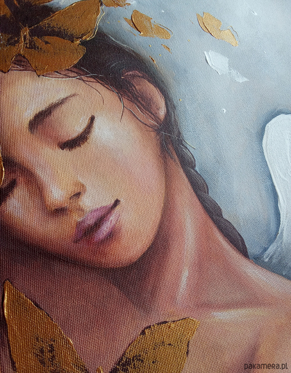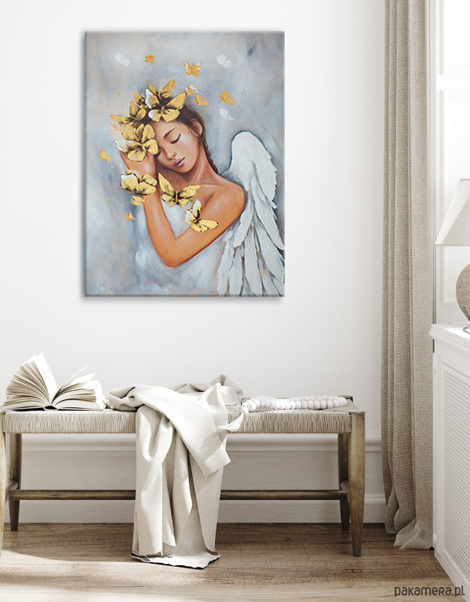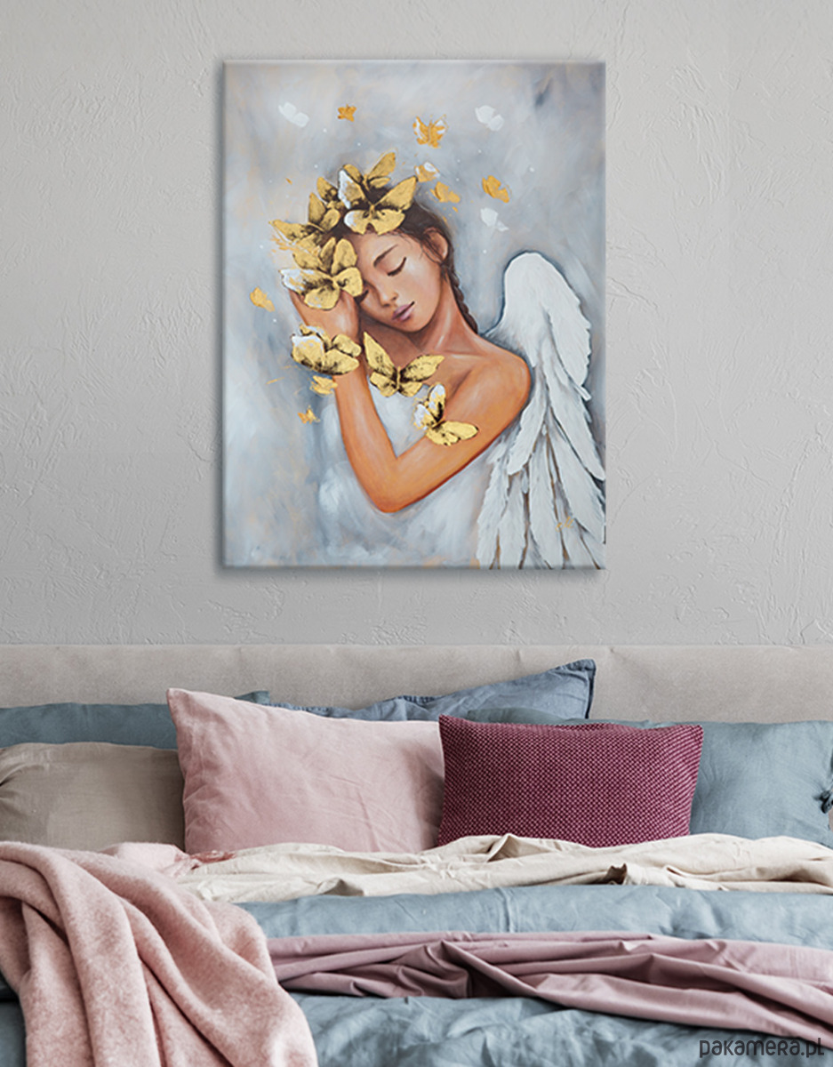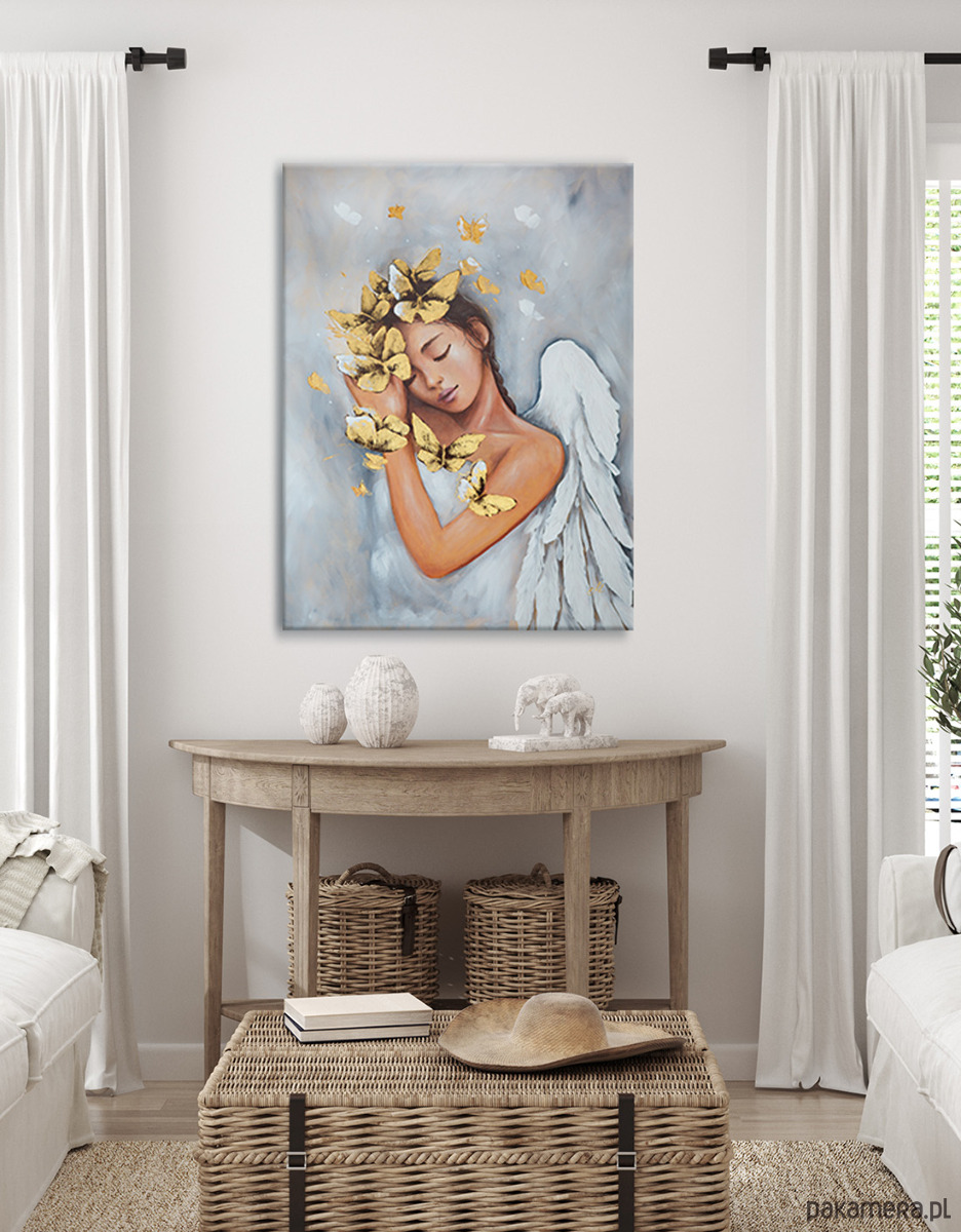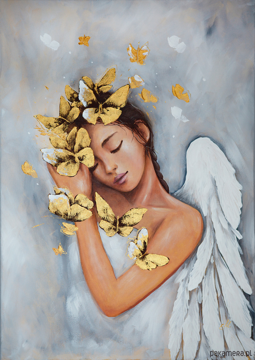 100% ręcznie malowany Anioł na płótnie z widoczną grubą strukturą farby i elementami złota. Obraz naciągnięty jest na drewniane krosno, zawerniksowany i ma zamalowane boki. Jest to oryginalne sygnowane dzieło.