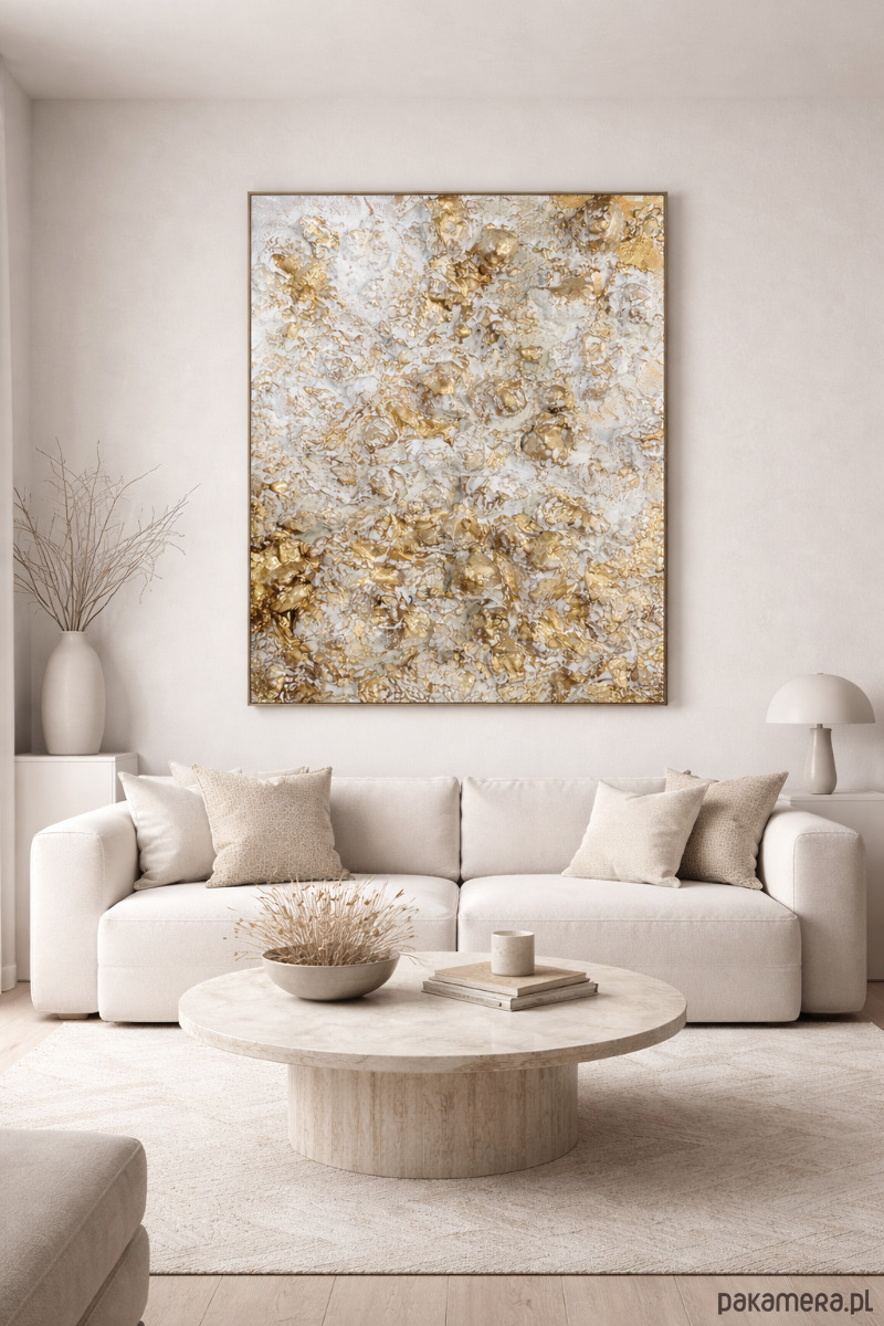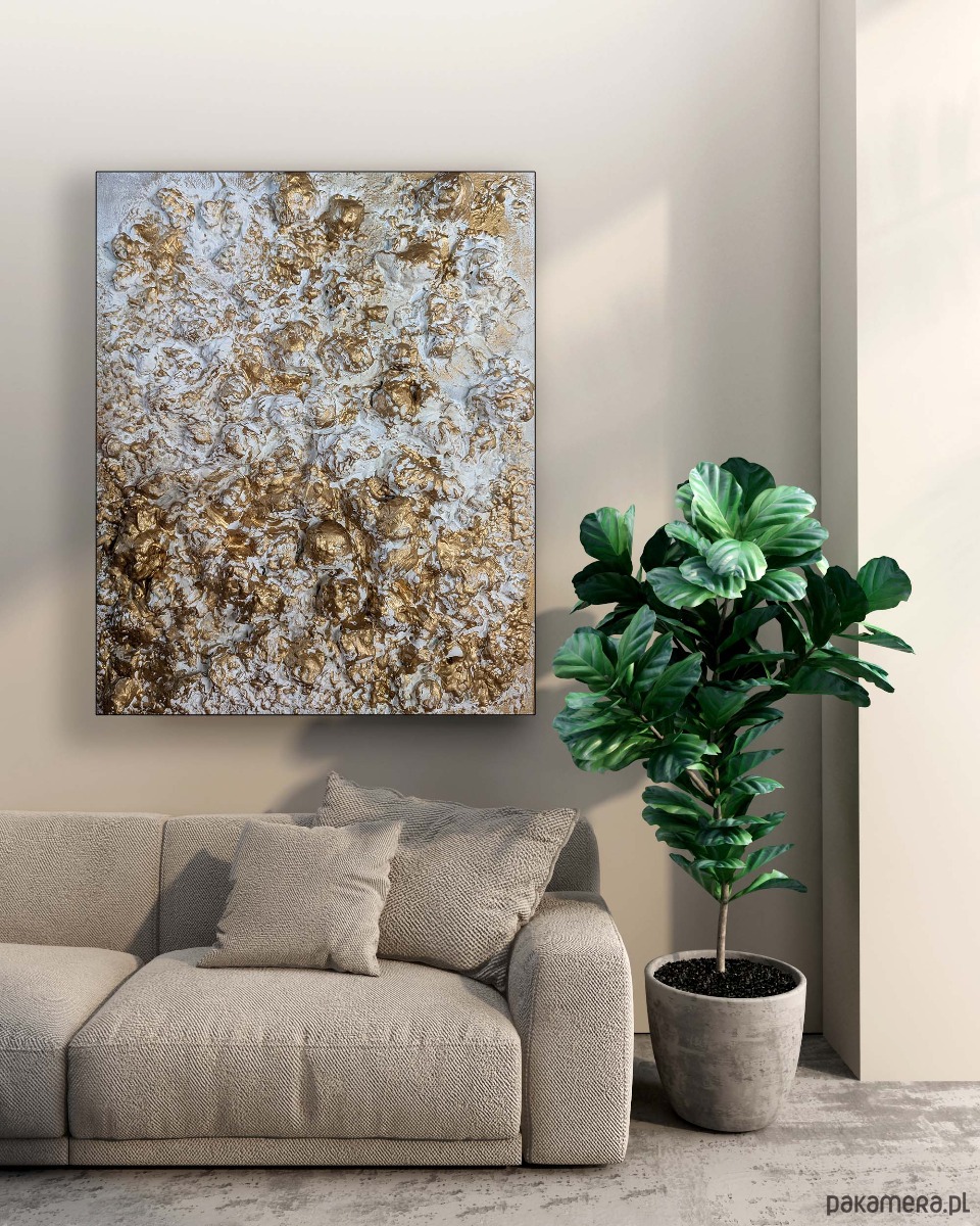 To elegancki, ręcznie malowany obraz strukturalny o bardzo wyrazistej, trójwymiarowej fakturze - idealny do salonu, sypialni lub reprezentacyjnego holu.