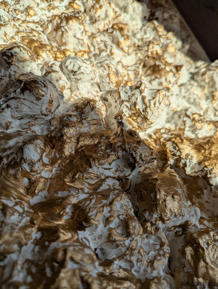 Autorski obraz abstrakcyjny o bogatej, trójwymiarowej strukturze przypominającej płaskorzeźbę; wysokość detali sięga ok. 3,5 cm, co daje wyrazisty efekt 3D i piękną grę światła na powierzchni.