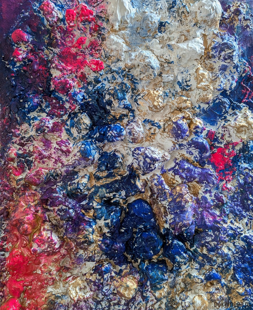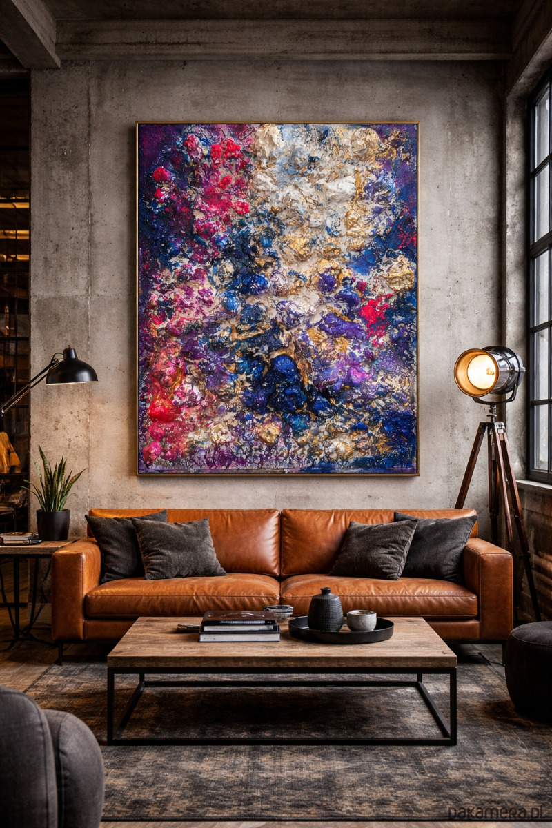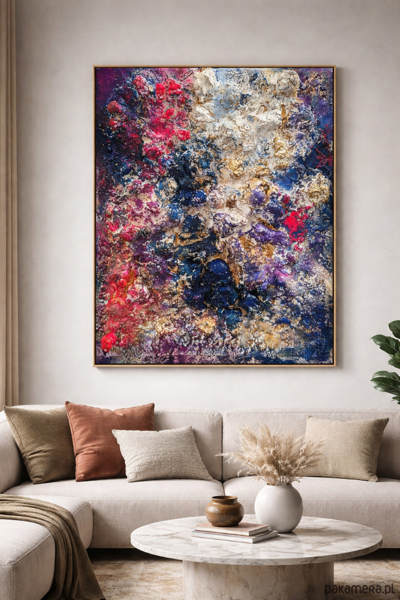 Ten obraz to zapis momentu napięcia między energią a spokojem. Intensywne odcienie granatu, fioletu i czerwieni zderzają się tutaj z jasnością bieli i złota, tworząc dynamiczną, niemal organiczną strukturę.