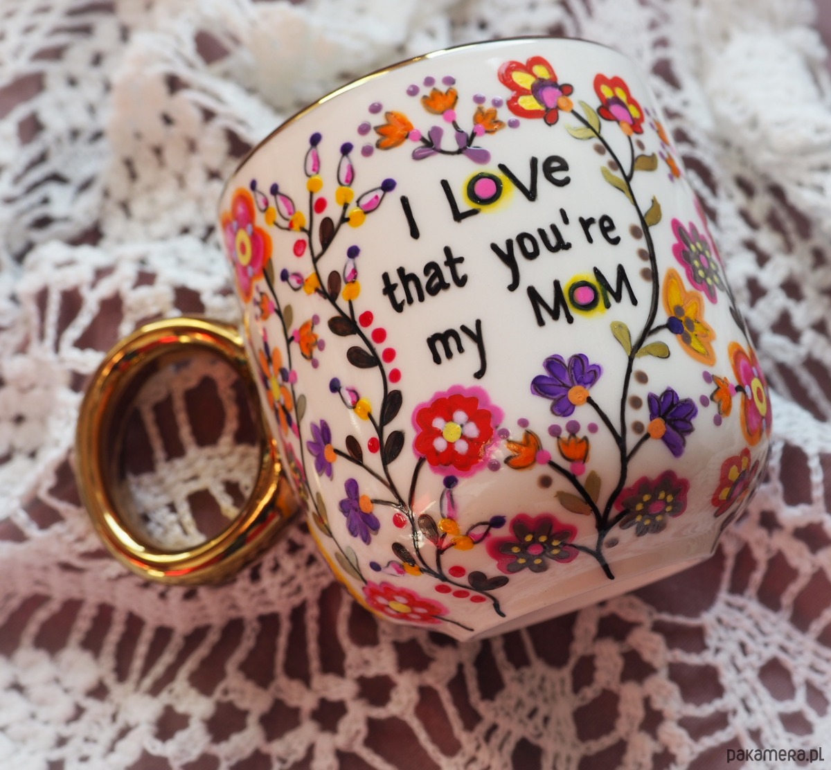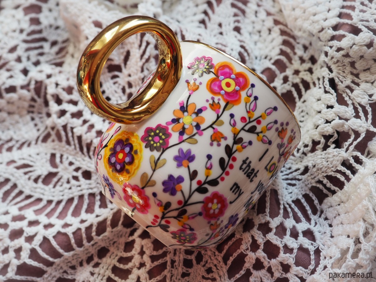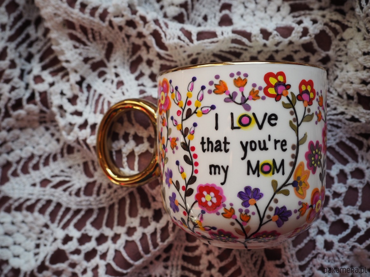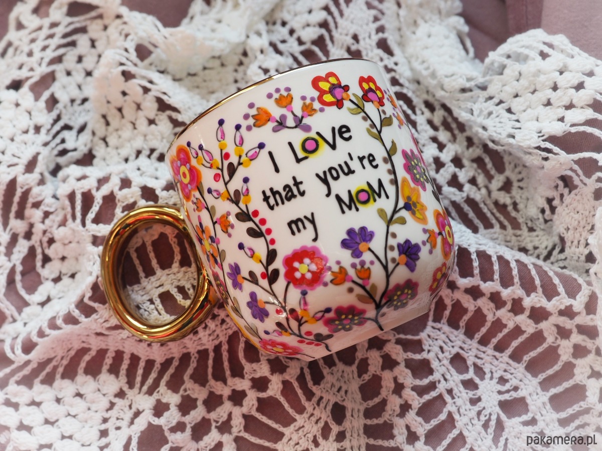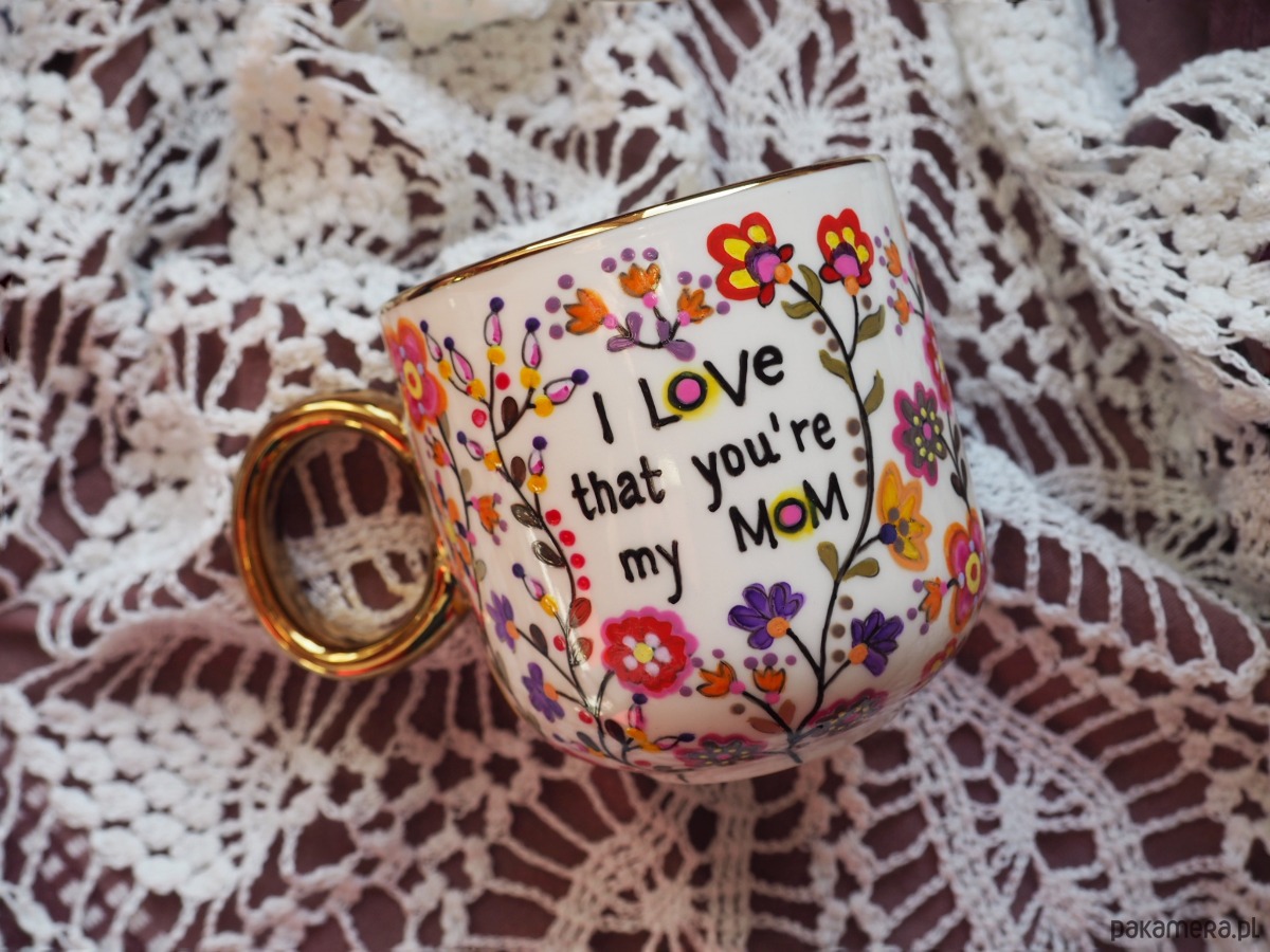 Ręcznie malowany kubek z napisem "I love that you're my mom" i kolorowym kwiatowym wzorem to doskonały prezent na Dzień Matki, urodziny lub imieniny Mamy, Mikołajki, Gwiazdkę lub zwykły dzień, w którym chcesz wywołać uśmiech na Jej twarzy.