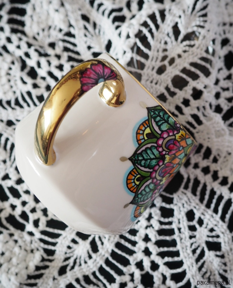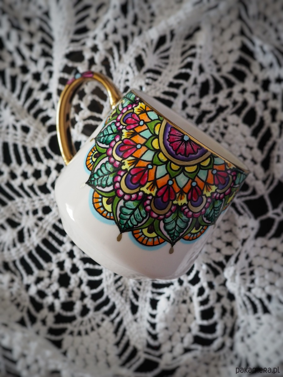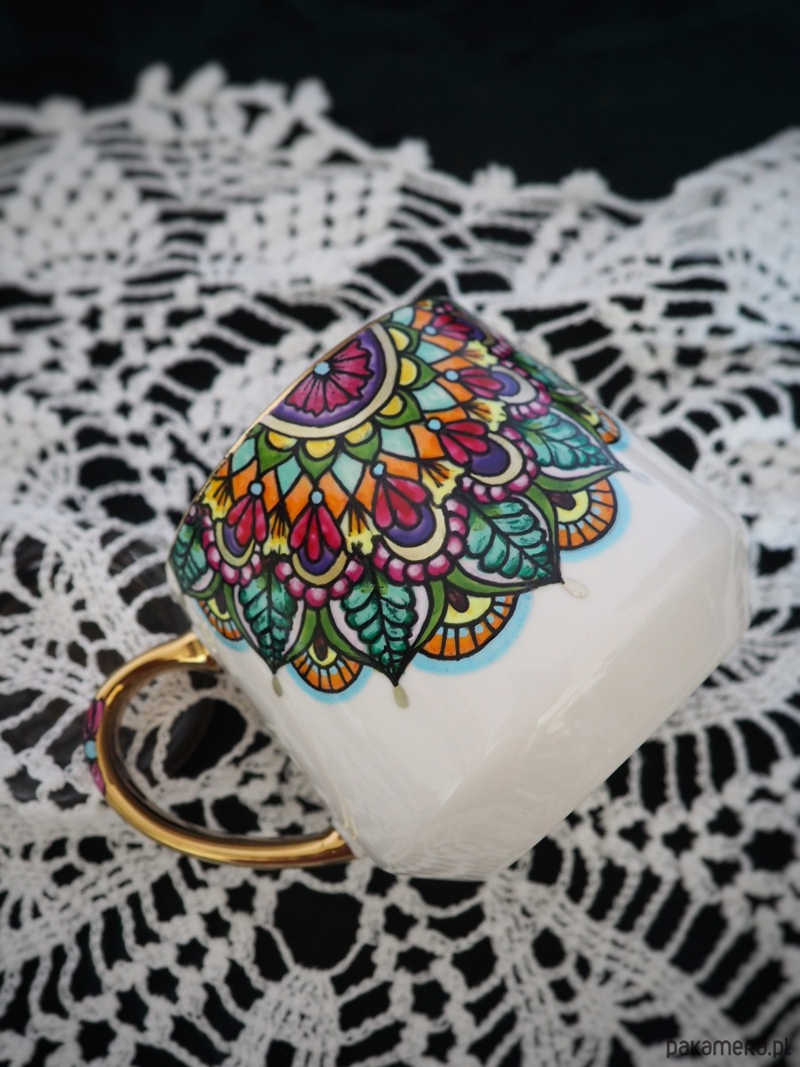 Wzór wykonany został przy użyciu nietoksycznych farb do porcelany, jest wodoodporny - naczynie może być myte ręcznie, bez użycia ostrych narzędzi.
