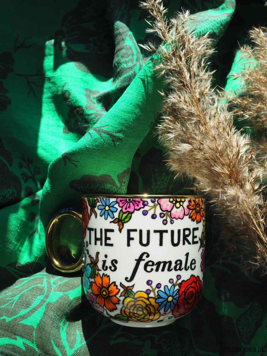 Ręcznie malowany kubek w kwiaty z napisem "The future is female", idealny dla każdego, kto wierzy w siłę i moc kobiet.
