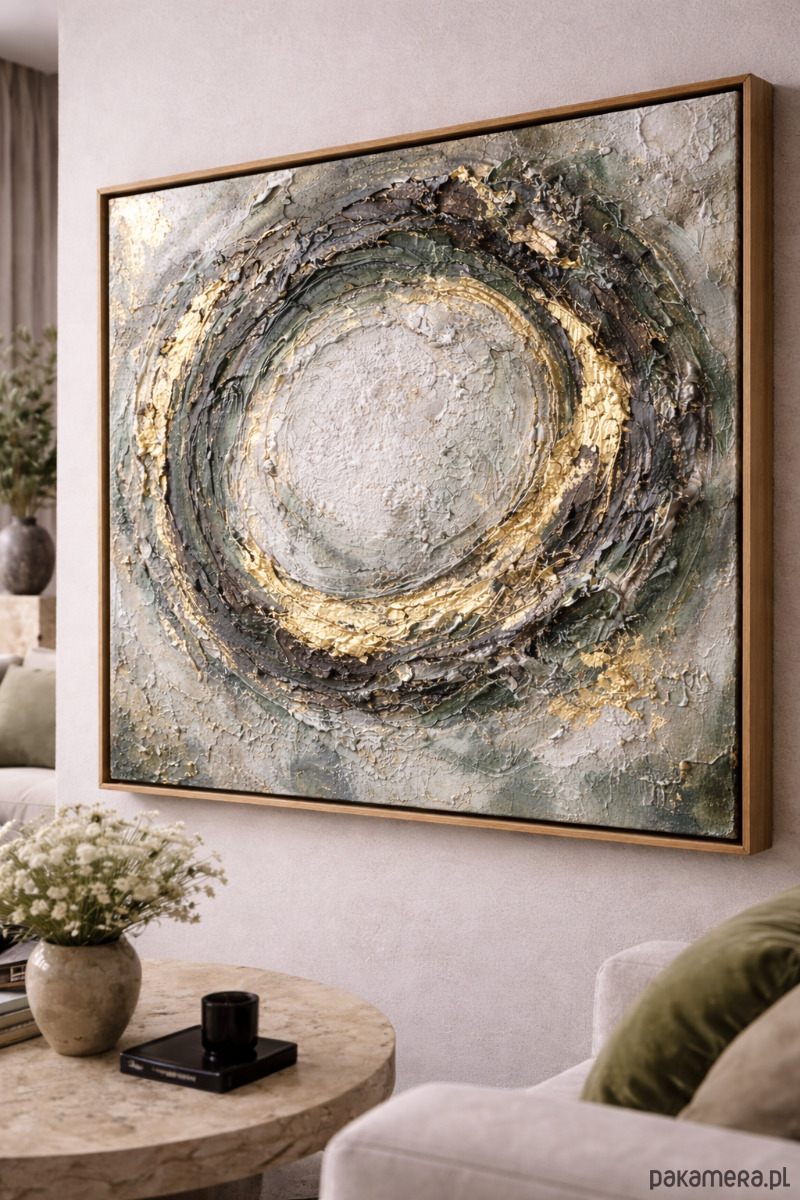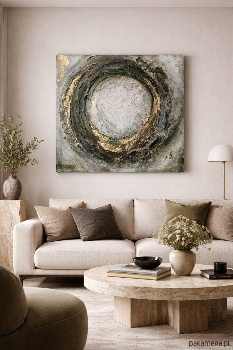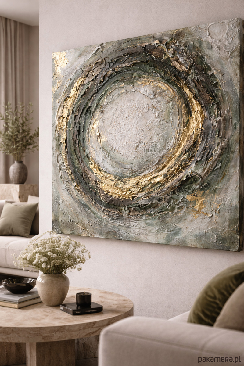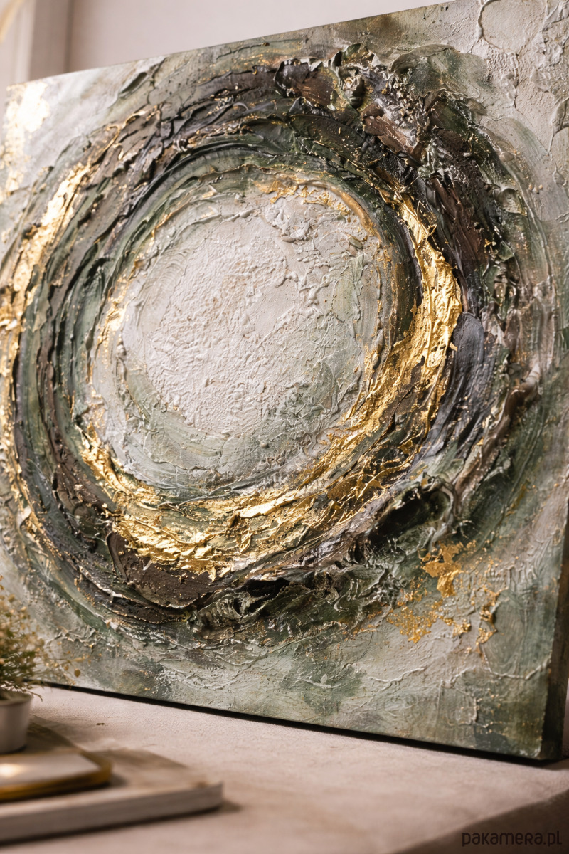 To praca, która łączy spokój jasnego centrum z dynamiczną, warstwową strukturą wokół. Grube faktury, nieregularne pociągnięcia i subtelne złote akcenty tworzą efekt głębi, który zmienia się w zależności od światła i kąta patrzenia.