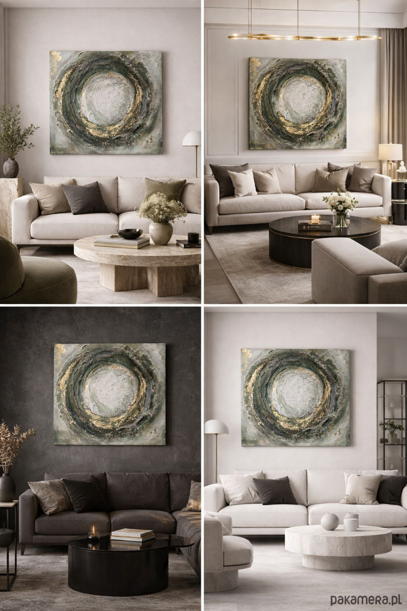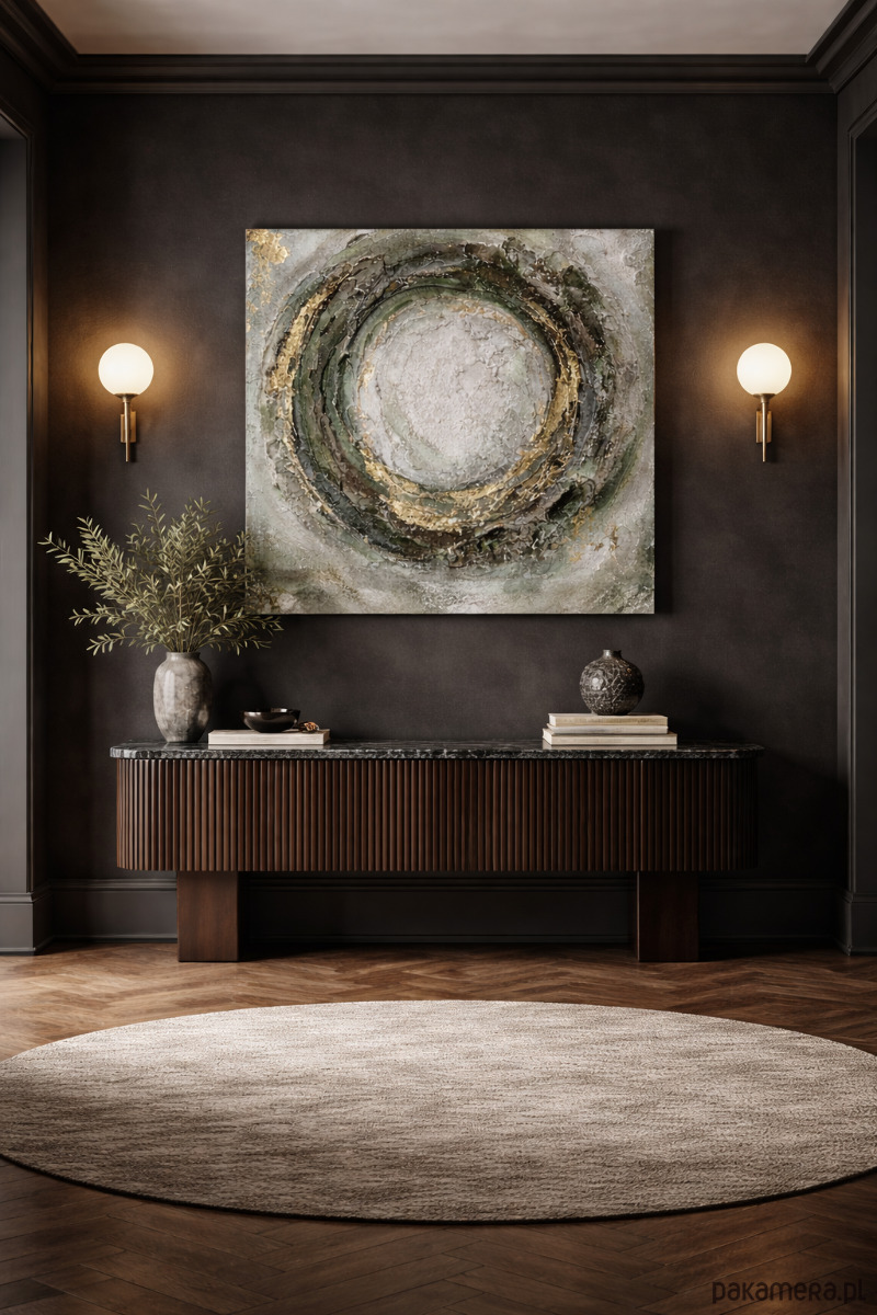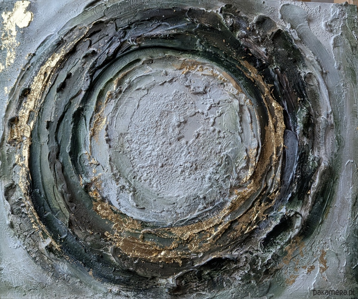 To praca, która łączy spokój jasnego centrum z dynamiczną, warstwową strukturą wokół. Grube faktury, nieregularne pociągnięcia i subtelne złote akcenty tworzą efekt głębi, który zmienia się w zależności od światła i kąta patrzenia.