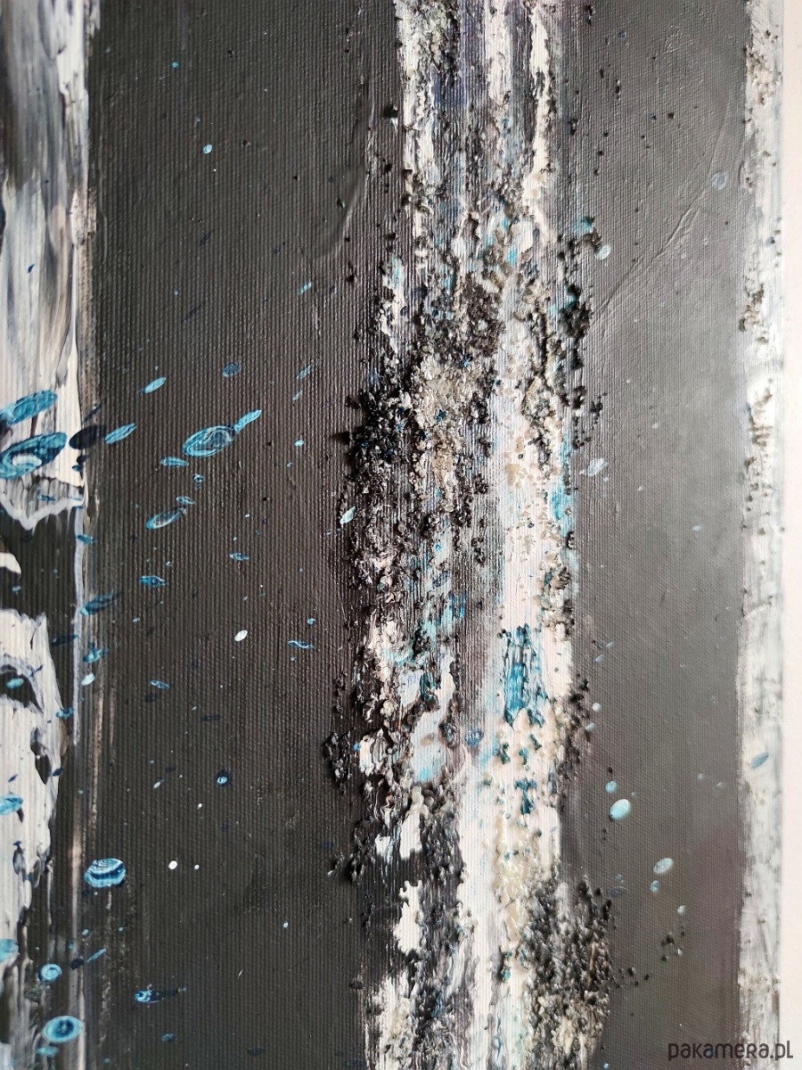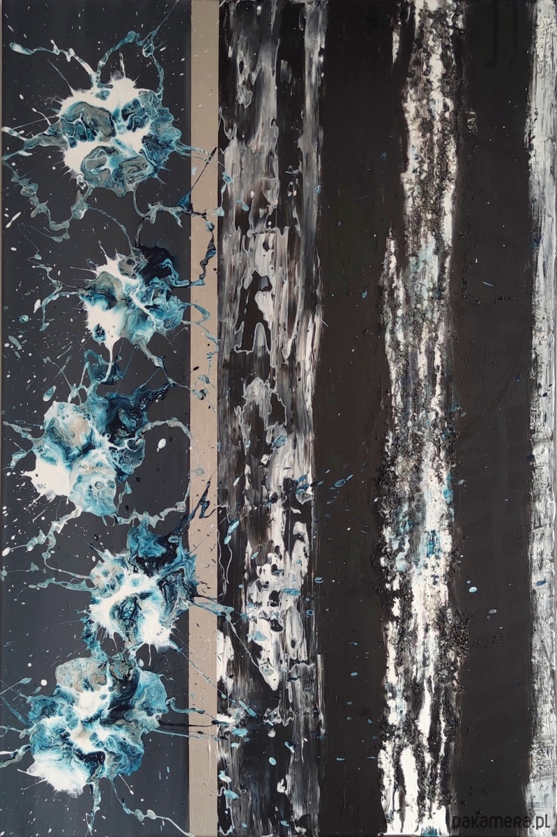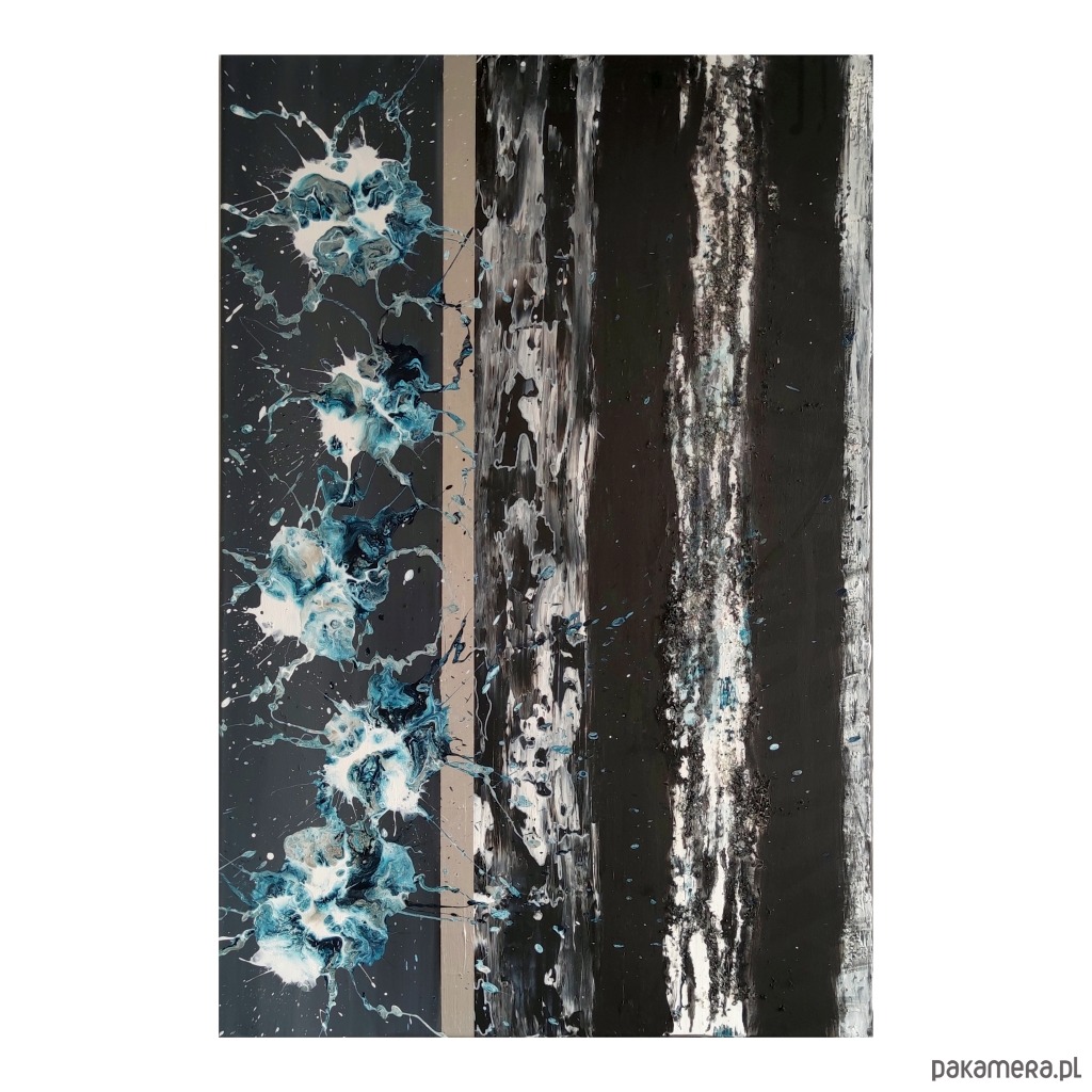 Duży obraz abstrakcyjny, który łączy kilka technik pracy z farbami akrylowymi. Obraz posiada wyraźną strukturę, kryształowe grudki i ciemną, intrygującą kolorystykę. Pomimo z pozoru ciężkich kolorów, kwiatami wyraża lekkość i piękno, dostarczając kontrastu, może skłaniając do refleksji?...