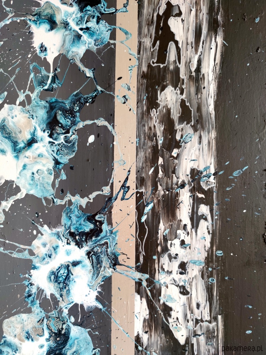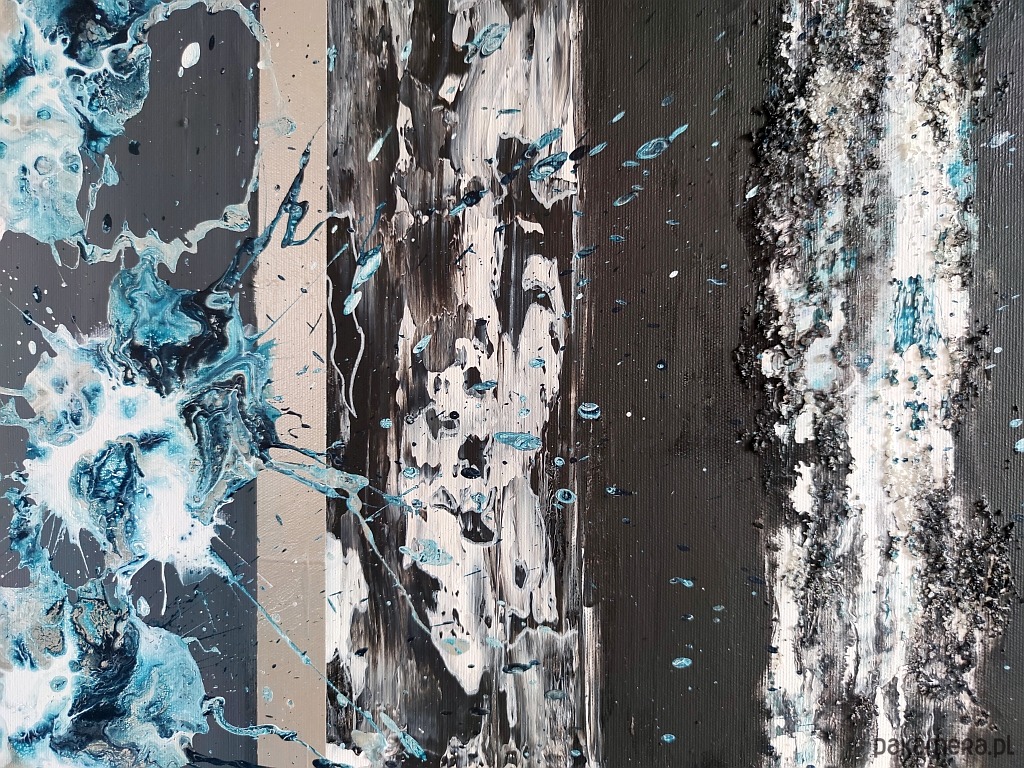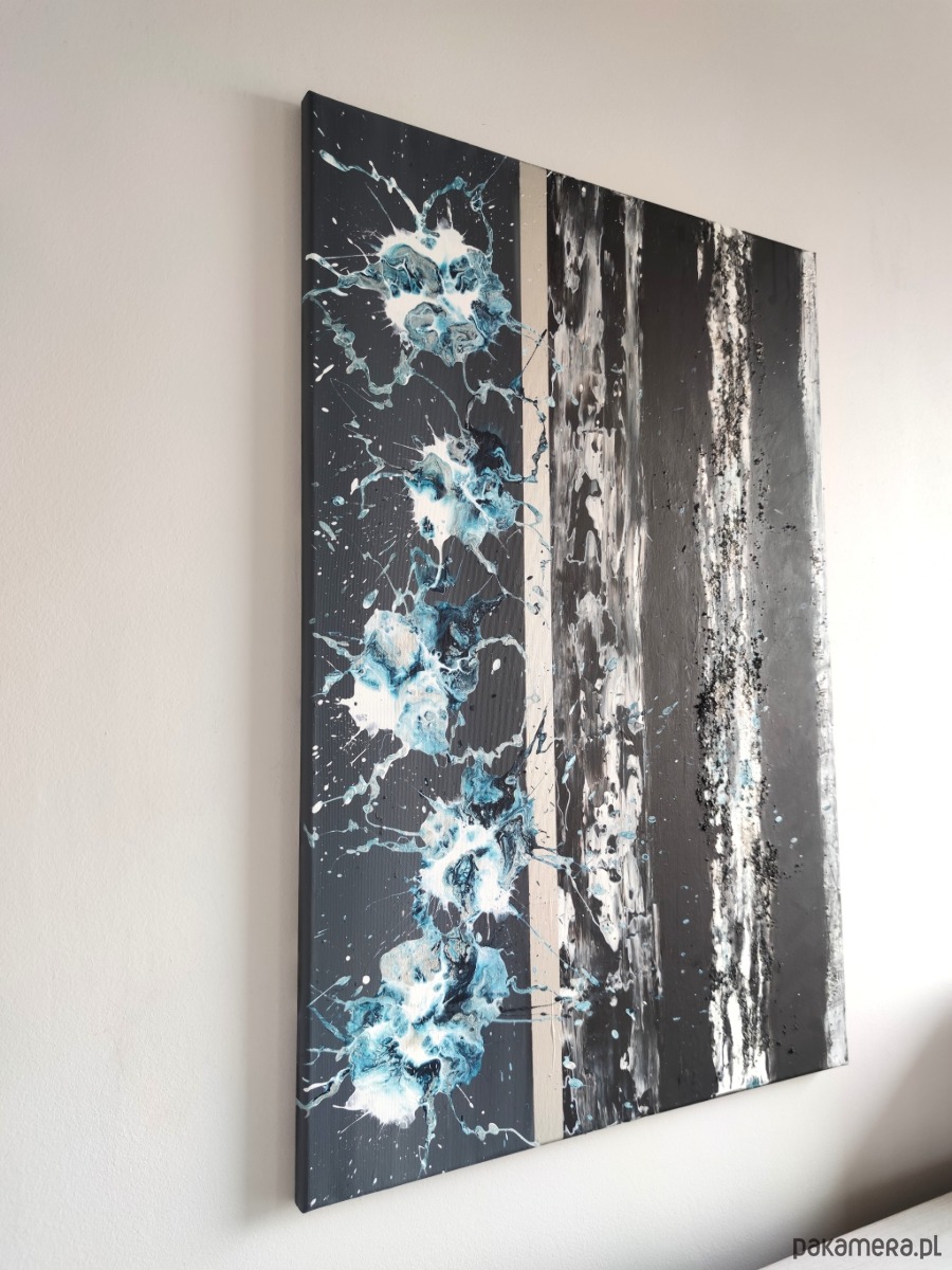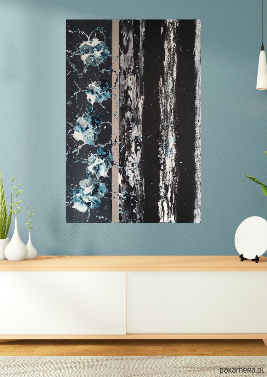 Duży obraz abstrakcyjny, który łączy kilka technik pracy z farbami akrylowymi. Obraz posiada wyraźną strukturę, kryształowe grudki i ciemną, intrygującą kolorystykę. Pomimo z pozoru ciężkich kolorów, kwiatami wyraża lekkość i piękno, dostarczając kontrastu, może skłaniając do refleksji?...