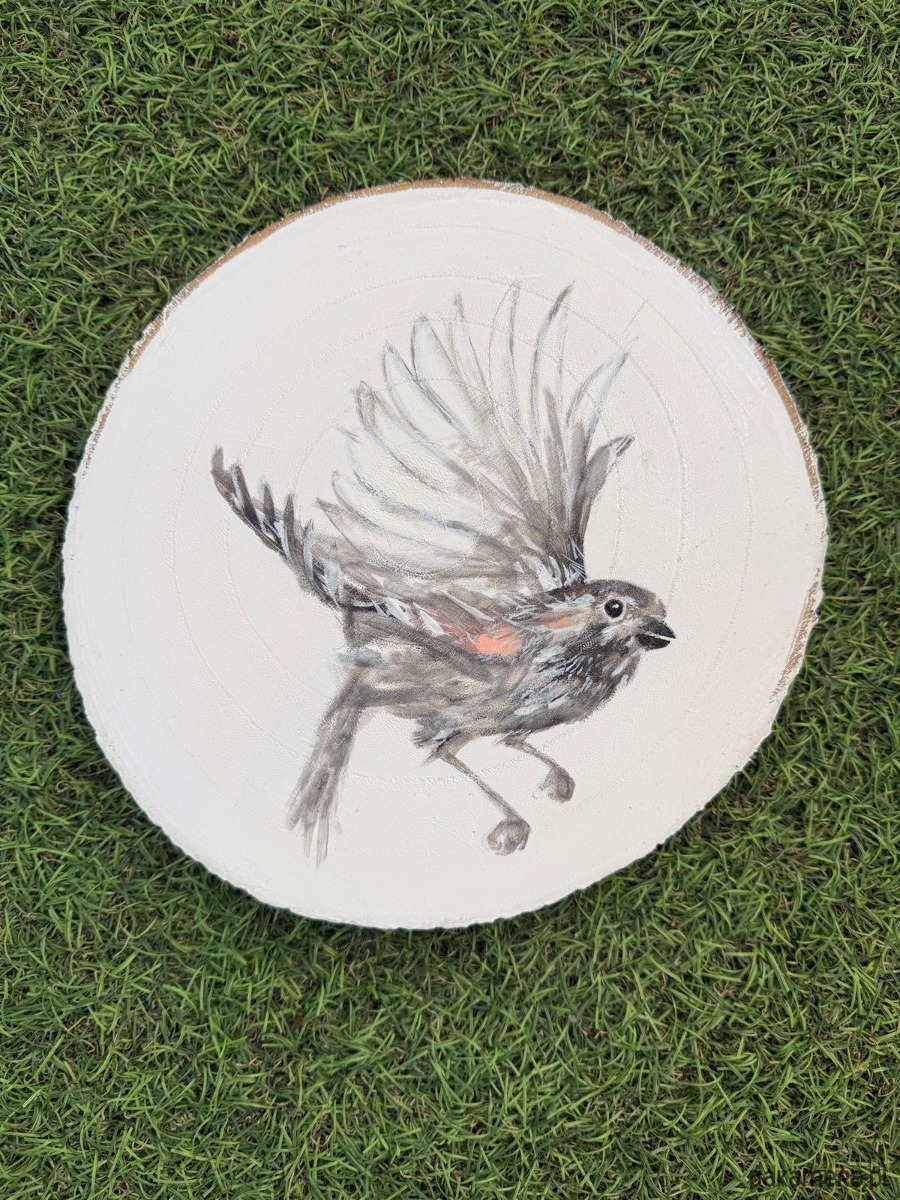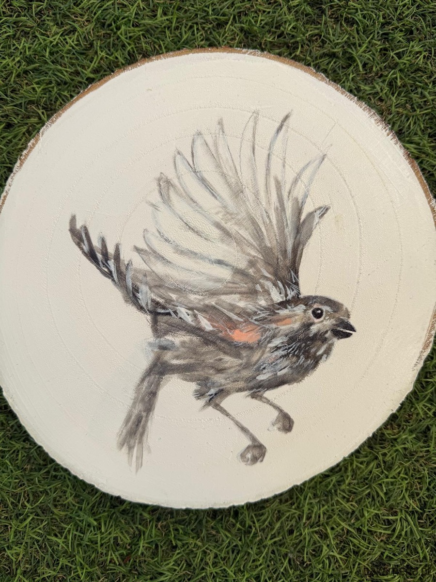 Ręcznie malowany obrazek na plastrze drewna "Wróbel w locie"