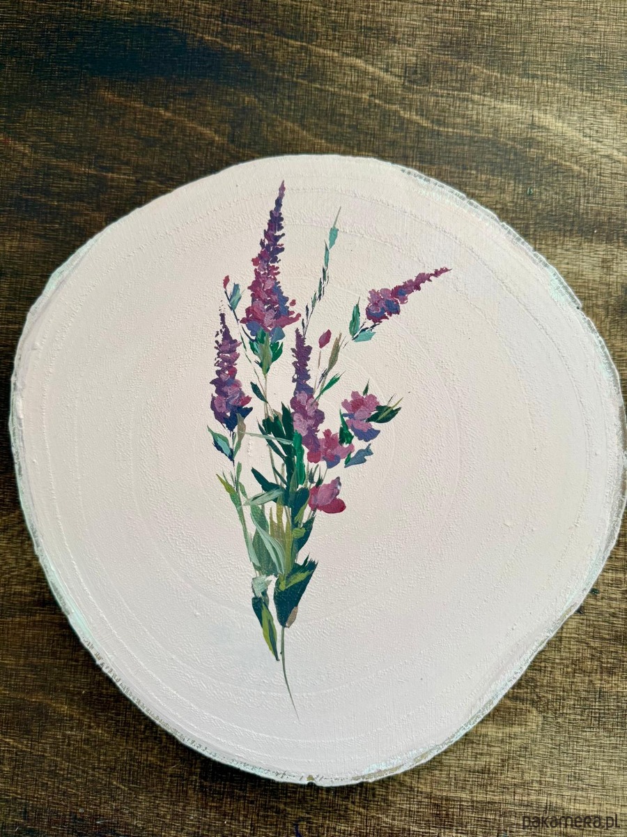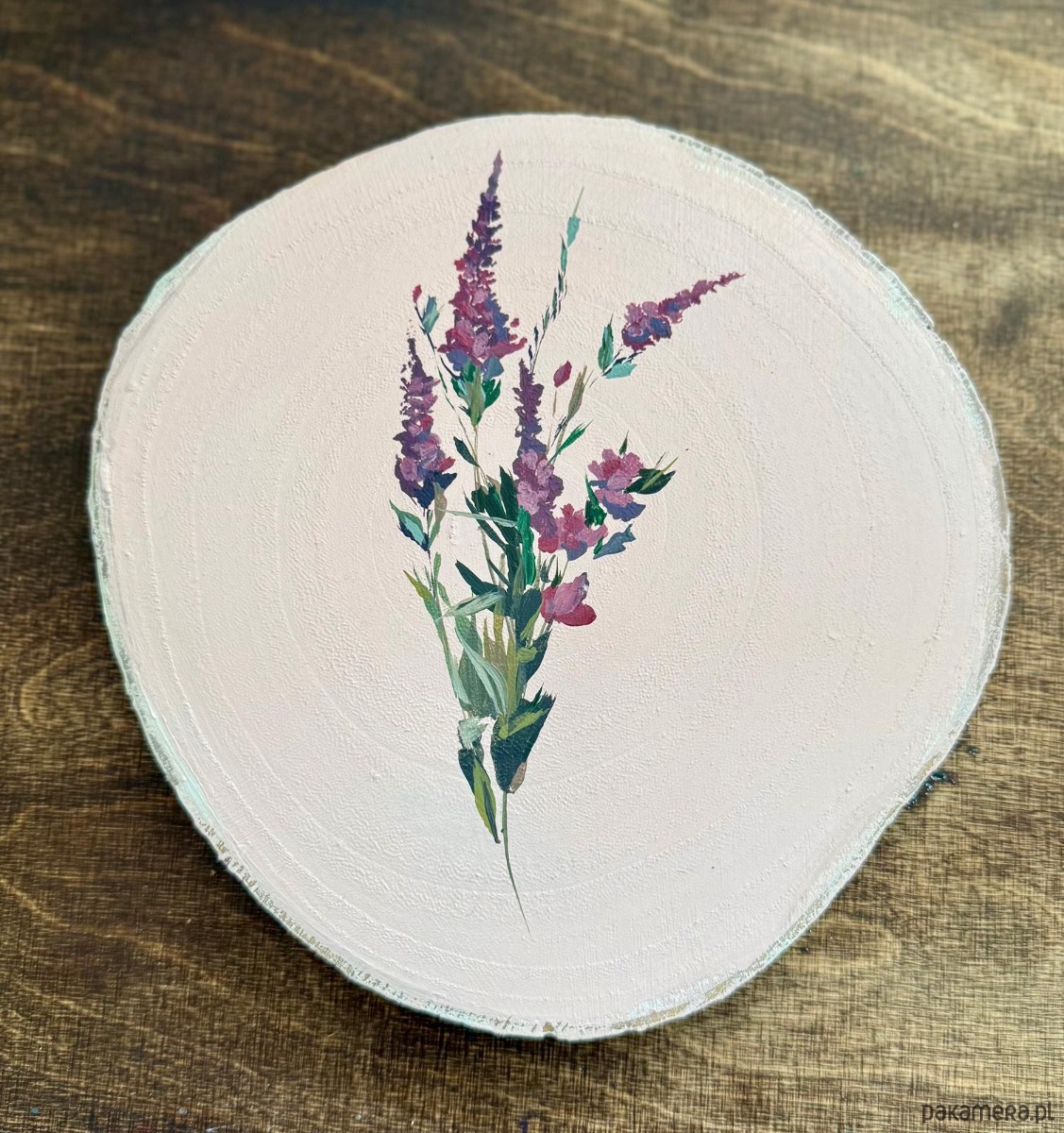 Ręcznie malowany obrazek na plastrze drewna "Wrzos"