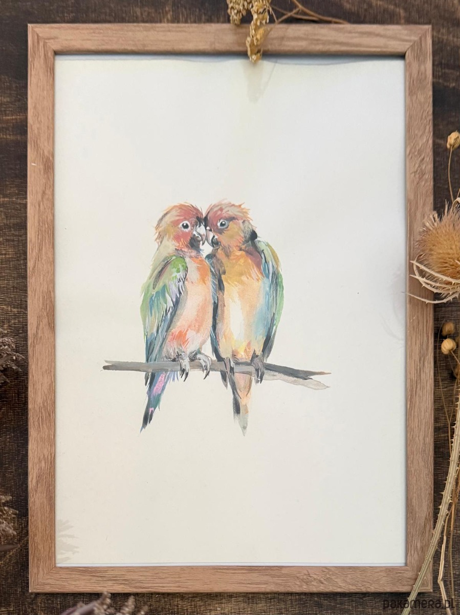 Poszukujesz wyjątkowego prezentu na Walentynki ? Marzysz o nietuzinkowej ozdobie swojego wnętrza? Ten ręcznie malowany obrazek "Papużki nierozłączki" będzie idealnym wyborem ! Malowany farbami akwarelowymi na wysokiej jakości papierze akwarelowym. Oprawiony w stylową, drewnianą ramę.