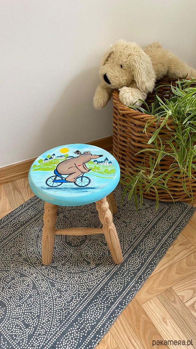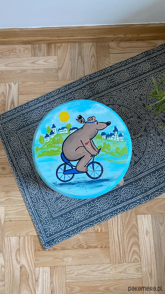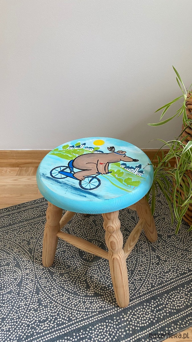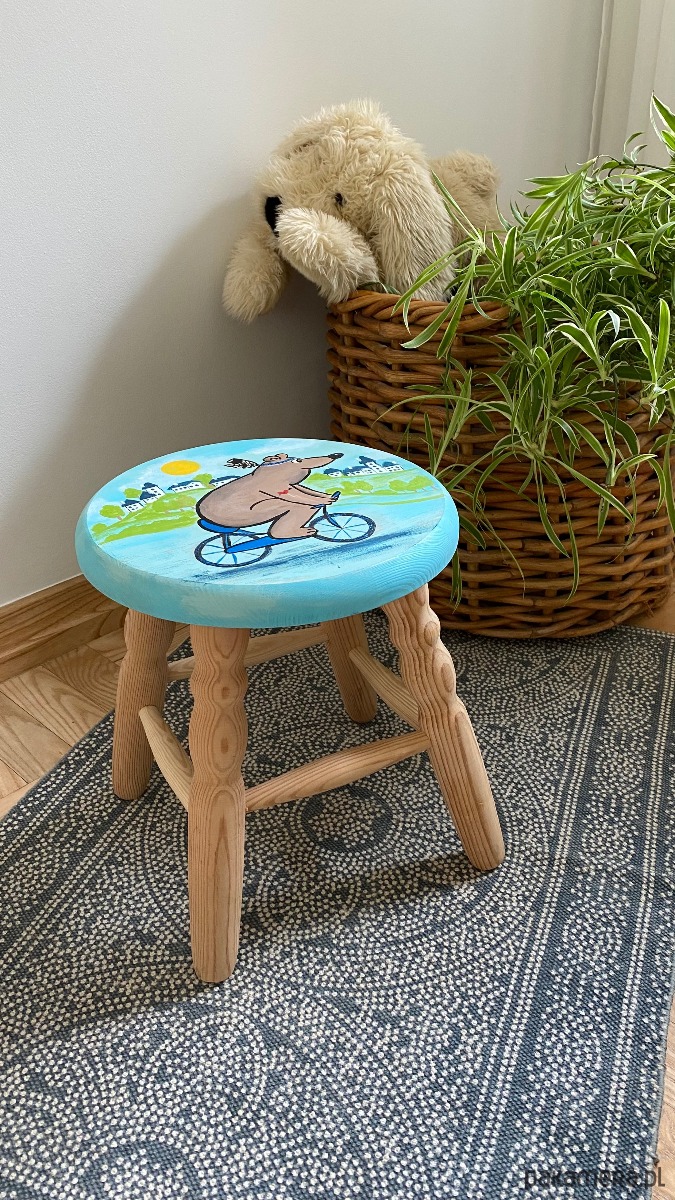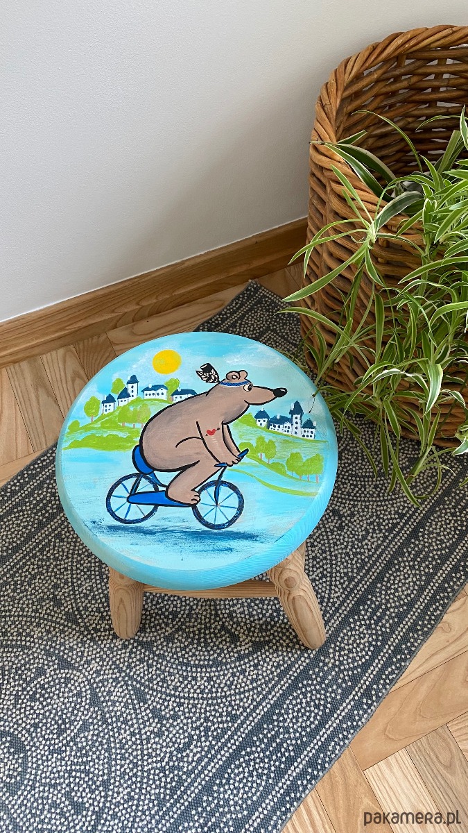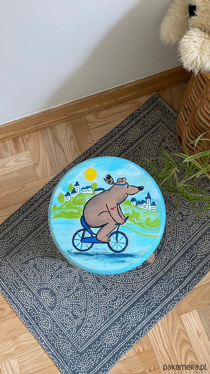 Ręcznie malowany stołek dziecięcy - Miś na rowerze - pamiątka na lata