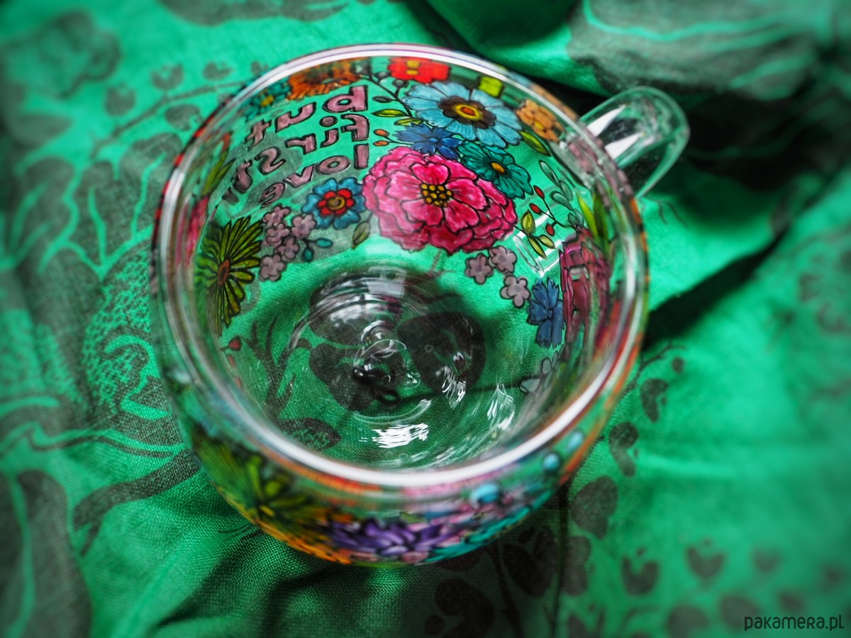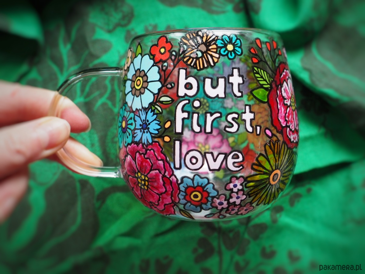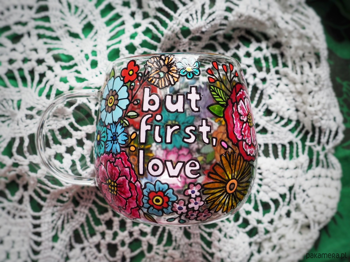 Ręcznie malowany szklany kubek z podwójnymi ściankami, w żywych kolorach, z kwiatowym wzorem i napisem "But first, love" będzie doskonałym podarunkiem dla kochanej osoby.
