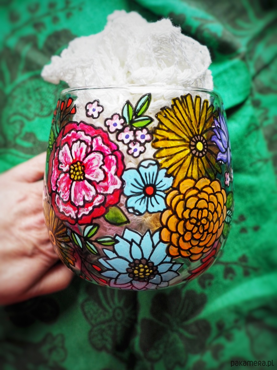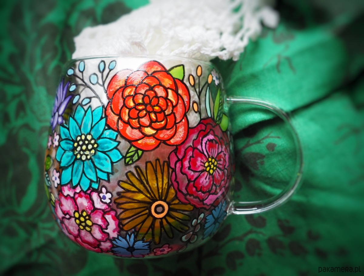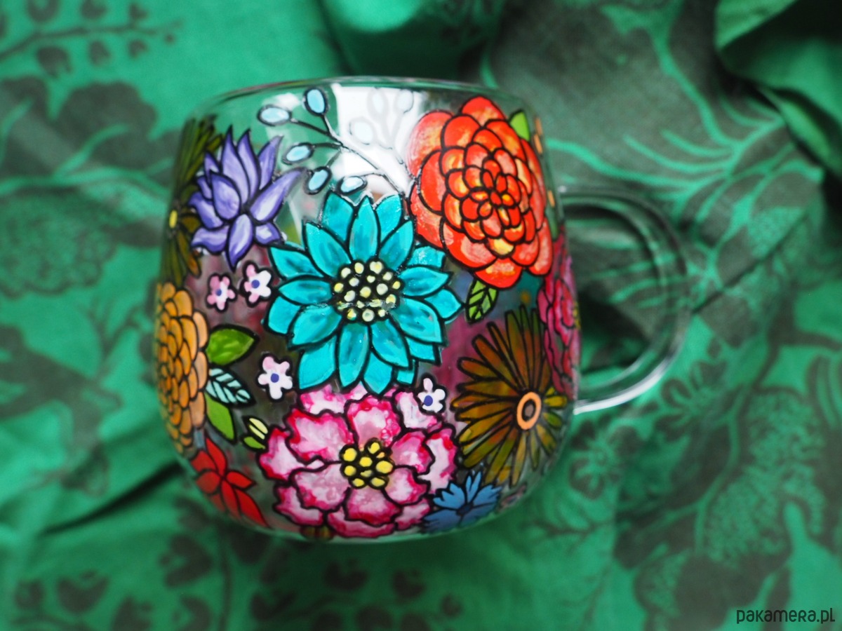 Ręcznie malowany szklany kubek z podwójnymi ściankami, w żywych kolorach, z kwiatowym wzorem i napisem "But first, love" będzie doskonałym podarunkiem dla kochanej osoby.