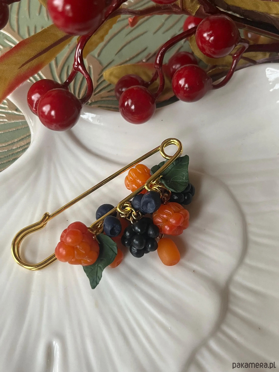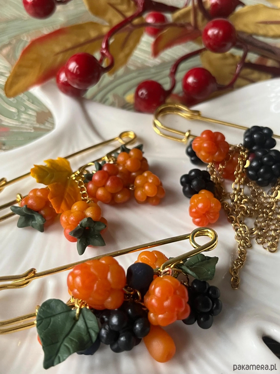 Ta unikalna broszka w kształcie agrafki została ozdobiona realistycznymi miniaturkami jagód moroszki (rubus chamaemorus), wykonanymi ręcznie z najwyższą precyzją. Idealna dla miłośników leśnych klimatów, natury i oryginalnych dodatków.