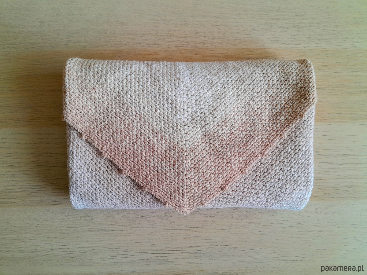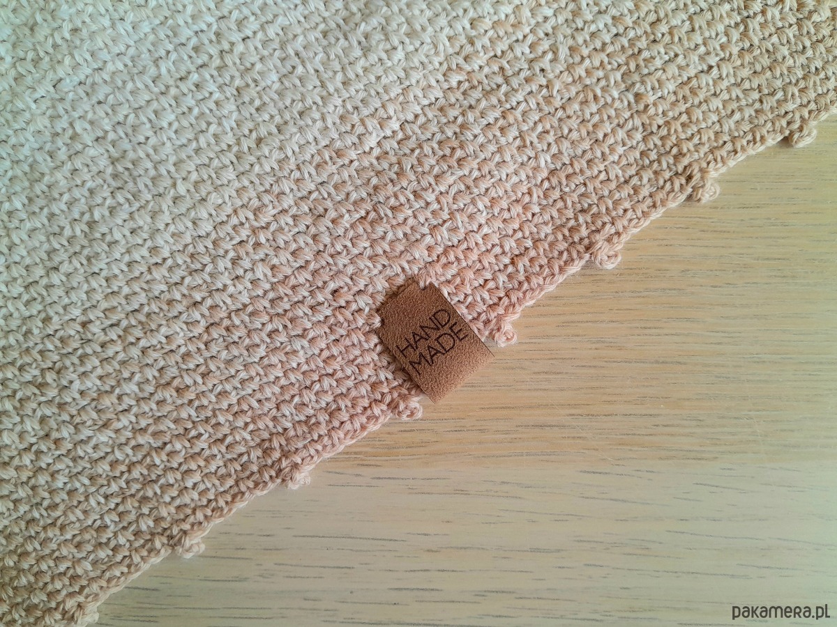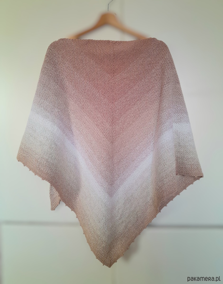 Ręcznie robiona chusta o wymiarach ok. 80 × 160 cm, wykonana z mieszanki 50% wełny merino i 50% akrylu.