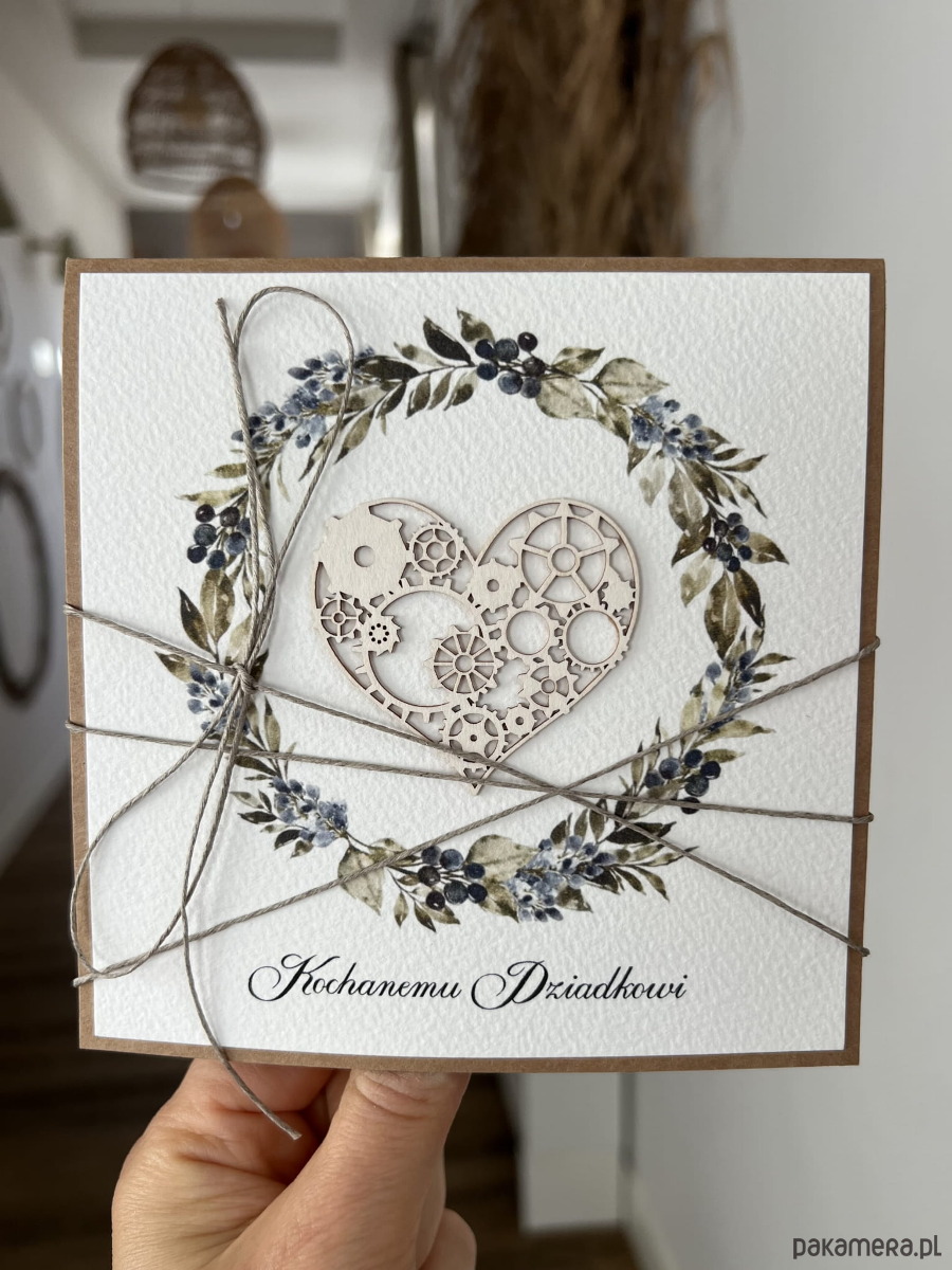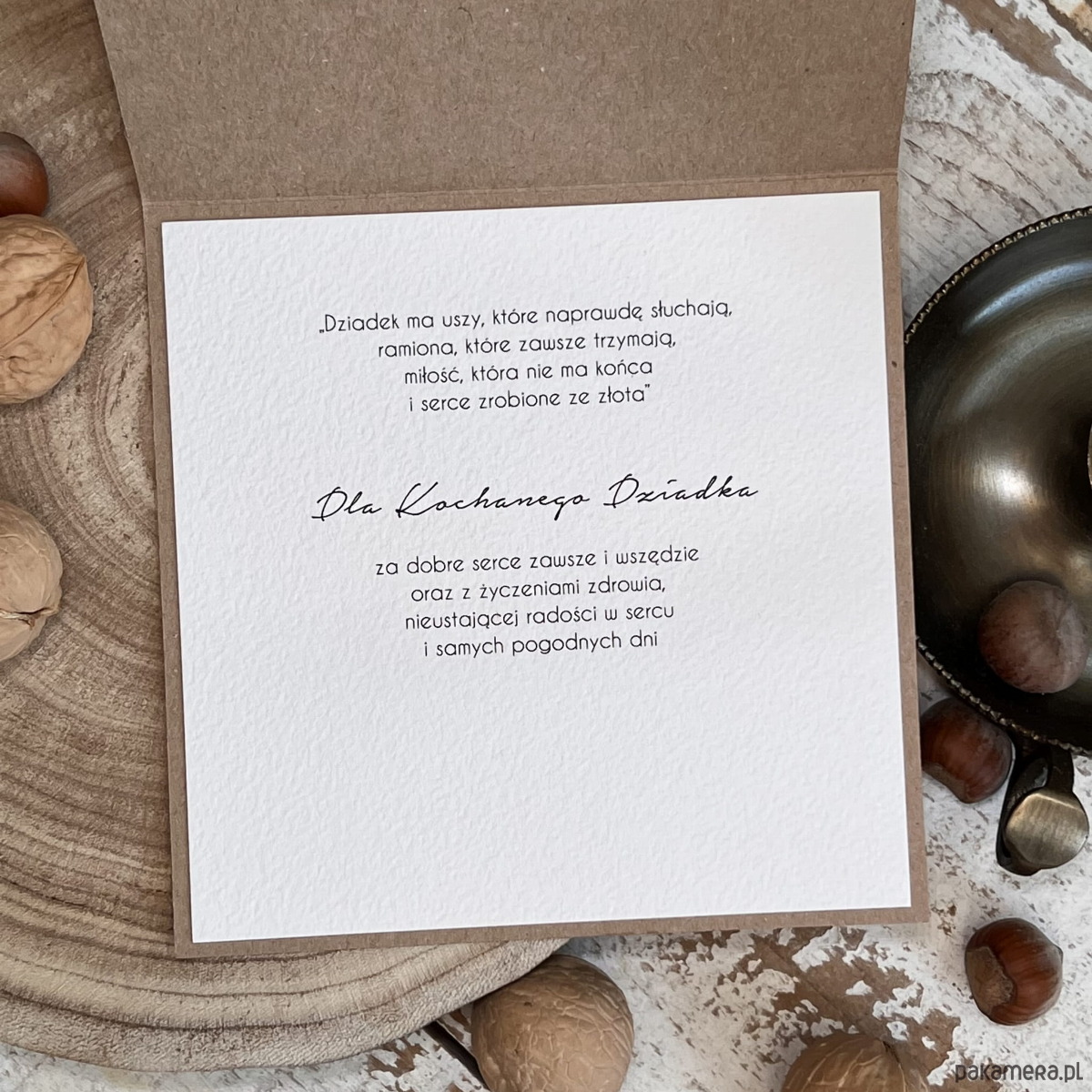 Wymiar kartki 14x14 cm w zestawie z brązową kopertą. Kartka przewiązana lnianym sznureczkiem.