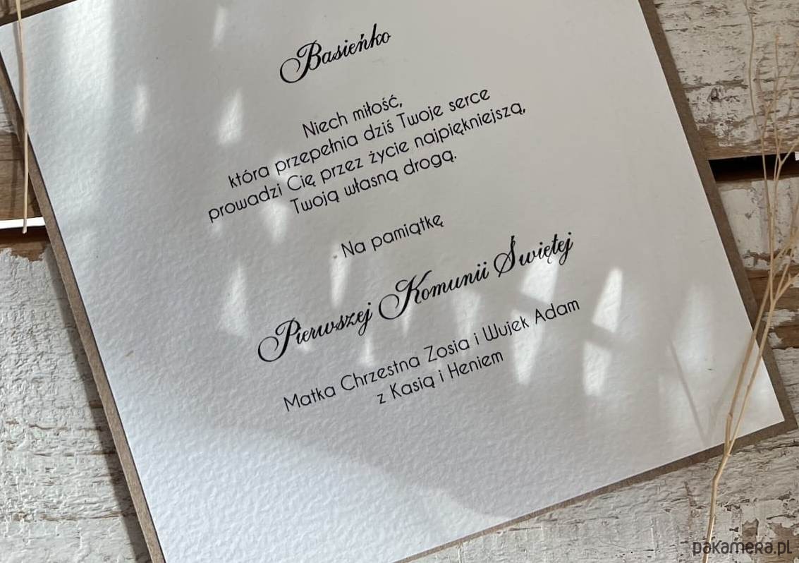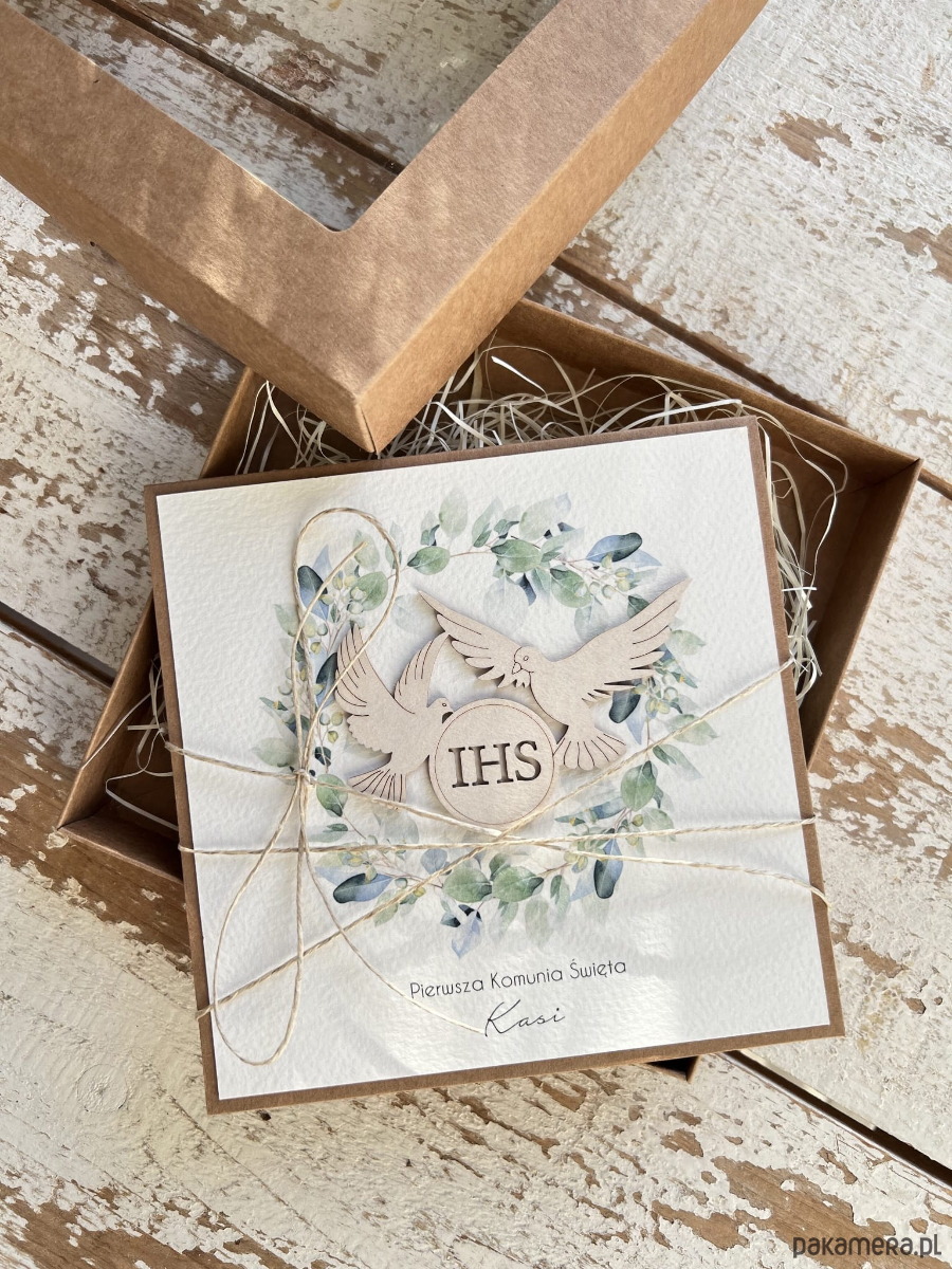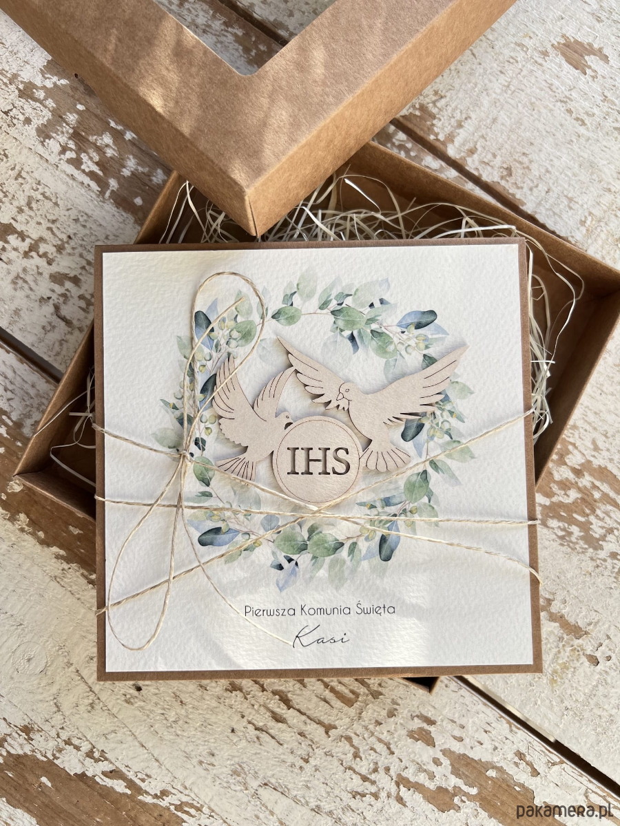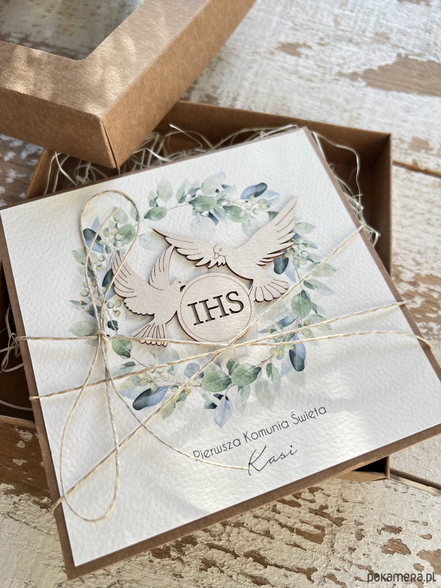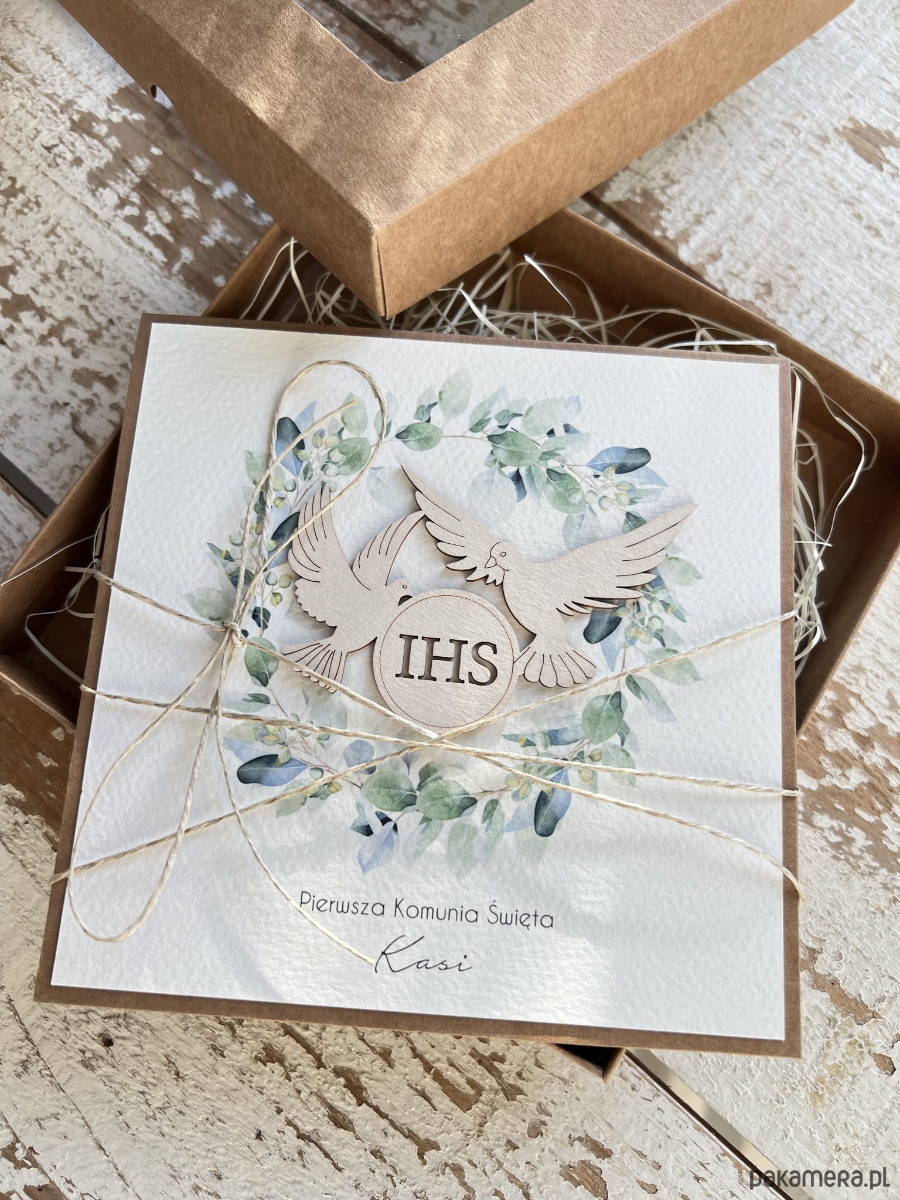 Ręcznie robiona kartka komunijna z personalizacją w wianku