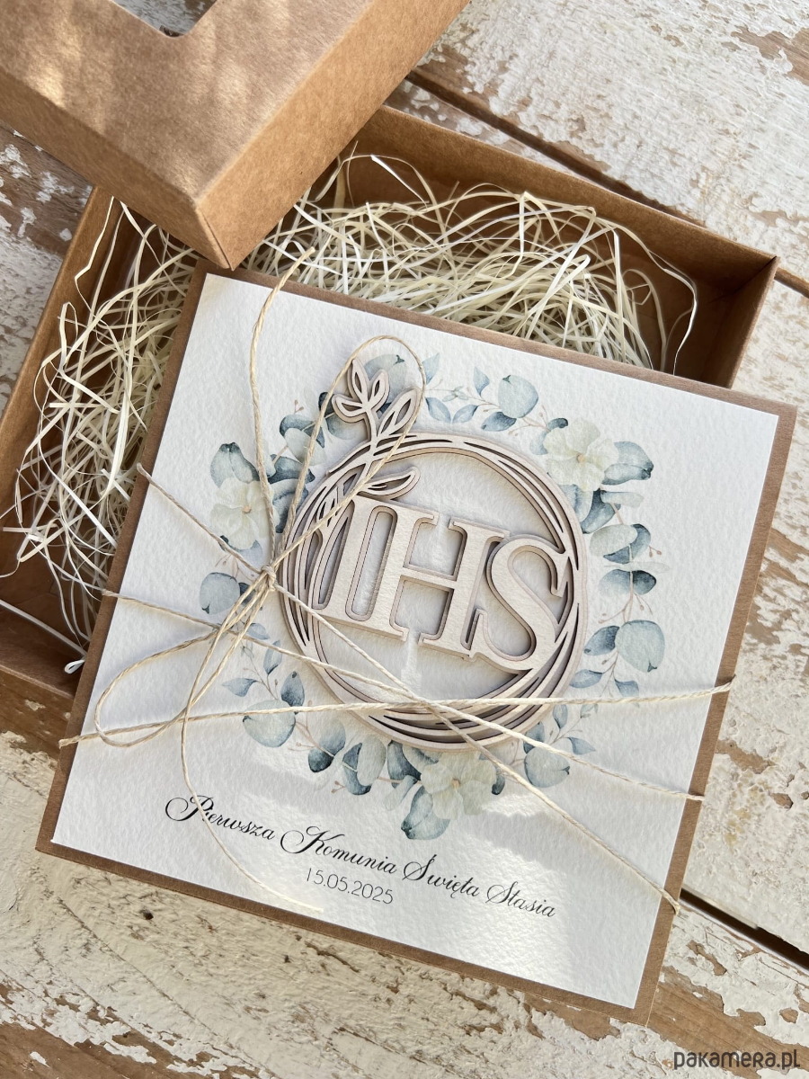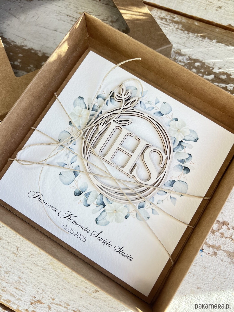 Ręcznie robiona kartka komunijna z personalizacją w wianku od ojca chrzestneg