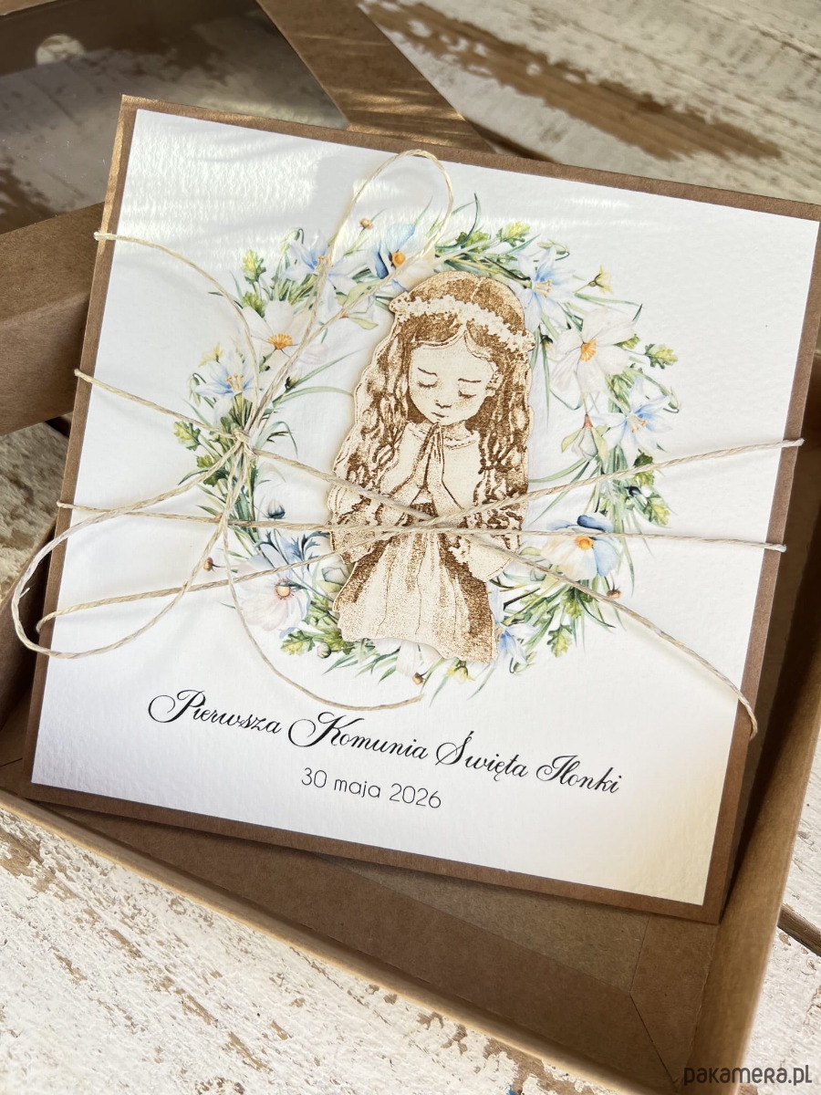 Ręcznie robiona kartka komunijna z personalizacją w wianku od ojca chrzestnego, matki chrzestnej - prezent na komunię dla chrześniaczki, życzenia komunijne