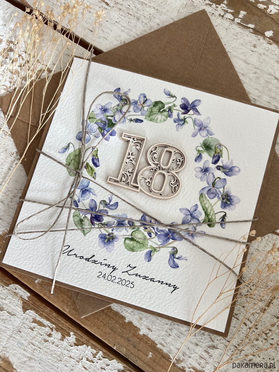 Ręcznie robiona kartka na 18 urodziny, osiemnastka - pomysł na prezent życzenia na osiemnastkę od matki chrzestnej - fiołki