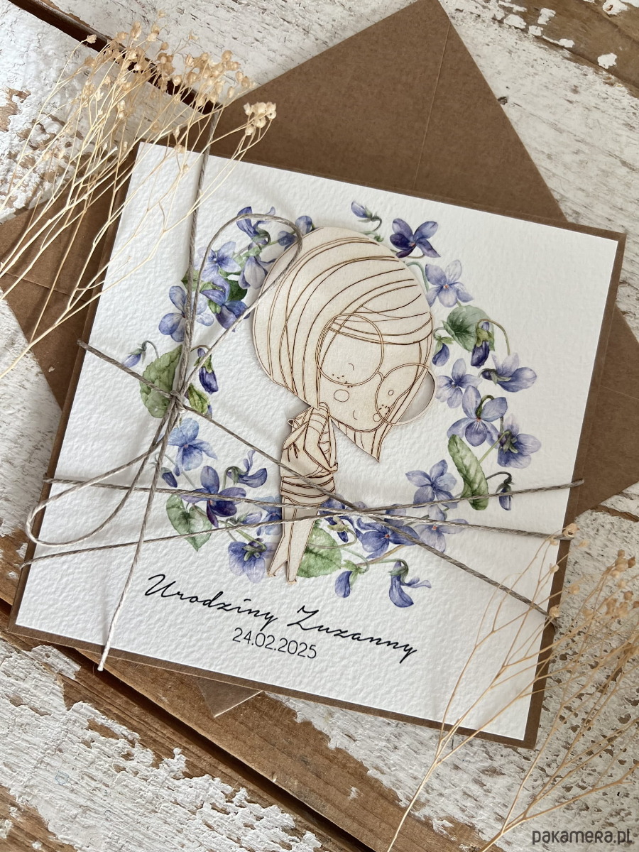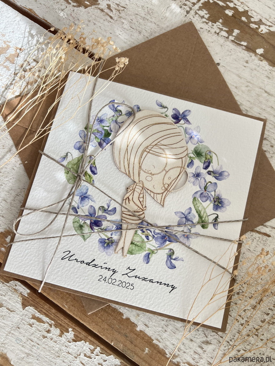Ręcznie robiona kartka na 18 urodziny, osiemnastka - pomysł na prezent życzenia na osiemnastkę od matki chrzestnej - fiołki