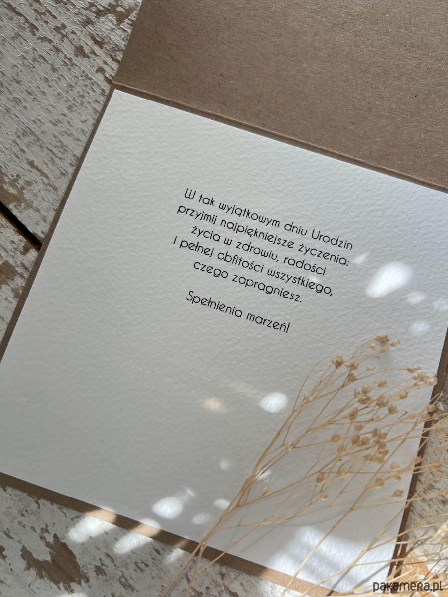 Kartka o wymiarach 14x14 cm wykonana na bazie papieru kraftowego z użyciem papieru bawełnianego oraz tekturkowych cyfr. Możliwość personalizacji za dopłatą.