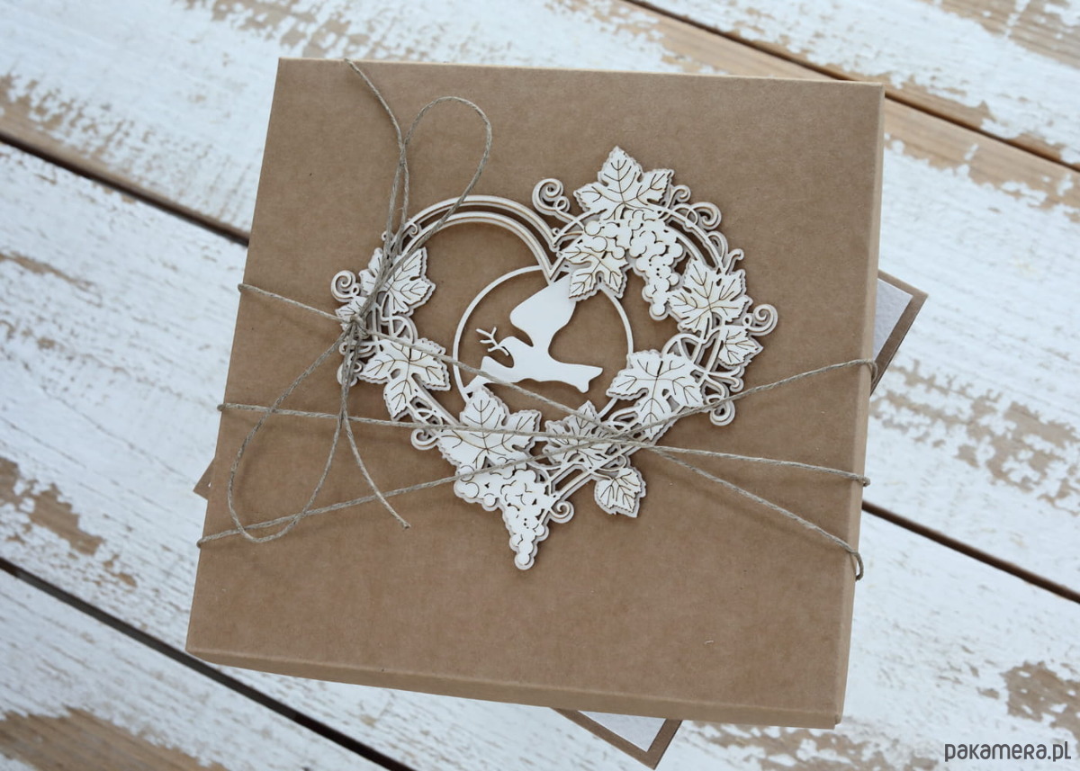 Kartka wykonana na bazie papieru kraftowego z dodatkiem papieru bawełnianego oraz tekturkowej ozdoby.