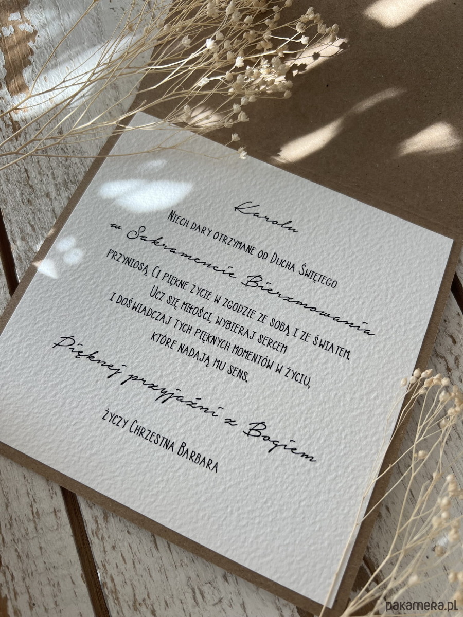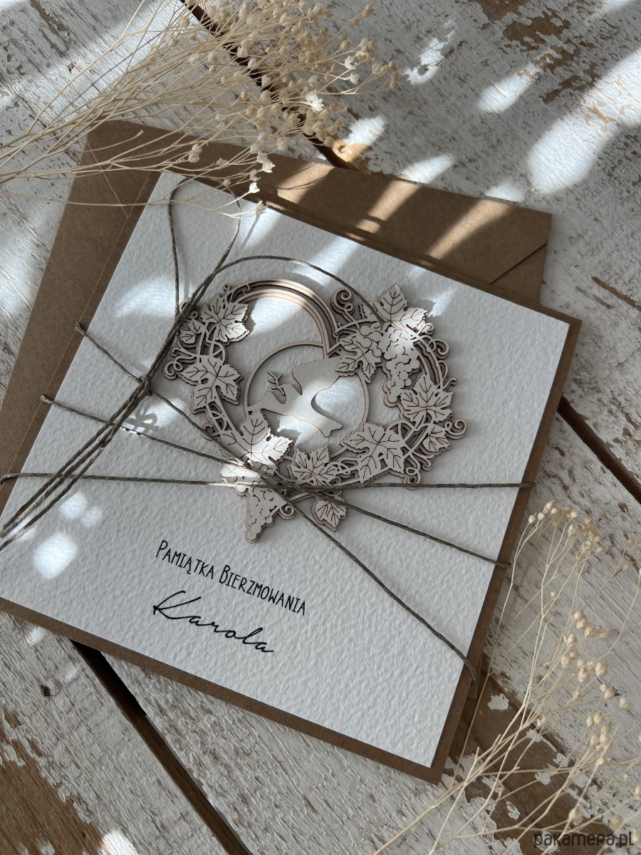 Wyjątkowa rustykalna kartka na bierzmowanie wykonana na bazie papieru kraftowego z użyciem starannie wyselekcjonowanego papieru bawełnianego w kolorze ecri oraz tekturkowej ozdoby. Kartka otwierana jest do góry. Przewiązana jest lnianym sznureczkiem. W zestawie brązowa koperta.