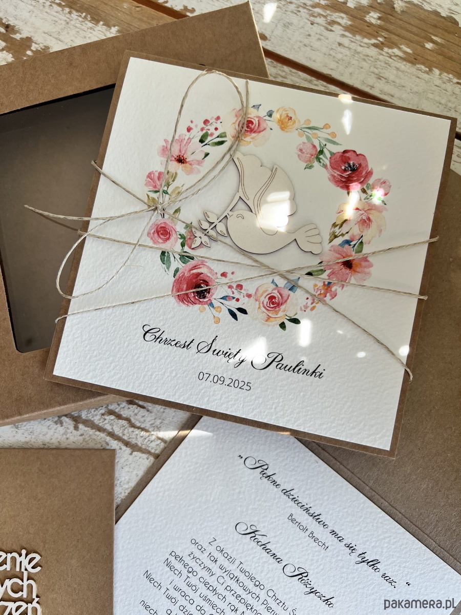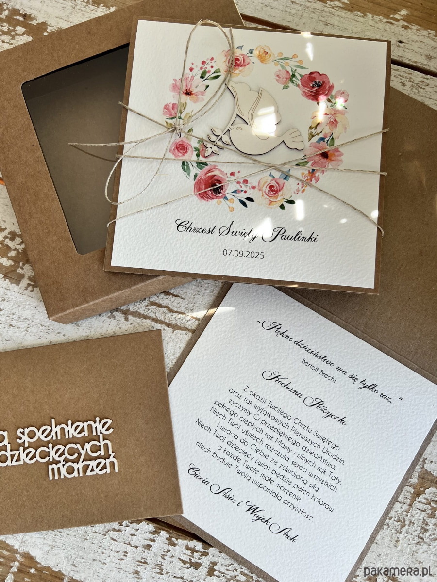 Personalizowana kartka na chrzest, pamiątka chrztu wykonana jest na bazie papieru kraftowego z użyciem starannie wyselekcjonowanego papieru bawełnianego w kolorze śmietanki z nadrukiem oraz tekturkową ozdobą. Kartka przewiązana jest lnianym sznureczkiem.
