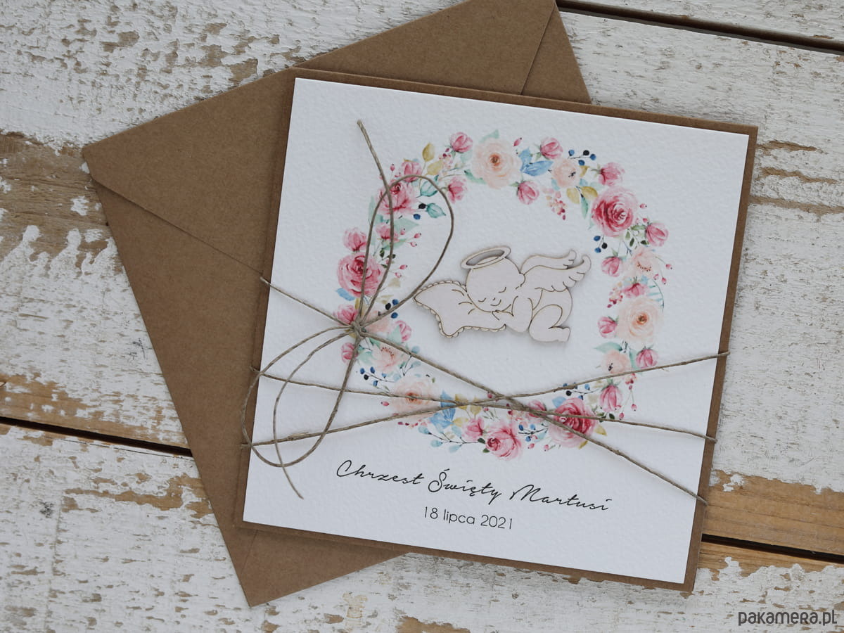 Ręcznie robiona kartka na chrzest dla dziewczynki z aniołkiem w wianku ecru