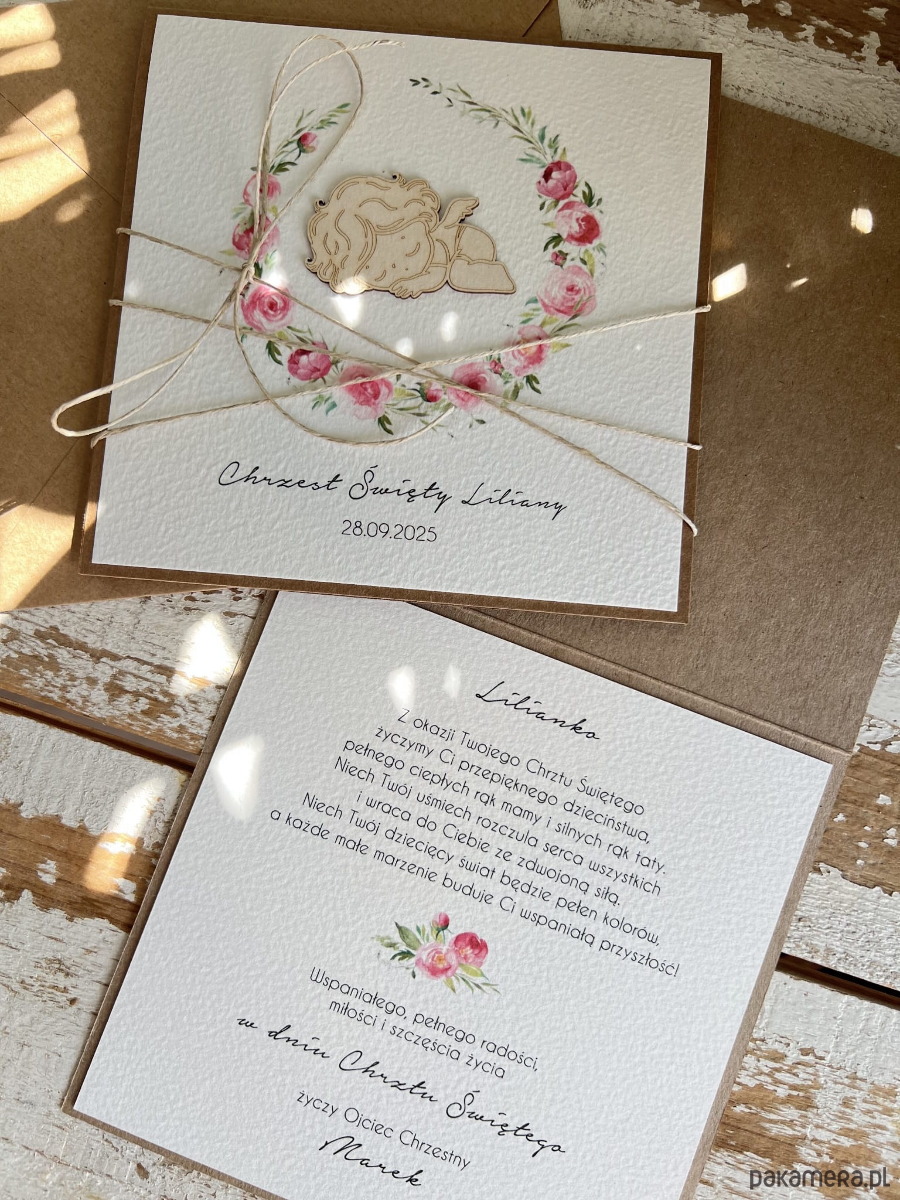 Rustykalna kartka na chrzest handmade wykonana na bazie papieru kraftowego z użyciem starannie wyselekcjonowanego papieru bawełnianego w kolorze ecri oraz tekturkowej ozdoby. Kartka otwierana jest do góry. Kartka przewiązana jest lnianym sznureczkiem.