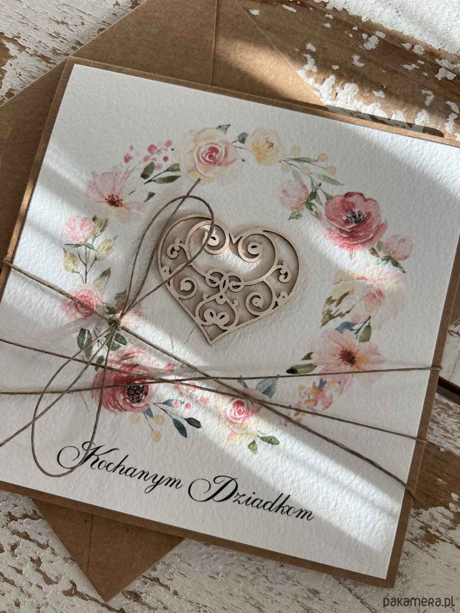 Wymiar kartki 14x14 cm w zestawie z brązową kopertą. Kartka przewiązana lnianym sznureczkiem.