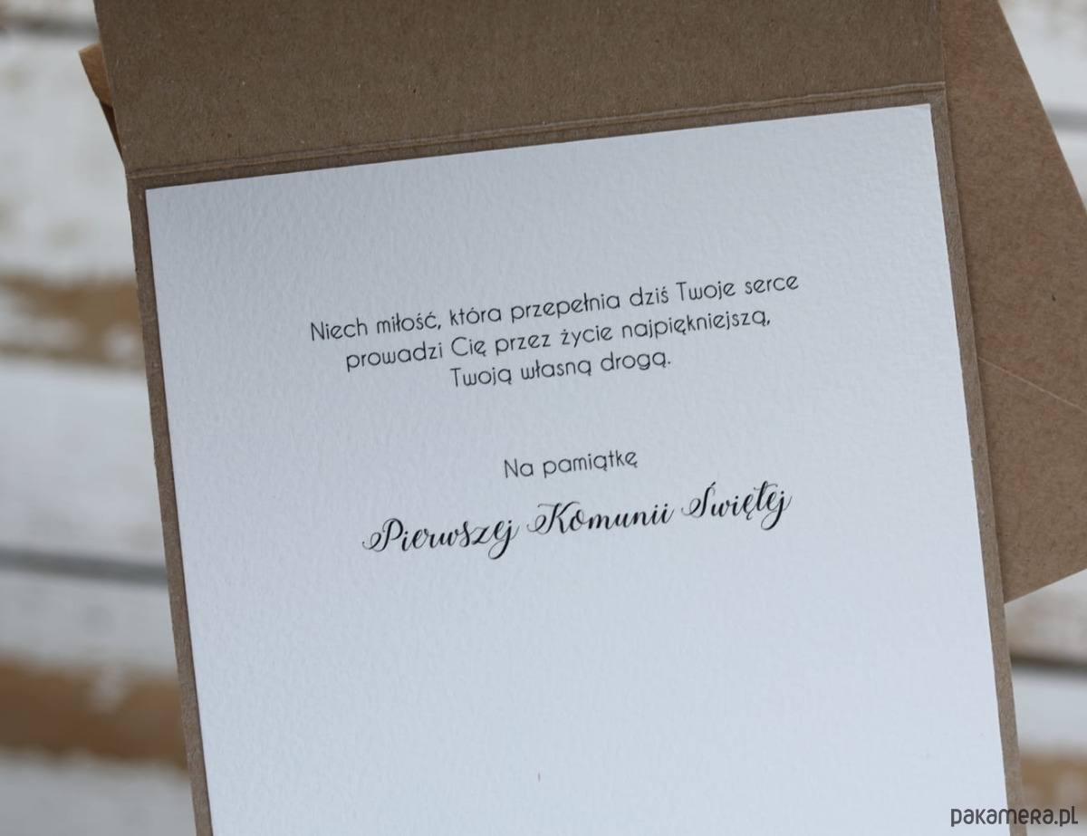 Kartka na komunię dla chłopca - pamiątka komunii o wymiarach 14x14 cm wykonana jest z papieru kraftowego oraz papieru bawełnianego w odcieniu śmietanki z użyciem ozdoby tekturkowej. Kartka otwierana do góry, w środku wklejona jest kartka z papieru bawełnianego z gotowymi życzeniami (brak możliwości zmiany). W zestawie z kopertą.