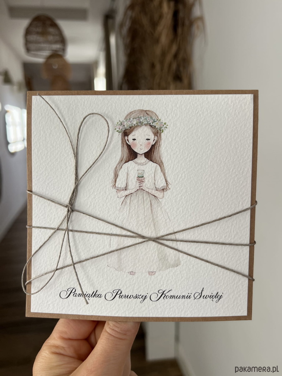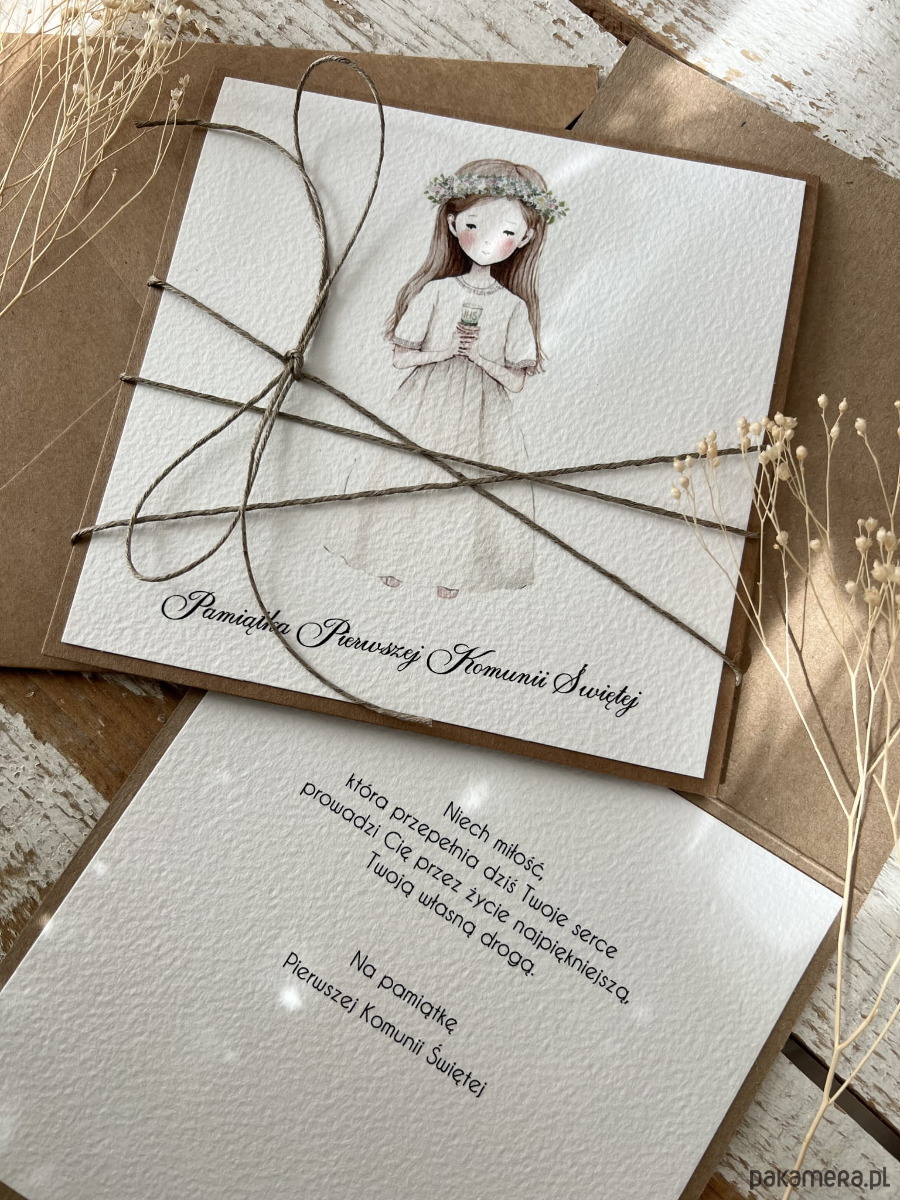 Kartka o wymiarach 14x14 cm wykonana jest z papieru kraftowego oraz papieru bawełnianego w odcieniu śmietanki z użyciem ozdoby tekturkowej. Kartka otwierana do góry, w środku wklejona jest kartka z papieru bawełnianego z gotowymi życzeniami - personalizacja możliwa za dopłatą. W zestawie z kopertą.